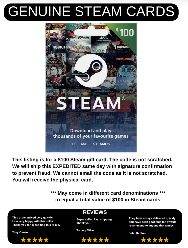 REST ASSURED ! SHIPS EXPEDITED FROM USA TODAY WITH TRACKING NUMBER ! ****** Our STEAM Cards are Authentic and Genuine USA SEALED & INSPECTED Direct from the Manufacturer ****** This listing is for a $100 Steam gift card. The code is not scratched. We will ship this today expedited with signature confirmation to prevent fraud. We can not email the code as it is authentic and NOT scratched. You will receive the physical card. May come in different card denominations to equal a total value of $100 in STEAM cards.