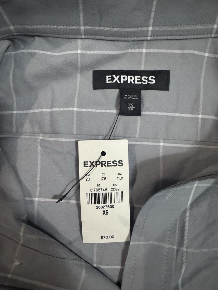 This brand new Express Men's Dress Shirt in Gray, size extra small, is perfect for both casual and business occasions. Made from comfortable cotton, this shirt features a collared neckline, button closure, and long sleeves with a barrel cuff style. The modern solid gray color and button accents add a stylish touch to this versatile garment, which is machine washable for easy care. Showcasing the quality and style of the Express brand, this dress shirt is a must-have addition to any man's wardrobe.