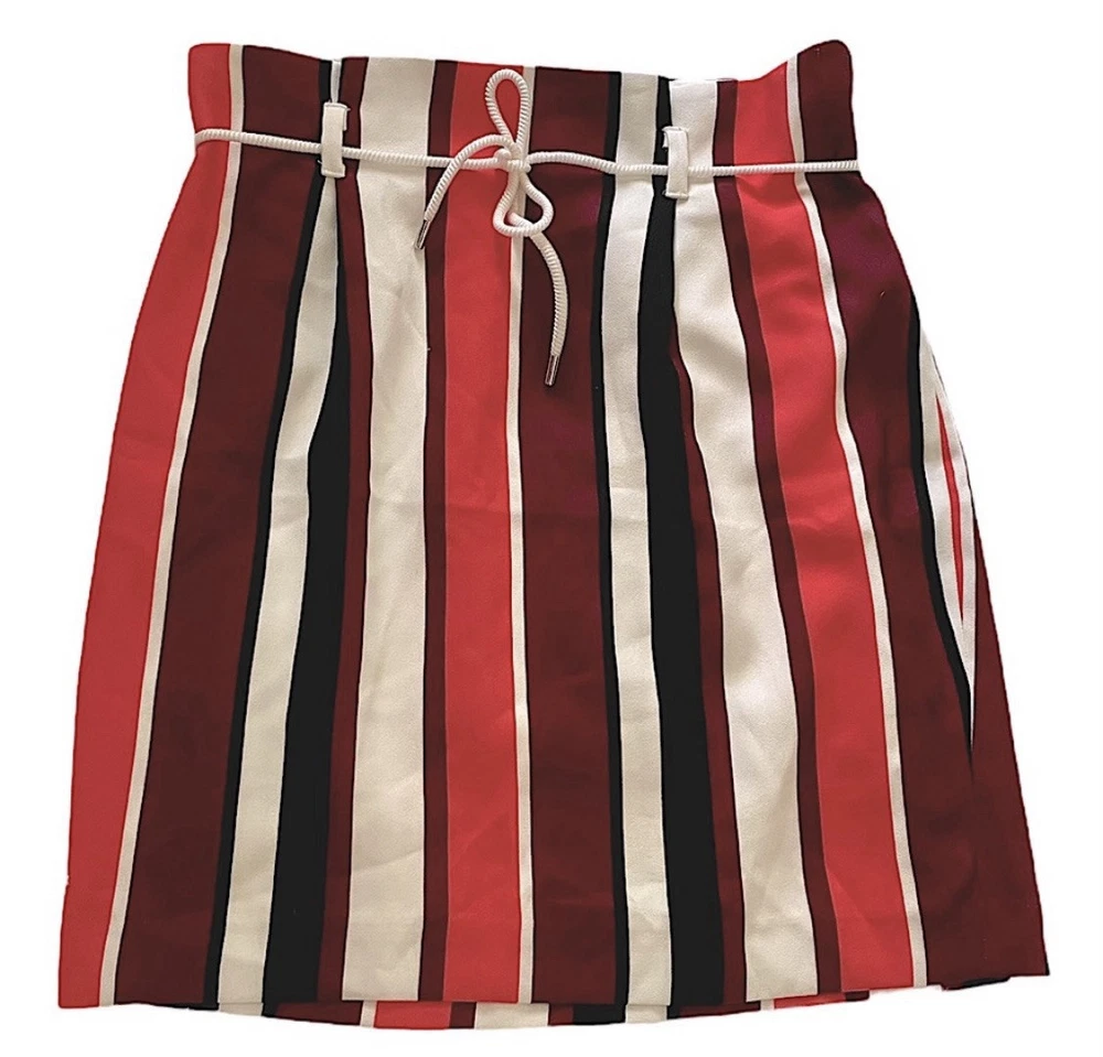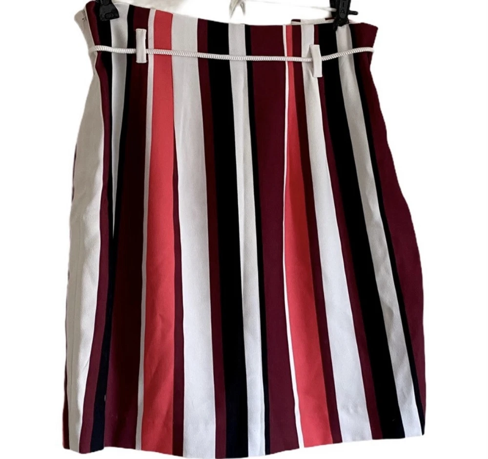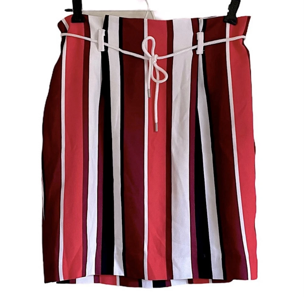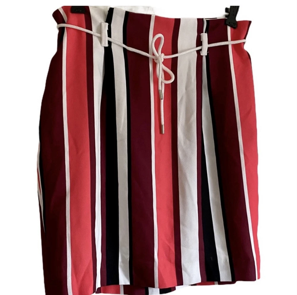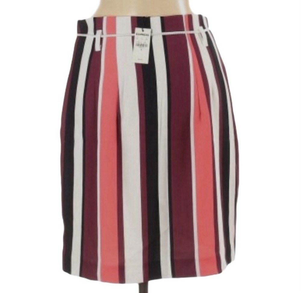 Pretty colored Express striped mini skirt with belt loops, lining & removable drawstring. You can use another belt of your choice. NWT Side zipper closure Coral - pink, burgundy, black, white Measurements: Waist: 31” Flat lay waist 15.5” Length: 20”