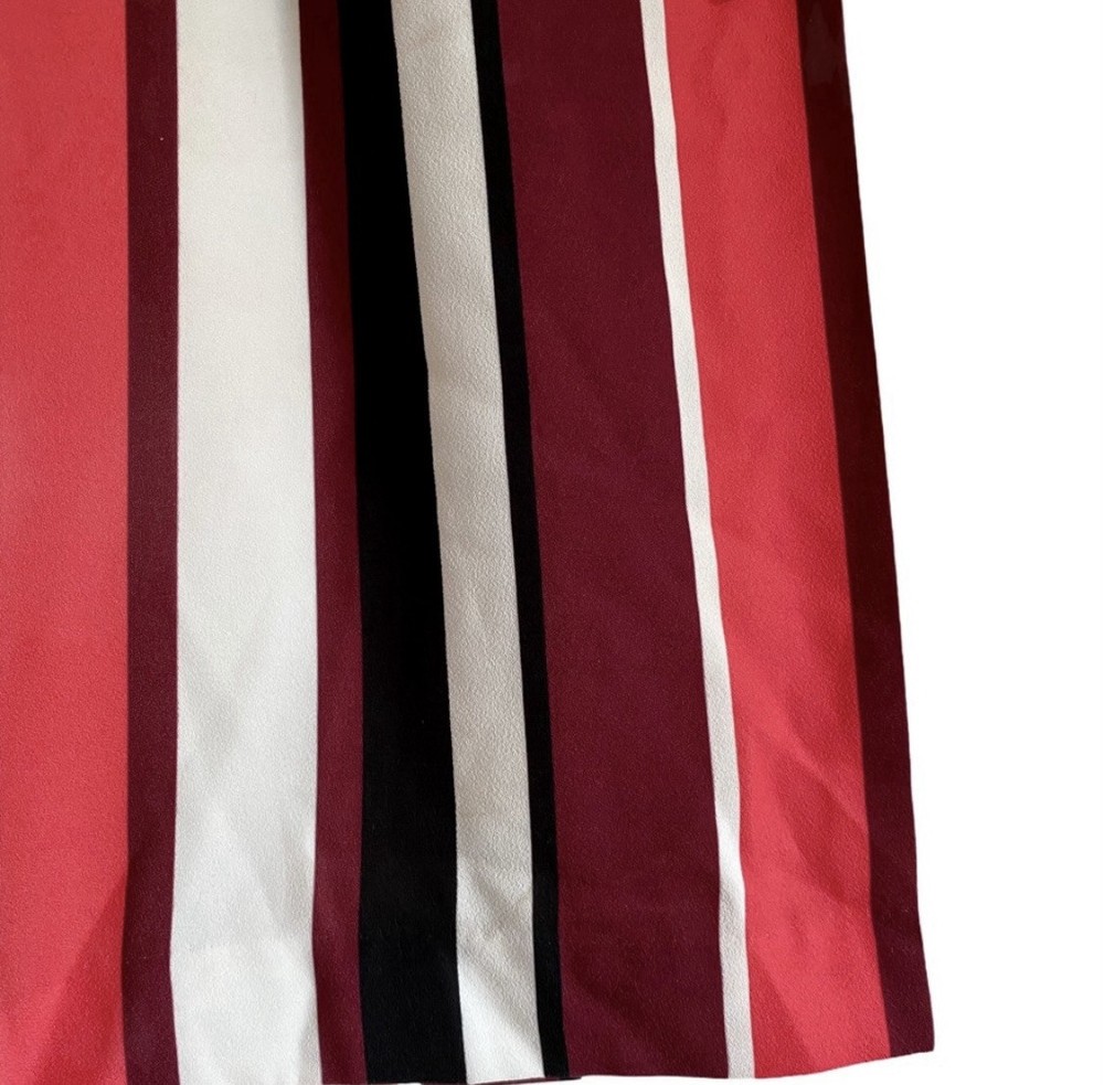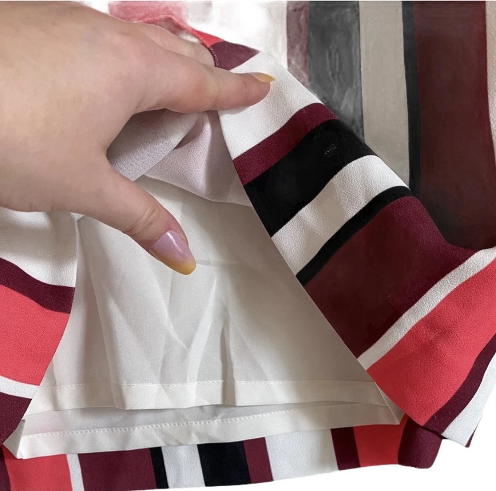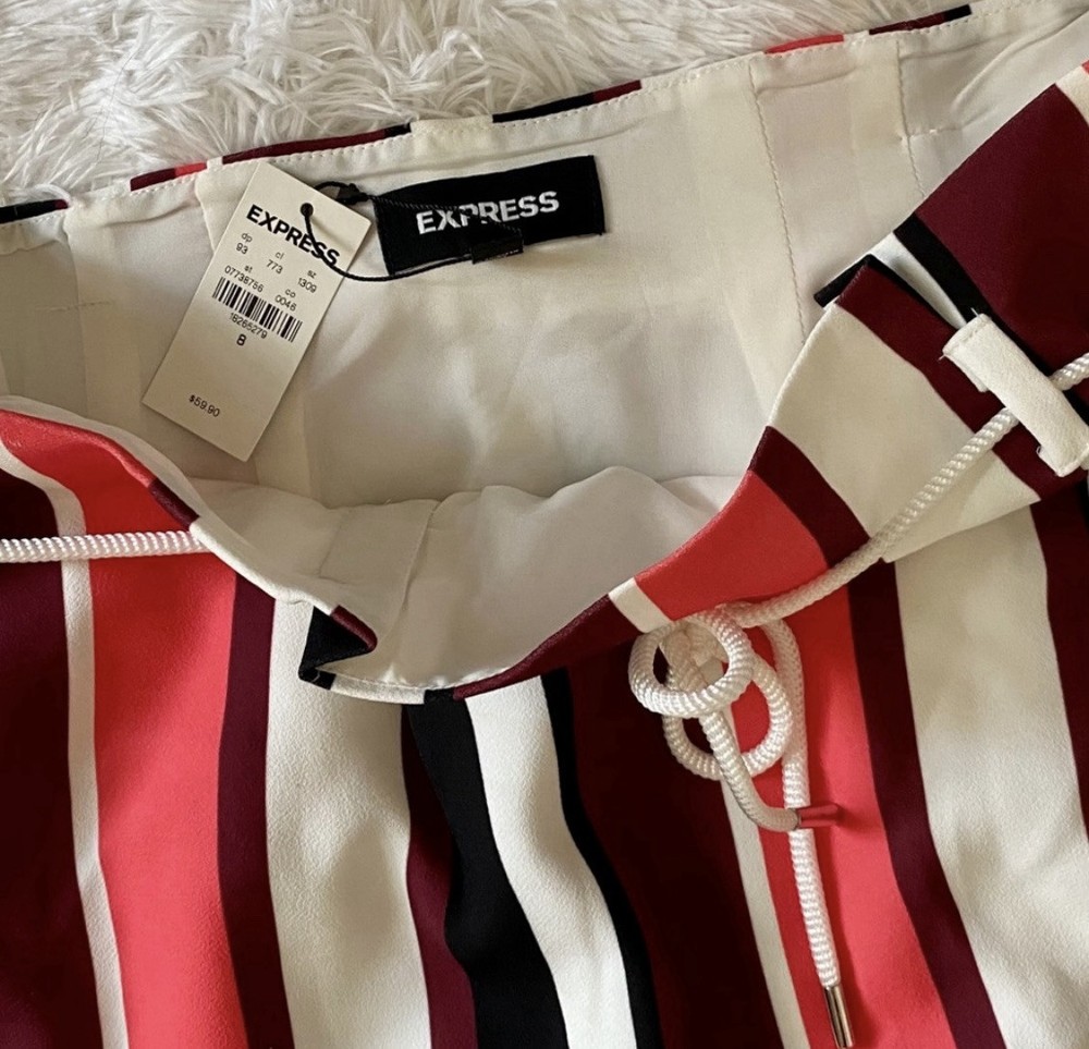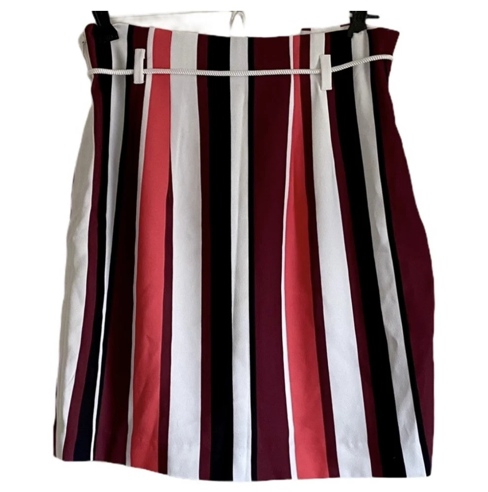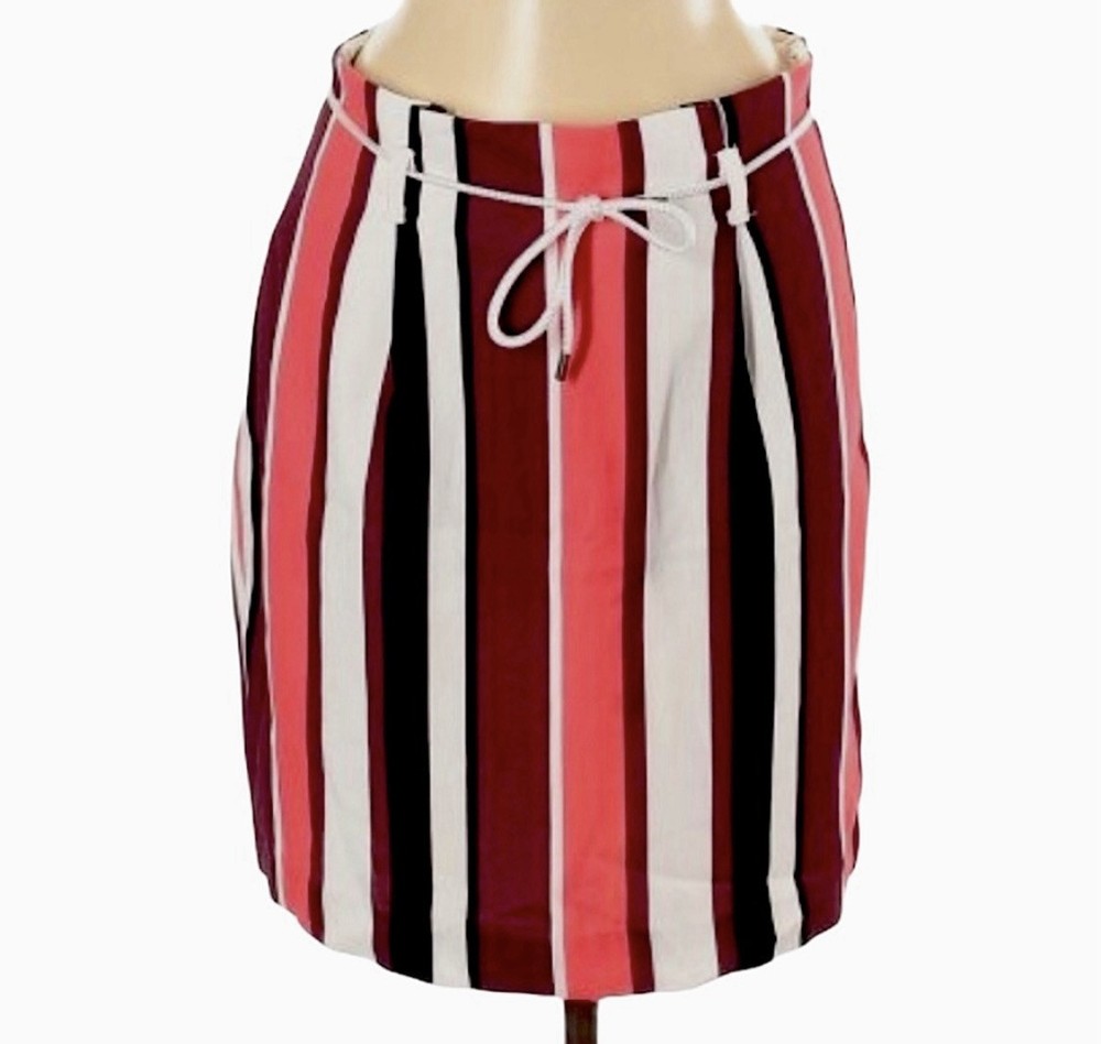 Pretty colored Express striped mini skirt with belt loops, lining & removable drawstring. You can use another belt of your choice. NWT Side zipper closure Coral - pink, burgundy, black, white Measurements: Waist: 31” Flat lay waist 15.5” Length: 20”
