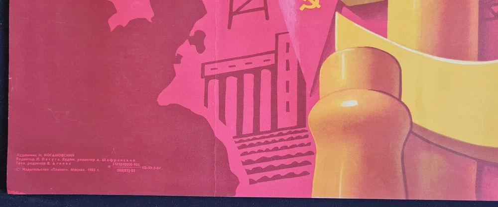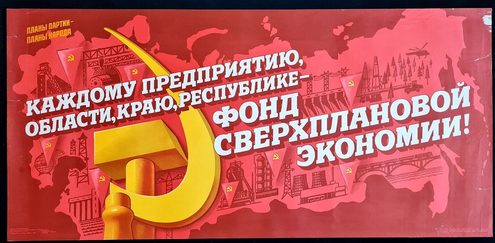 - Origianl slogan on the poster: КАЖДОМУ ПРЕДПРИЯТИЮ, ОБЛАСТИ, КРАЮ, РЕУСПУБЛИКЕ - ФОНД СВЕРХПЛАНОВОЙ ЭКОНОМИИ! Literally English translation of the main slogan: FOR EVERY ENTERPRISE, REGION, TERRITORY, REPUBLIC - THE FUND OF THE EXTRA-PLANNED ECONOMY! border-spacing POSTER ARTIST: KOGANOVSKIY I. SUBJECT: ECONOMY, INDUSTRY PRINT YEAR: 1985 LANGUAGE: RUSSIAN PRINT RUN: 80.000 SIZE: 23" x 47" = CM: 59 x 120 PUBLISHED BY: "PLAKAT", MOSCOW CONDITION: ROLLED, NEAR TO GOOD - - - Listing and template services provided by inkFrog