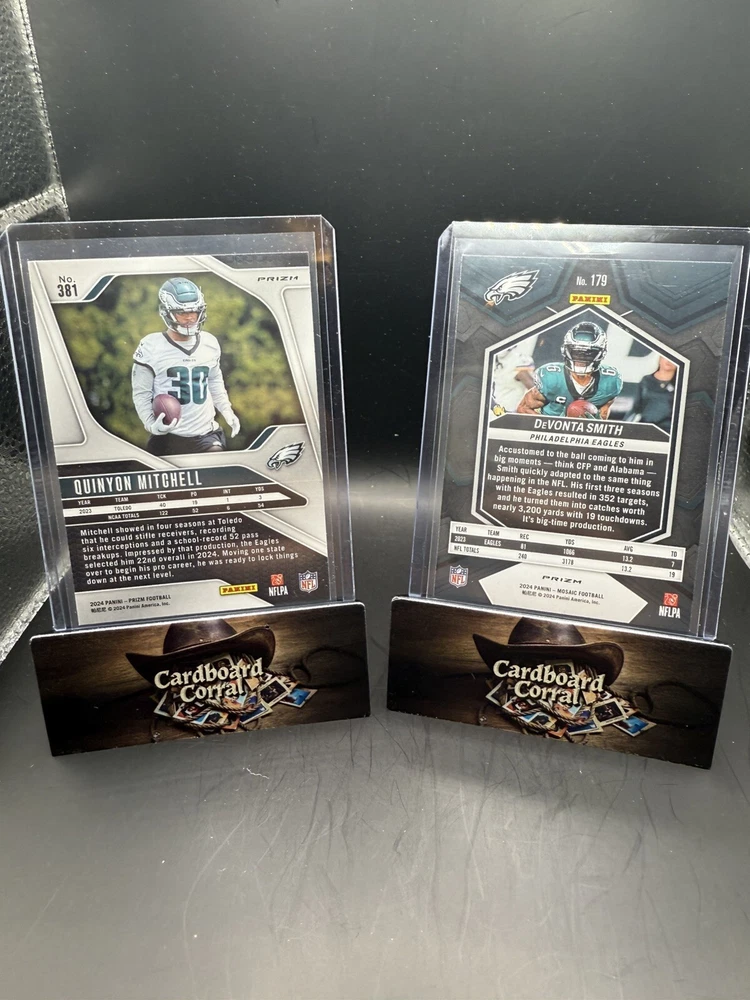 The product is a lot of 2 trading cards featuring Philadelphia Eagles players. It includes 2024Prizm Green Quentin Mitchell rookie card and 2024 Mosaic Silver Devonte Smith card. These cards are likely part of a sports trading card collection, specifically focusing on football players from the Philadelphia Eagles team. The Prizm Green Quentin Mitchell cards are rookie cards, indicating they feature a new player in their first year in the league, while the Mosaic Silver Devonte Smith cards likely showcase a standout player from the team.