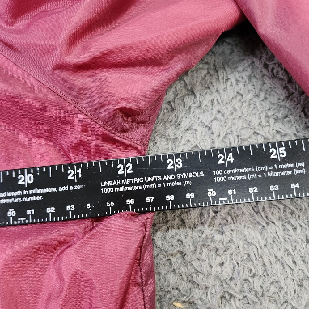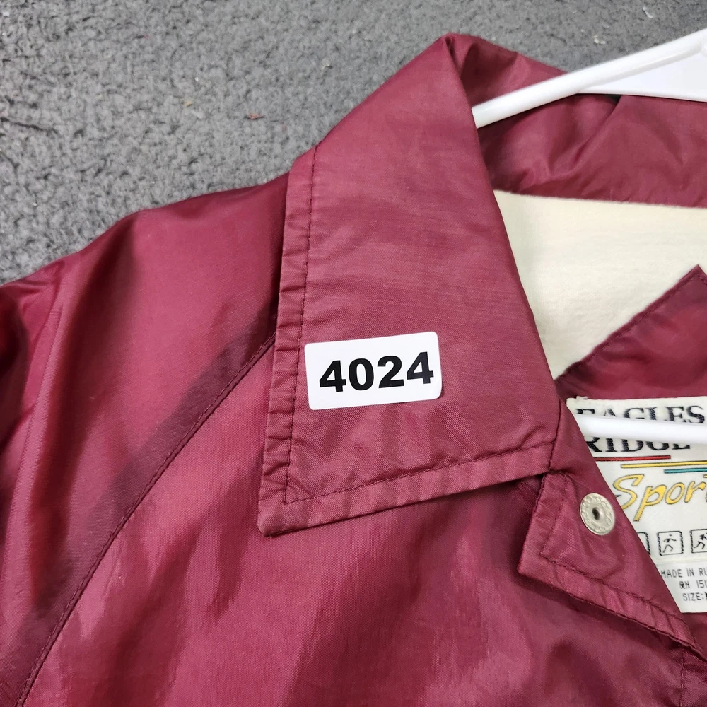Brand: Eagles Ridge (Sport line). Style: Mens lightweight windbreaker jacket with snap-front closure and classic collared neckline. Color: Solid red / burgundy tone. Size: Mens Medium (size M on interior neck tag). Material: Nylon shell with soft light-colored lining; exact fiber content tag not visible in photos. Country of origin: Made in Russia (interior tag marked Made in Russia RN 15101). Design details: Point collar, front snap placket with matching snaps, elastic cuffs, straight hem with slight elastic, and two slanted front hand pockets. Branding and accents: Eagles Ridge Sport woven neck label with multicolor stripe graphic, sport icon border, and secondary size/country tag at the neckline. Features and use: Lined, lightweight snap-front windbreaker suitable for casual everyday wear, layering in transitional seasons, and light outdoor activities.