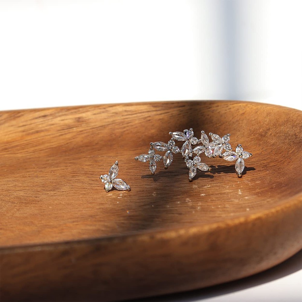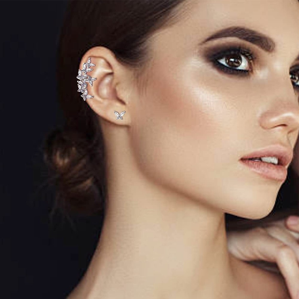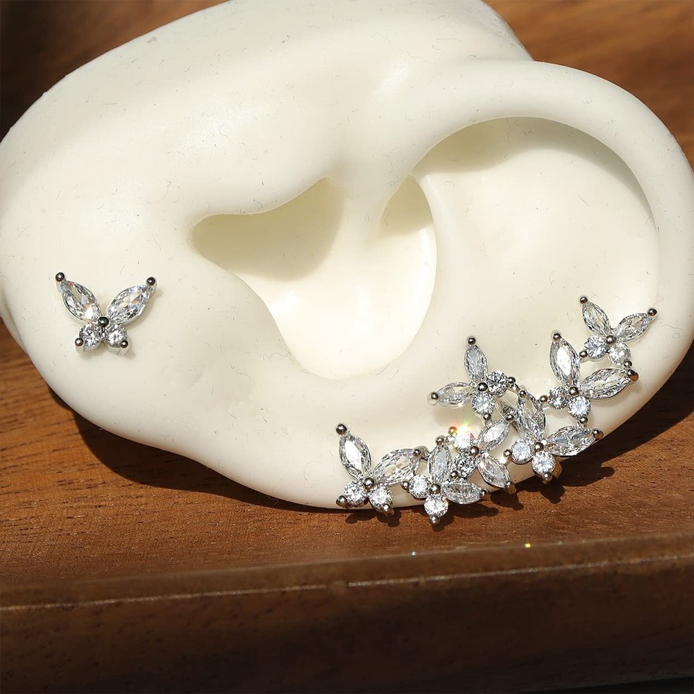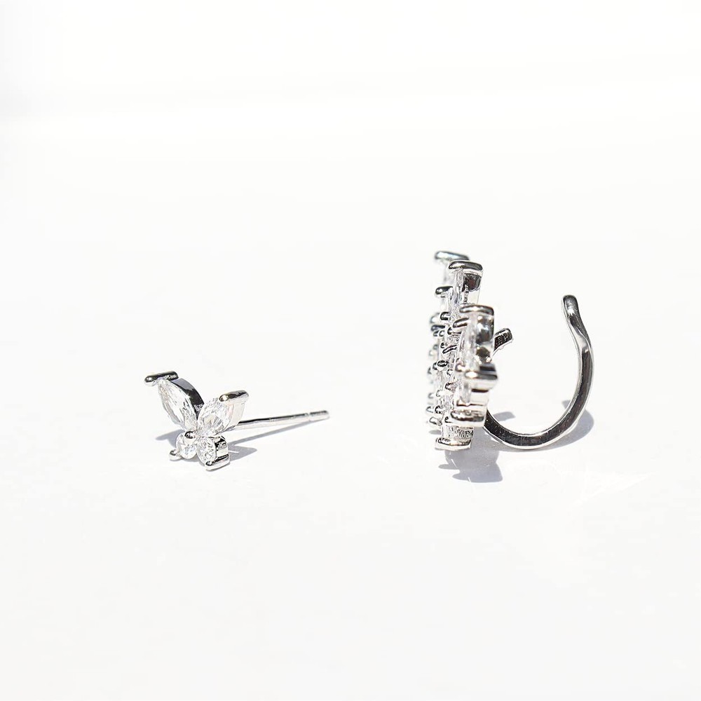 Description believes that life is like a piece of a sonata. Life may not always be smooth, and sometimes we go back to where we started, but luckily we always got someone to treasure. We have our parents who gave us life and raised us, our teachers and tutors who inspired and guided us to a better future, those family relatives and friends who have been accompanying and sharing with us. Lastly, we have ourselves who have been struggling in this intense world. Gems are attractive, not because of a luxury brand, but the story between you and them, the moment that delights and touches your soul, the moment your loved one takes it from the pocket to give you a surprise, those joyful times you wore it for a party or gathering. They are memories, guardians of your faith. They represent your preference and stands. Take a rest, have a coffee or tea, and admire jewelry changing color and reflection under lights. Our pieces of jewelry here are made with good craft and nice materials so that you can keep them longer, even lifelong. We also try to be friendly to the environment in purchasing raw materials, manufacturing, distributing, and choosing cooperation partners. looks forward to witnessing your every heartwarming moment. Thank you for being with us Stylish charming feminine helix earrings, one tiny little small silver white butterfly pierced ear stud and one no pierced climber cuff with seven beautiful fancy butterflies, extremely standout and cool to wear the set on one single ear . Fancy fairy style, high quality cubic zirconia, vivid shine and brilliant sparkles, beautiful and dazzling under spotlight and sunlight, perfect for dating and party. White gold plated brass, fade-resistant, hypoallergenic, comfortable to wear, not easy falling, both cool and gentle, sweet, fitting casual and formal dressing. Gorgeous lovely stud earrings gifts for best friends, wife, mother, teacher on special days like Birthday, Celebration Ceremony, Thanksgiving, Anniversary, Graduation, Easter, Mother’s Day, etc. Classy elegant push-back earrings that are worth keeping. Proper storage and regular cleaning can help the jewelry stay shiny, and long-lasting.