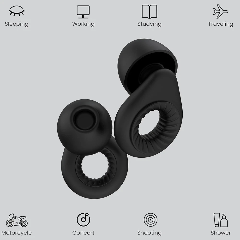 BRAND NEW PROFESSIONAL DESIGN - Soft touch silicone ear plugs for sleep noise with unique design and super comfortable, It provides the most natural and high-fidelity sound with noise reduced evenly. All the ear tips are made from food-grade silicone, which are skin-friendly for whole-day wearing. NOISE REDUCTION - These earplugs eliminate up to 30 decibels of noise, quieting the sound to a comfortable level. They are available in four different sizes (XS/S/M/L). Please test them out to get the right size for your ear canal for maximum noise blocking and comfort. STYLISH COMFORT - Earplugs are ergonomically designed, Even if you lie on your side or turn over, The sleeping ear plugs not easy to slip off while effectively reducing the impact of sound waves on the eardrum. It look like a fashionable accessory while protecting your hearing. MULTI-PURPOSE - Enjoy listening in concerts, rave, motorcycle, work, rave, clubs, festivals, sports events, airplane, train and other noisy environments with these earplugs that filter background noises. Or use them to enjoy peace and quiet at home, work or travel. SAFE REUSABLE - The earplugs are made of super soft food-grade silicone material, which do not stick to dust and have a delicate touch, with good elasticity and memory function, and the ear plugs for sleeping noise cancelling can be pulled at will without deformation. THANK YOU