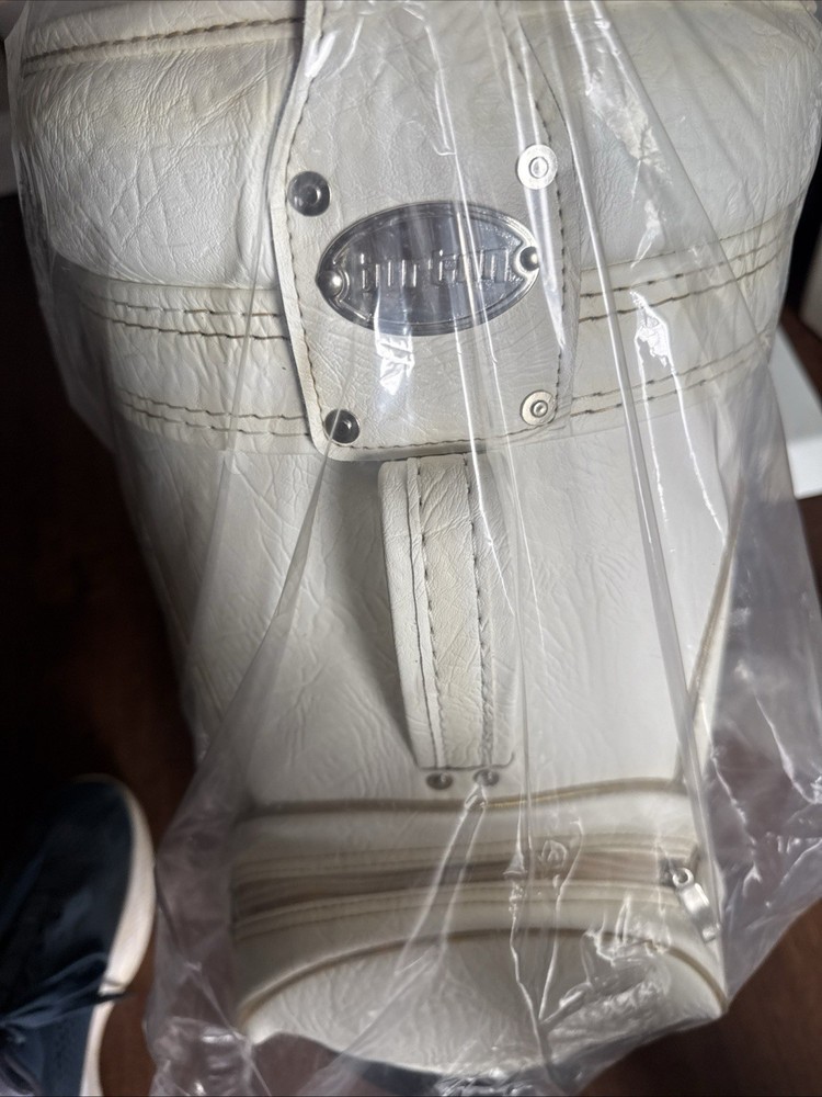 The Early 2000 New Leather Burton Den Caddy is a vintage men's carry bag made by the brand Burton. It features a white leather exterior with a zip closure and two pockets. Made in China, this unique piece combines classic design with high-quality materials, making it a stylish and functional choice for any golfer looking for a timeless accessory.