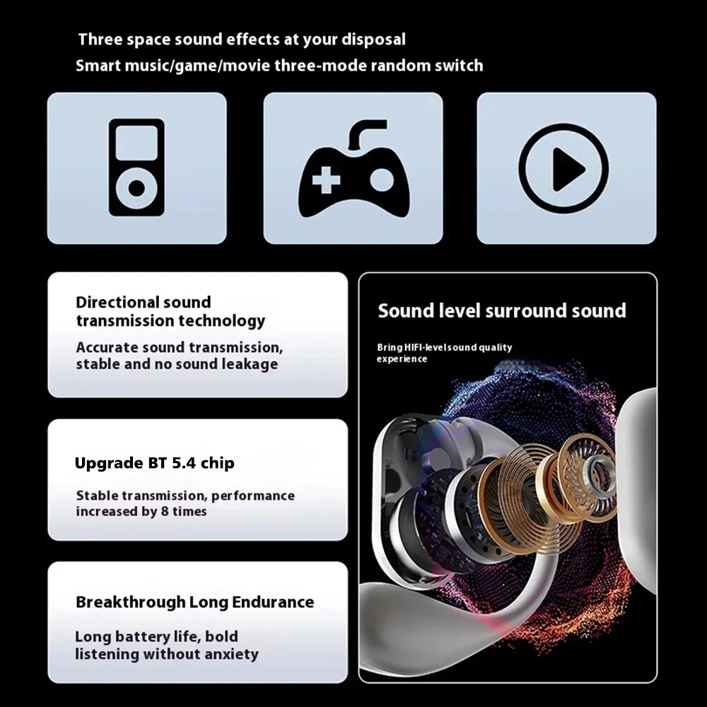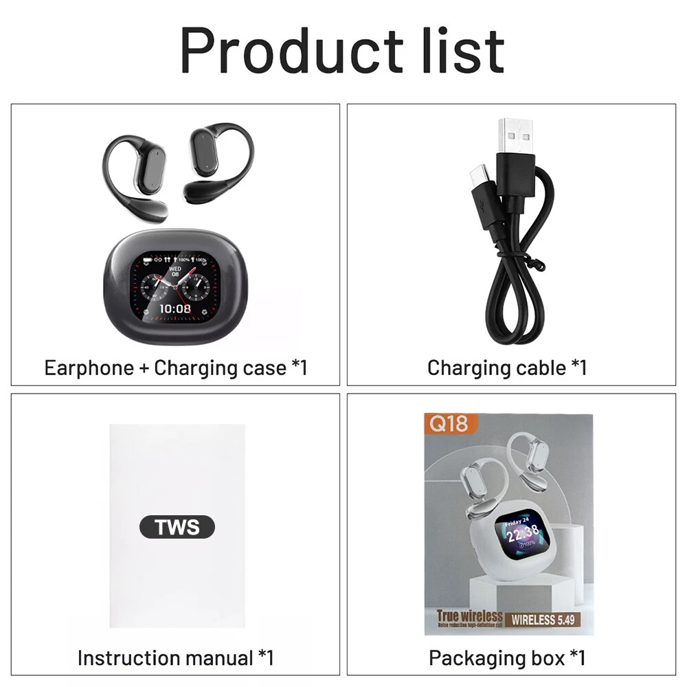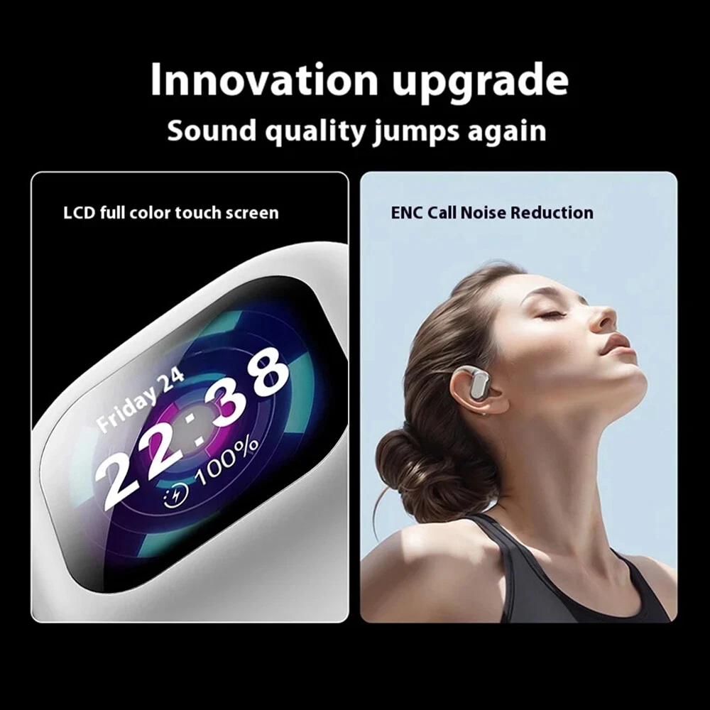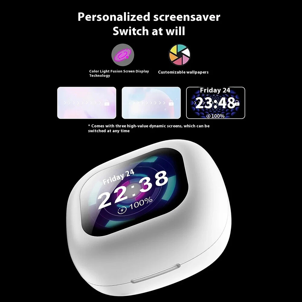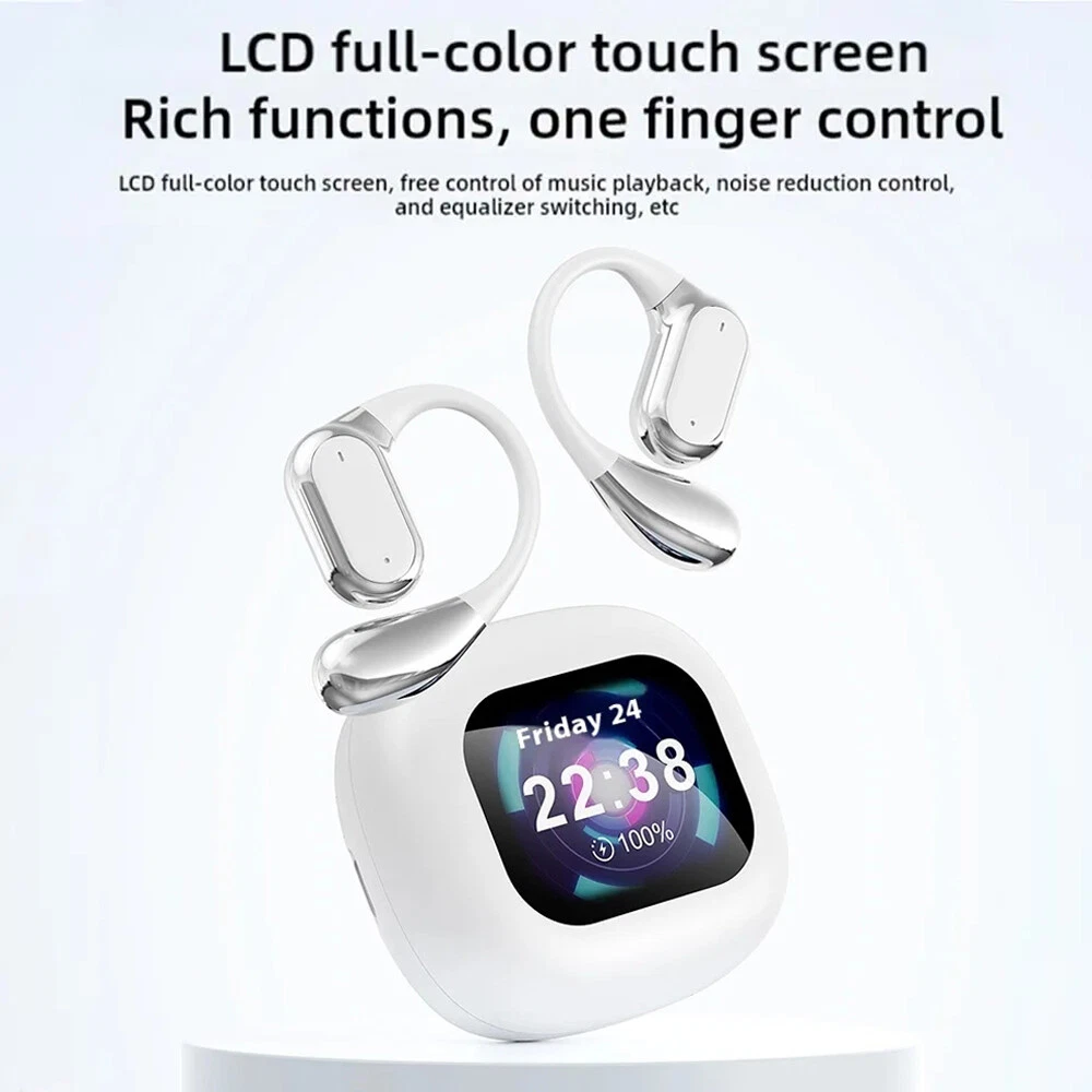 Features: ✅ HiFi sound quality, composite diaphragm moving coil unit. ✅ LCD full-colour display, one-finger control with rich functions. ✅ Free control of music playback, noise reduction control, equaliser switching and so on. ✅ Noise cancellation mode, reduce external noise interference. ✅ Low latency, more accurate when playing games. ✅ High-speed Bluetooth 5.4 seconds connection No delay. ✅ Suspended headphones, comfortable to wear, zero-feeling wearing, immersive experience. ✅ Intuitive touch function, accurate recognition, anti-mistake touch. ✅ One button operation, easy to operate various functions. ✅ High-precision speakers, audio-grade surround sound. ✅ 16 languages, English/Russian/Spanish/German/French/Japanese/Korean etc. Specification: * Product Name: bluetooth headset *Headset type: on-ear *Noise cancellation function: ENC *Bluetooth protocol: HFP, A2DP, HSP, AVRCP *Audio decoding:AAC,SBC *Bluetooth version: 5.4 *Transmission distance: ≥10 metres (without obstacles) *Speaker specifications: ΦF12mm composite film copper ring *LCD screen: 2 inch touch screen *Waterproof rating: IPX 5 *Working time: 8 hours *With charging case: 36 hours *Input voltage: DC5V1A *Headset battery capacity: 40mAh *Charging compartment battery capacity: 500mAh *Charging port: Type-c *Charging time: 1.5 hours *Product material: ABS *Product colour: black/white/skin colour Package List: 2*Bluetooth headset (left and right ear) 1*Charging compartment 1*User Manual 1*Type-c cable Attention: 1. Please allow 1cm error due to manual measurement! 2. Due to different display resolution, please take into account the slight colour difference! On Nov 18, 2024 at 01:13:23 PST, seller added the following information: