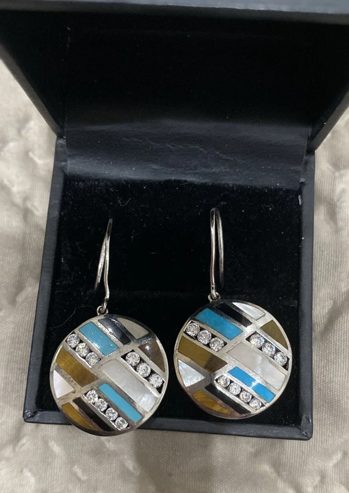 Add a touch of elegance to your outfit with these beautiful multi-stone earrings. The geometric inlay stones include natural black onyx, turquoise, white opal, and tiger eye, all genuine stones set in sterling silver with crystal accents. The intricate inlaid design and handcrafted details make them a unique addition to any collection. Perfect for a night out or special occasion, these dangle/drop earrings are a must-have for any fashion-forward woman. The sterling silver stamped 925 metal ensures high quality and durability. Make a statement with these stunning earrings that showcase the beauty of natural stones.