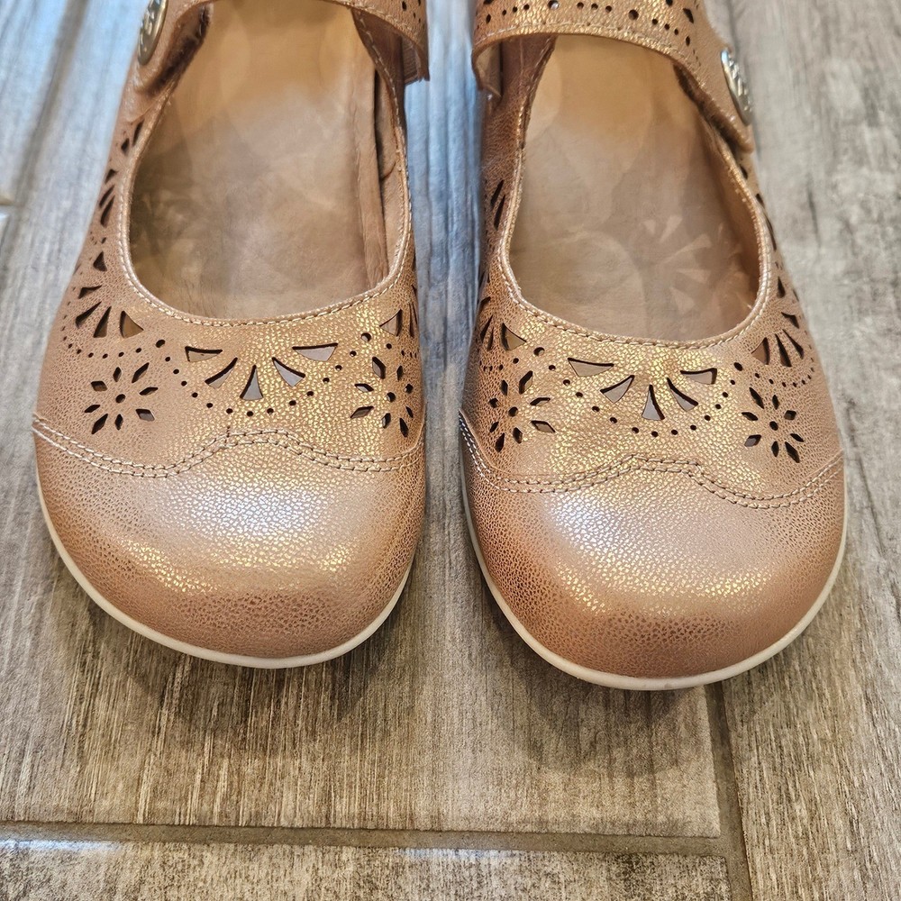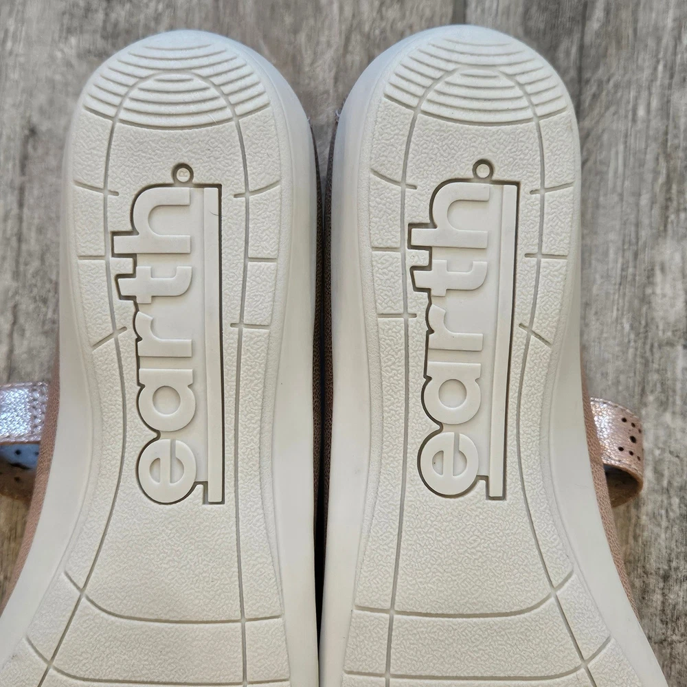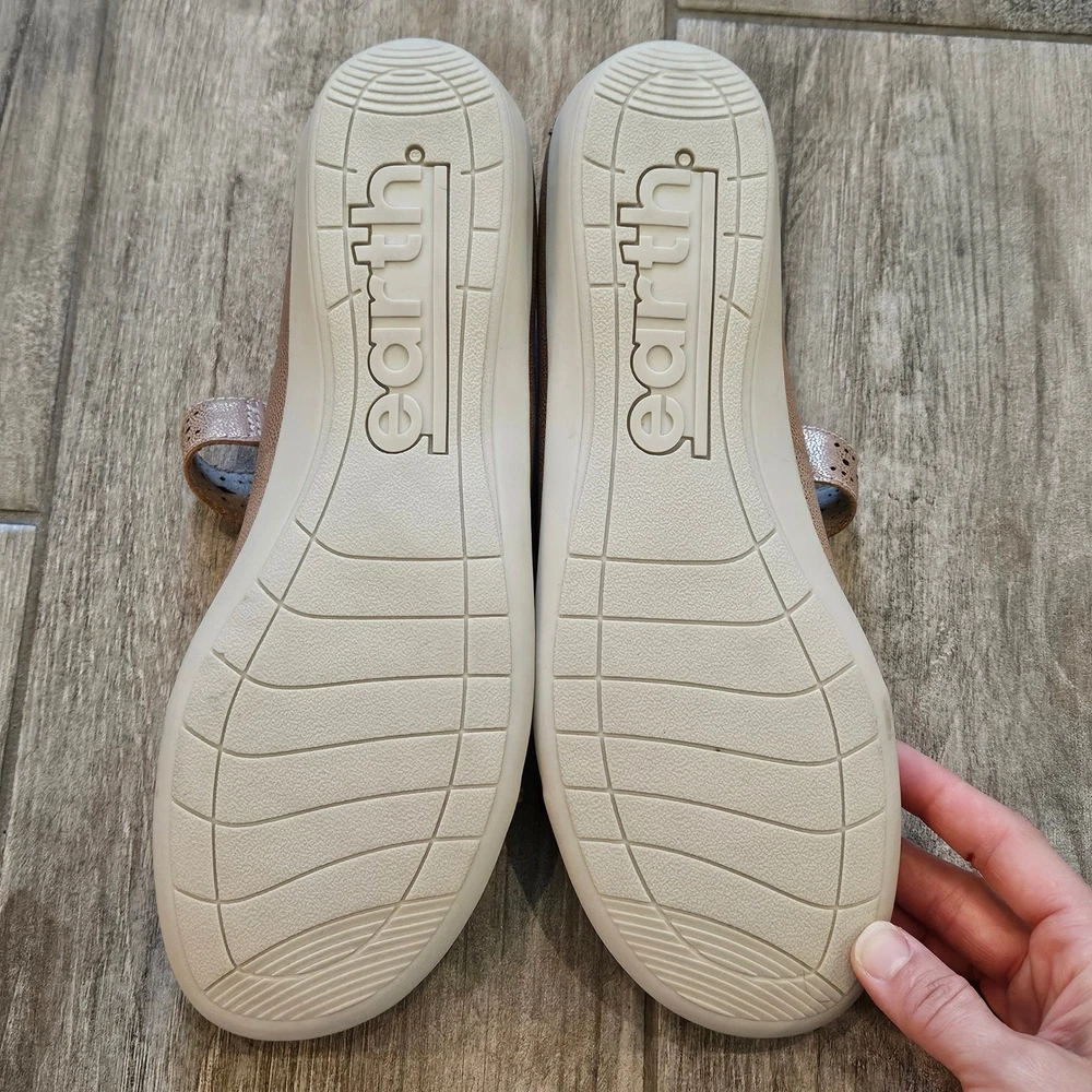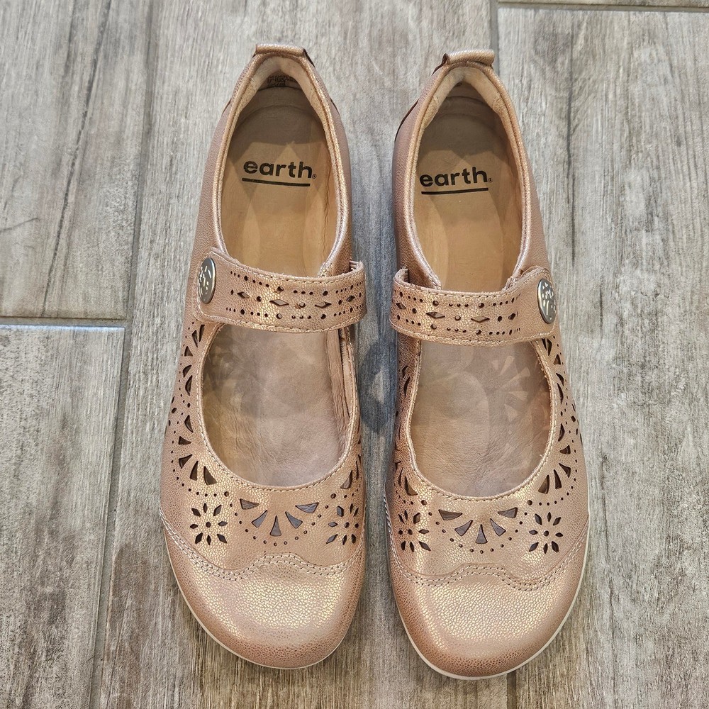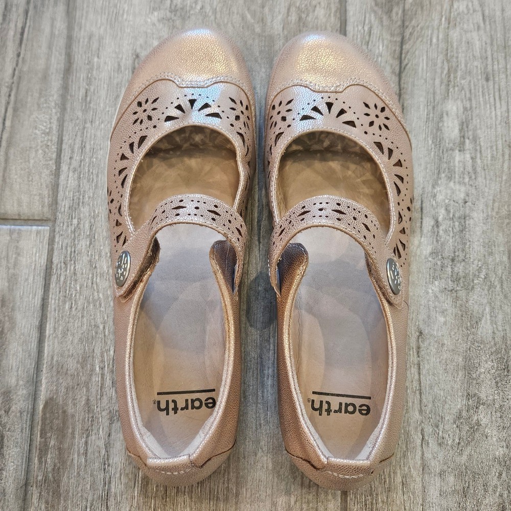 Earth Alder Adel Mary Jane flats in a stunning rose gold metallic leather finish. These comfortable shoes feature intricate laser-cut floral perforations and scalloped edges, adding a feminine touch to a classic silhouette. Designed with a hook-and-loop adjustable strap for a secure fit, a cushioned leather sock lining for all-day support, and a flexible rubber outsole. The metallic sheen offers a versatile look that transitions easily from casual outings to dressier occasions. Brand: Earth Model: Alder Adel Color: Nude Metallic / Rose Gold Material: Leather Upper, Leather Sock Lining Closure: Hook & Loop Strap Style: Mary Jane Flat Features: Laser-cut details, Scalloped trim, Cushioned footbed Outsole: Flexible Rubber Keywords: Boho, Cottagecore, Metallic, Comfort, Orthopedic, Laser Cut, Floral, Rose Gold, Shimmer, Casual, Professional, Travel Shoes, Spring, Summer