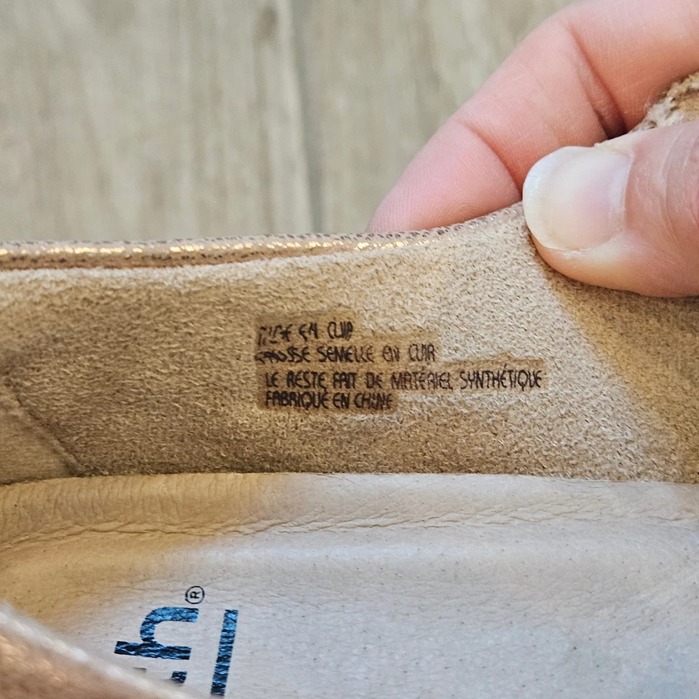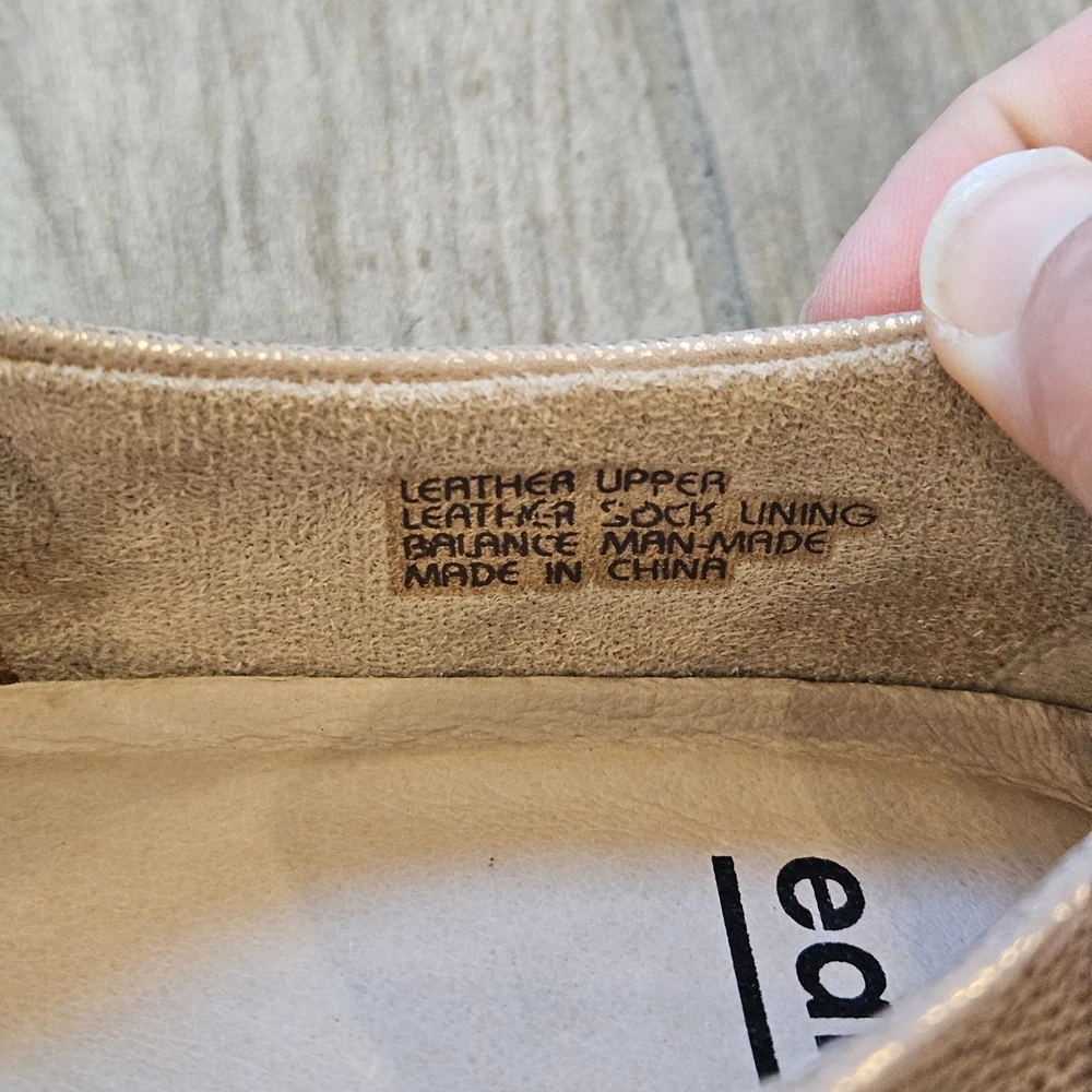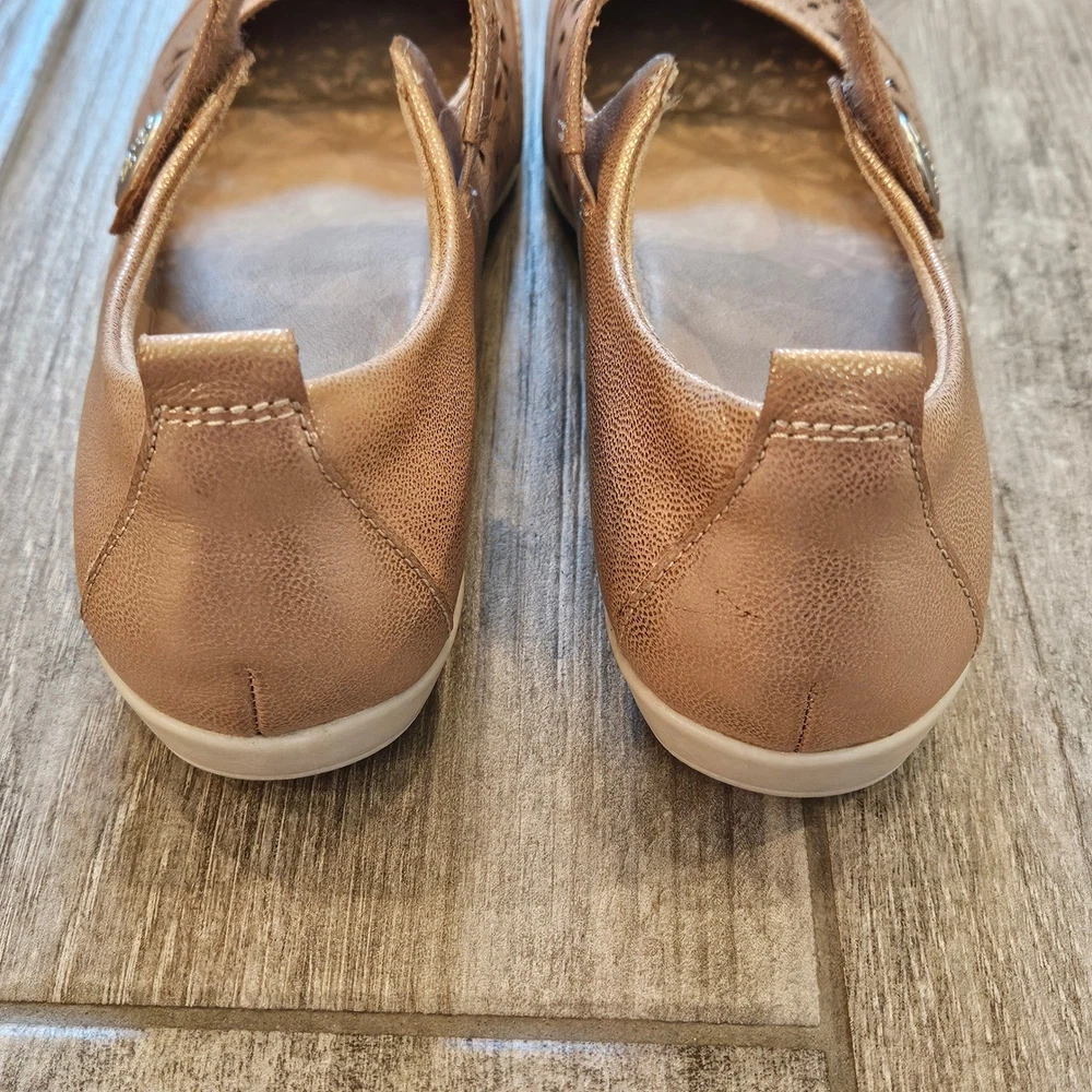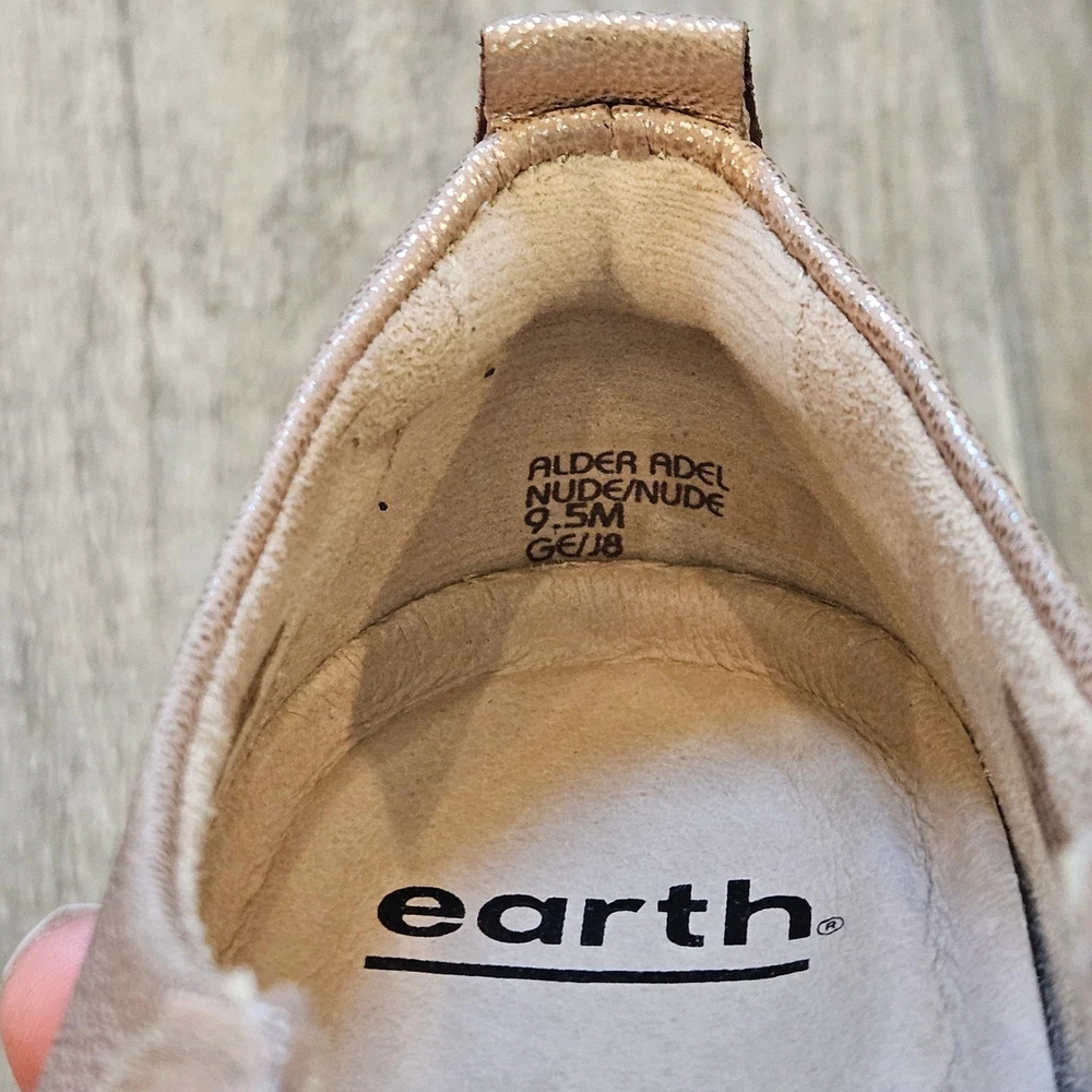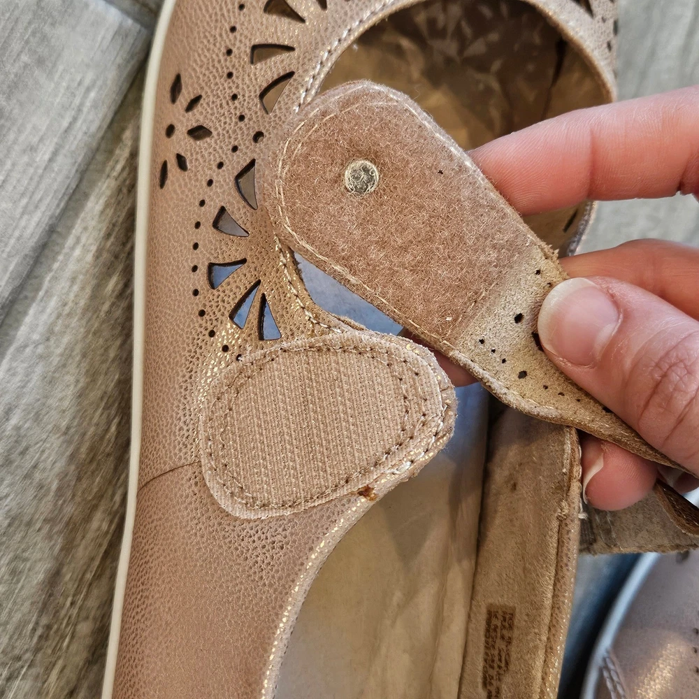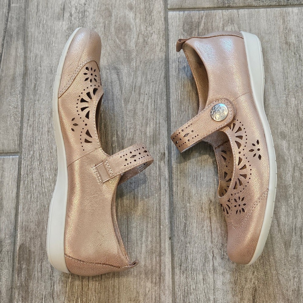Earth Alder Adel Mary Jane flats in a stunning rose gold metallic leather finish. These comfortable shoes feature intricate laser-cut floral perforations and scalloped edges, adding a feminine touch to a classic silhouette. Designed with a hook-and-loop adjustable strap for a secure fit, a cushioned leather sock lining for all-day support, and a flexible rubber outsole. The metallic sheen offers a versatile look that transitions easily from casual outings to dressier occasions. Brand: Earth Model: Alder Adel Color: Nude Metallic / Rose Gold Material: Leather Upper, Leather Sock Lining Closure: Hook & Loop Strap Style: Mary Jane Flat Features: Laser-cut details, Scalloped trim, Cushioned footbed Outsole: Flexible Rubber Keywords: Boho, Cottagecore, Metallic, Comfort, Orthopedic, Laser Cut, Floral, Rose Gold, Shimmer, Casual, Professional, Travel Shoes, Spring, Summer