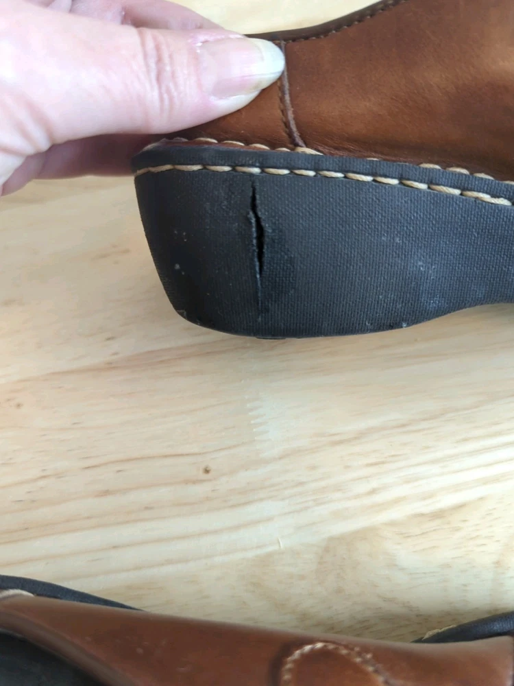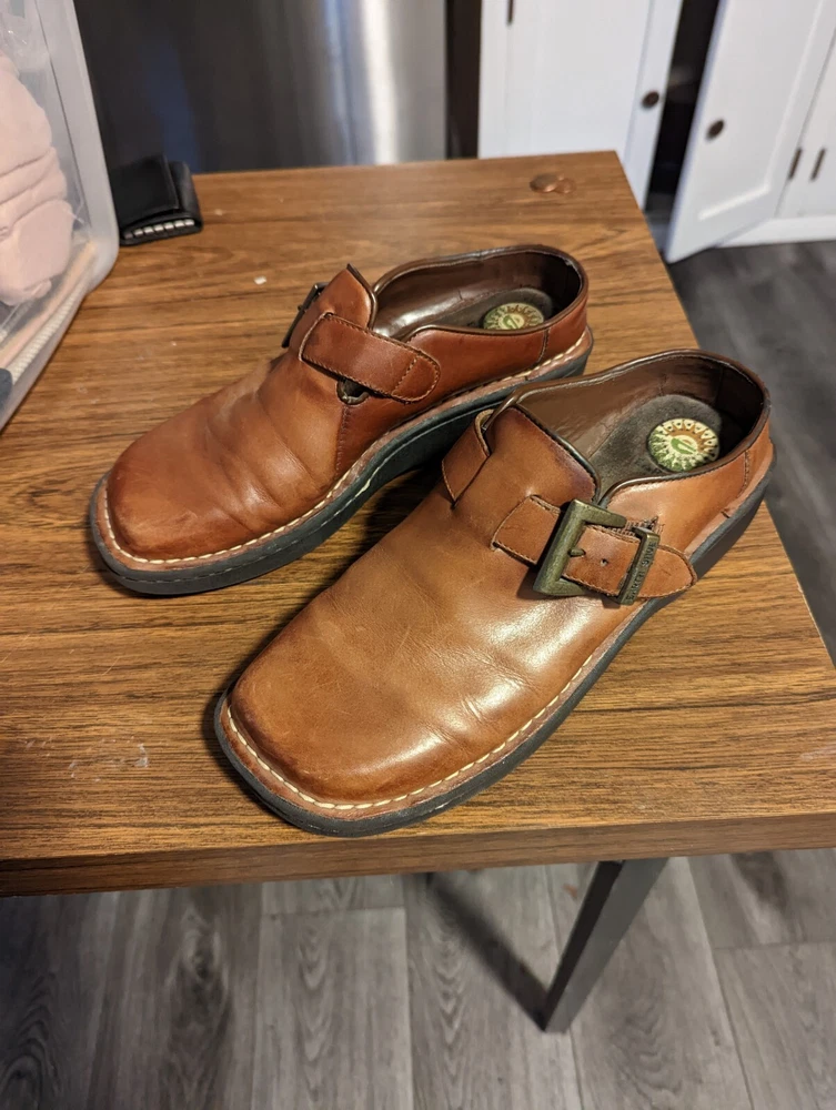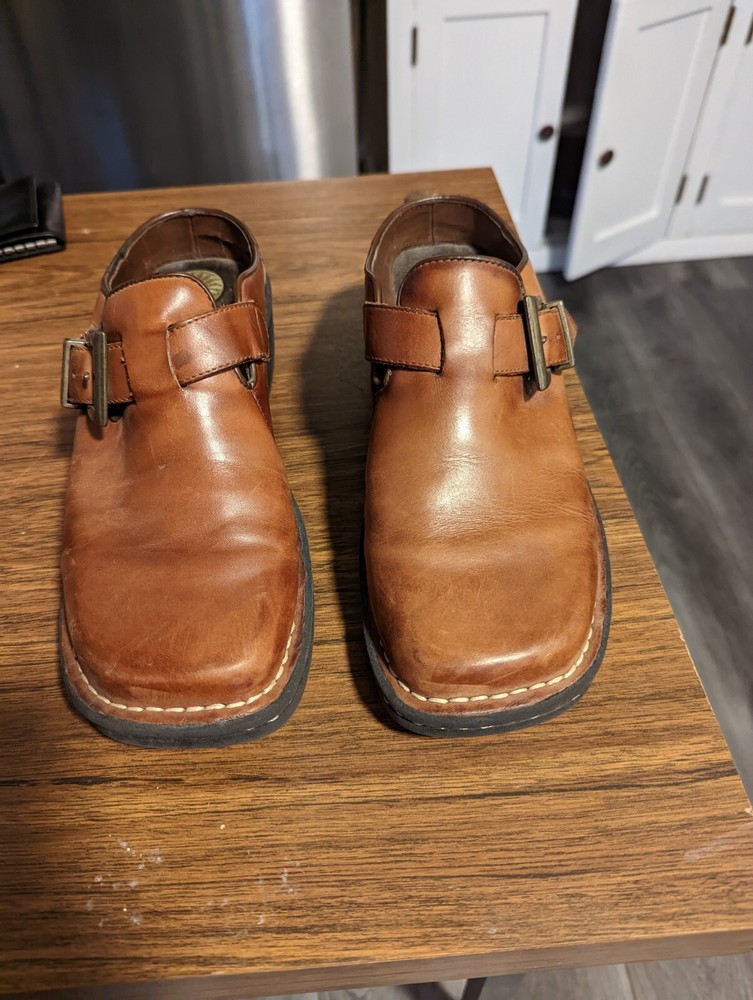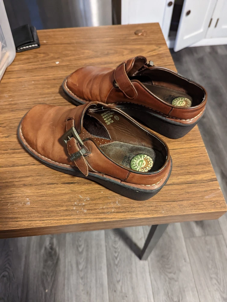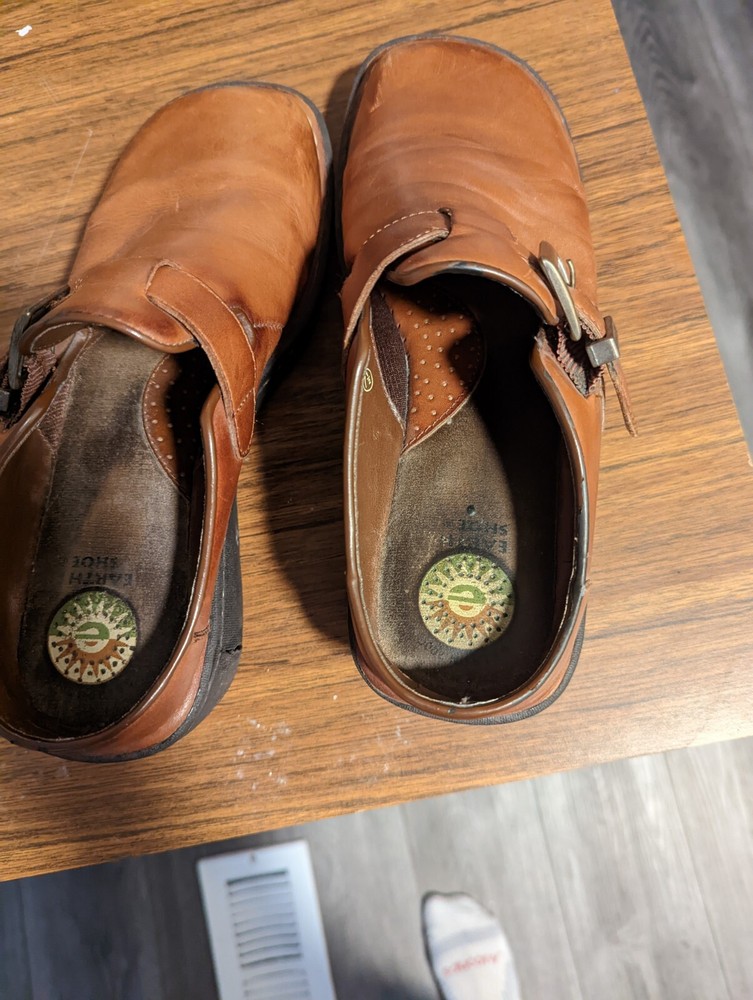 The elastic on one buckle is cracking on one shoe. Slit in heel shown in pics. Step into comfort and style with these Earth Shoe Hickory clog mules. Crafted from high-quality leather, these shoes feature a buckle accent and a square toe design. The low wedge heel provides a comfortable fit, while the cushioned insole and leather lining ensure all-day wearability. These brown clogs have a retro hippie vibe that's perfect for any casual occasion. The standard shoe width and US size 7.5 make them a great addition to any wardrobe. Whether you're going for a bohemian look or simply want to add some comfort to your day, these Earth Shoe Hickory clogs are the perfect choice.