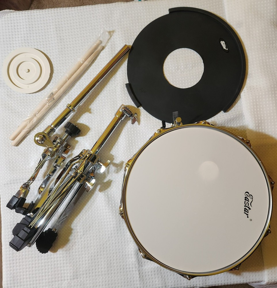 Eastar Snare Drum Set with Mute Practice Pad Student Beginner Kit, Stand, Sticks with Storage Carrying Bag Starry Blue New Open Box Great Condition however carrying case has a couple light white spots but no holes.