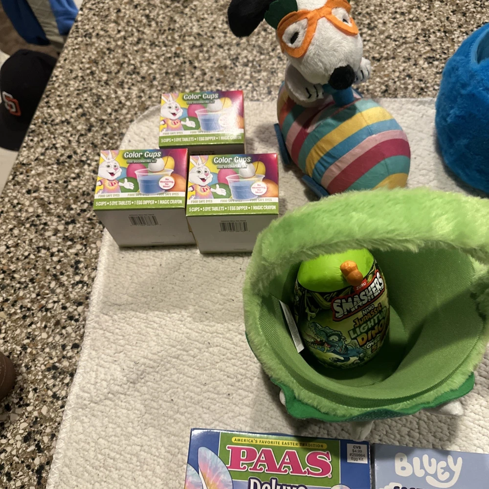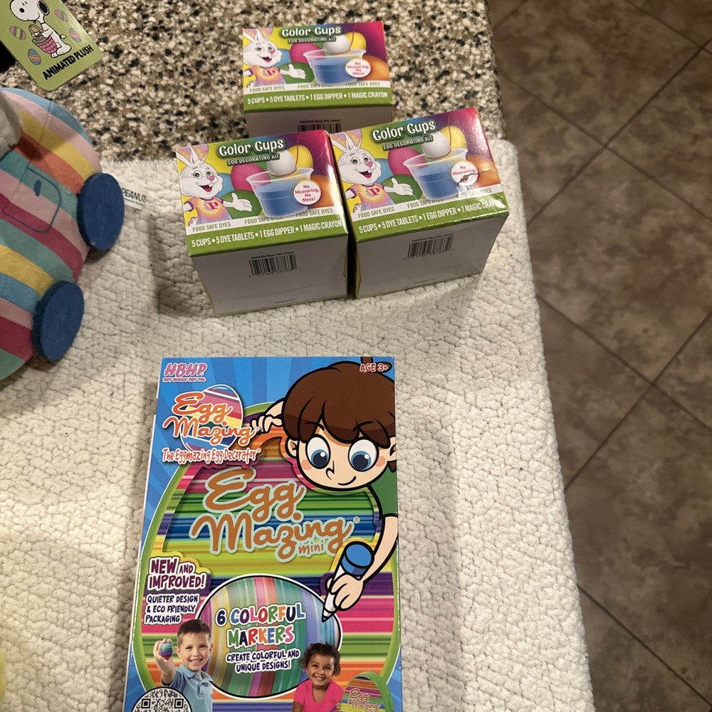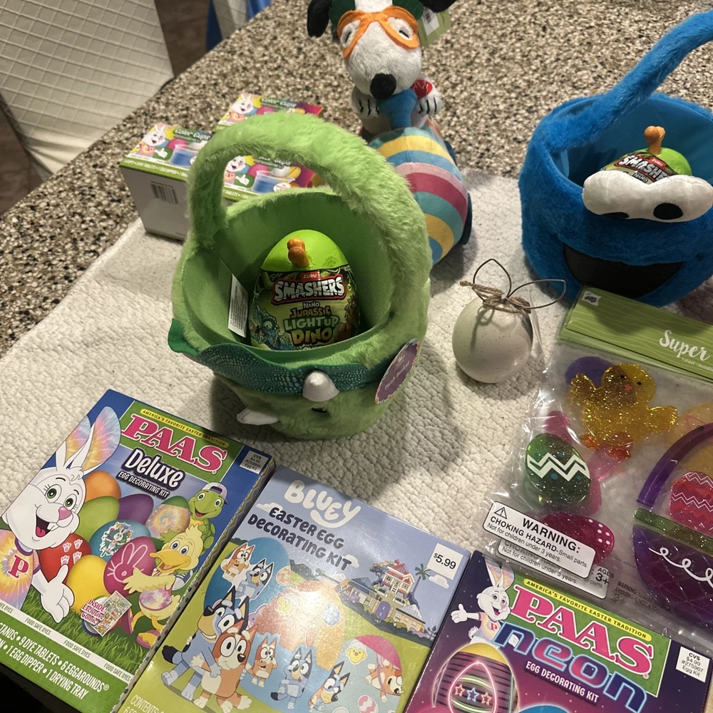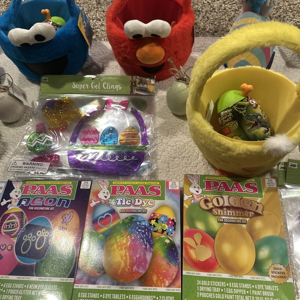32 piece Easter bundle Steal!!! 4 Baskets(Elmo, and Cookie Monster included,)2 Snoopy Animated Easter Plush Stuffed Animal in Egg Car toy decorations for Mom and 2 ceramic eggs. 6 egg colored cups, 6 over sized easter, decorations for windows, and one egg marker machine to decorate the eggs, no need to go shopping and deal with lines and headaches and impatient rude people grab this why it’s still here! You wanna see deals like the ones “tradingnerd has deals for you on eBay !!!!!
