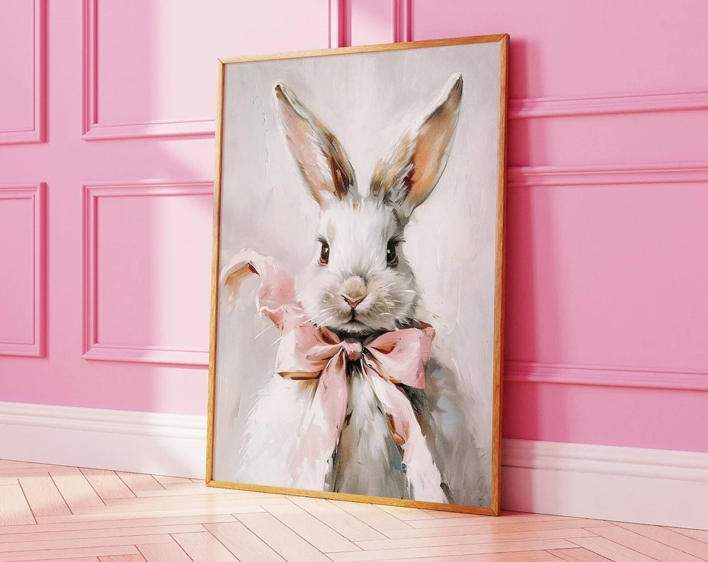 Easter Bunny Rabbit With Pink Bow Nursery Decor Grandmillenial Prints Grandma Chic Poster Trendy Coquette College Room Spring Aesthetic Material: Premium luster photo paper Print type: Inkjet printing One side printed + The finish provides the highest possible resolution and color saturation + Lasts up to 200 years in color and 400 years in black-and-white + Printed on high-quality resin-coated photo base paper medium + Posters can be hung with double-sided tape, tacks, or framed + Hand washing with a gentle cry cloth is recommended for extended durability I will hand select the best choice of paper for your chosen design to ensure top quality results for a beautiful, bright and luxurious print. All prints are sealed in cellophane slips for protection during transportation, and are shipped in a protective cardboard envelope.