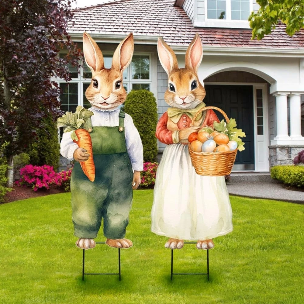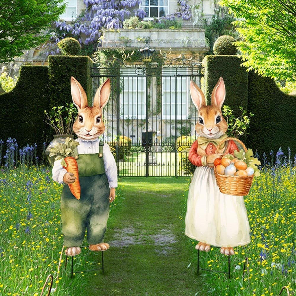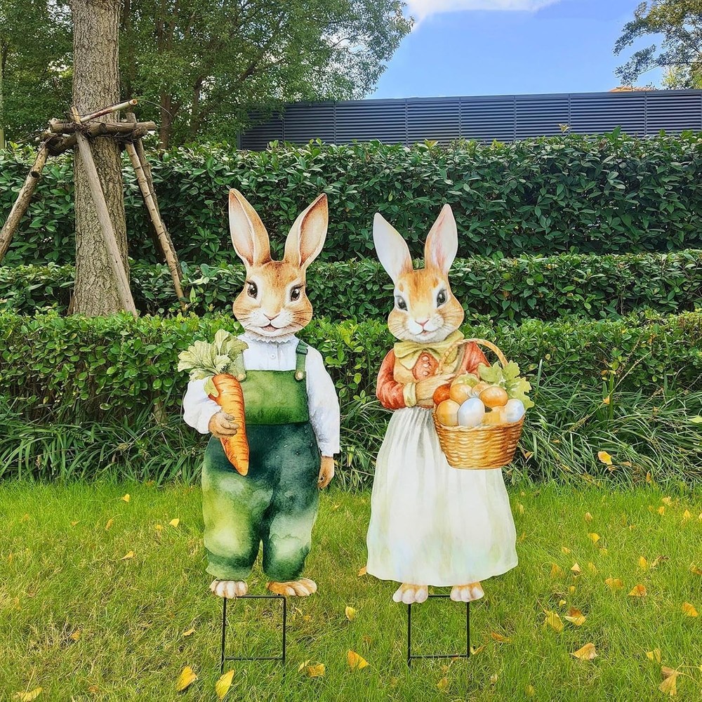 About this item PACKAGE INCLUDES: 2 pcs extra large metal Easter bunny yard decorations outdoor. Each vintage bunny is about 32 inches high. Please confirm the size before purchase. Not very big but stand stably due to the quality metal. Setting the festival mood for Easter and spring. HIGH-QUALITY: Our large Easter rabbits lawn decorations are made of premium metal. Sturdy and durable as Easter outdoor decorations. Waterproof and withstands weather well, no matter wind or rain. The colors are vibrant and not easy to fade. NEW DESIGN: These farmhouse rustic Easter rabbit yard signs are designed in vintage style with carrots and eggs. Both adults and kids will find these rabbits adorable and put a smile on their face. Make your Easter party impressed. EASY TO SET UP: Each bunny is made of 2 parts. Use the pre-assembled iron rods and screws to connect the parts together. Then simply insert the "H" metal stakes into each sign and press into the ground to display. Easily make a fun addition to your Easter decor. MULTI-USE: The Easter yard decorations are designed into unique vintage rustic rabbits. Great lovely and eye-catching outside Easter decorations for the front yard, porch, lawn, garden, home, pathways, etc. Also a suitable gift for baby showers and birthday parties. This product is a set of two large metal vintage bunny yard signs, perfect for outdoor Easter decorations. The signs feature a modern style with a matte finish, depicting a happy bunny character design. Easy to care for, these signs are made of durable metal and weigh 1 lb each. The vintage design adds a touch of nostalgia to your home's décor, making them a charming addition to any room or outdoor space. Made in the United States, these yard signs are sure to bring a festive and inviting atmosphere to your Easter celebrations.