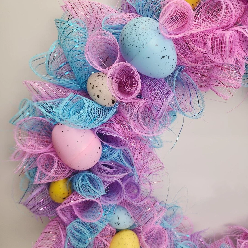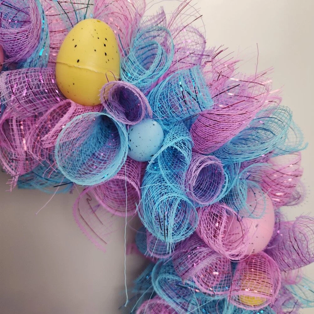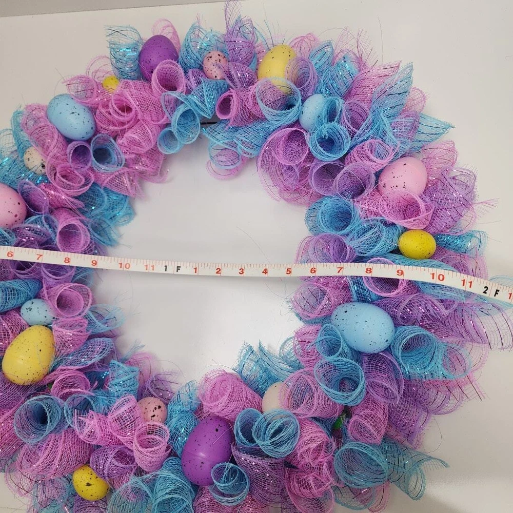Easter Egg Deco Mesh Welcome 18" Round Wreath Blue, Purple, Pink, Yellow & White * BRAND: Local Artist * COLORS: Blue, Purple, Pink, Yellow & White * SIZE: 18" Round DECORATED: 24" * DETAILS: Beautiful deco mesh 3 colored ribbons w/ colored Easter eggs. Perfect addition to a front door and the envy of your neighbors! Pre-Owned / Used: A product that has been used previously. View our listing for full details in our description and check out our photos provided. If there are any imperfections, it will be noted in the description and/or within the provided photos. We appreciate you looking at our listing. Before placing an order, feel free to ask any questions you may have about this item. Upon receiving your order, if you are not satisfied with your order, please contact us and we will address any issue.