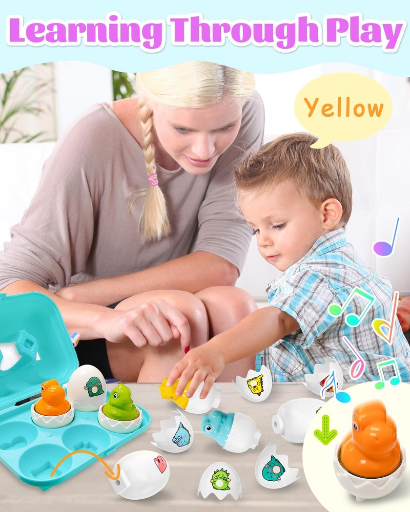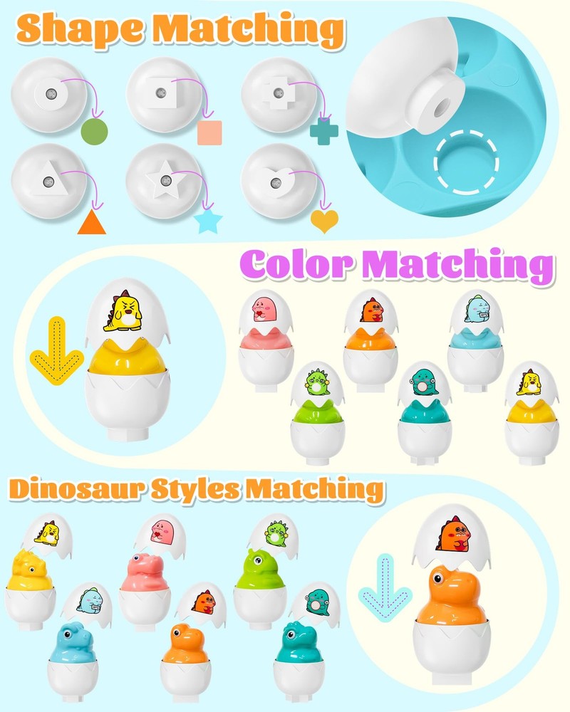 If you are looking for educational toys as a Christmas or birthday gift for a 1,2,3-year-old boy or girl, this sensory Montessori toys for toddlers 1-3 is your perfect choice. ✨[Montessori Toy for 1 2 3 Year Old] : Dinosaur matching eggs contain 6 colored eggs with 6 different shapes at the bottom, which requires our children to place the eggs into their own special base by recognizing the shapes and colors. It is designed to develop kids mind, exercise fine motor skills, and improve hand-eye coordination and problem solving. With a total of 6 different colored dinosaurs, they chirp when you gently press their heads, so this is a fun way to develop your child's senses and motor skills. ✨[Learning through play]: Easter Egg toy is a classic educational Montessori toy. Because each dinosaur has a different color, such as red, blue, orange, green, and yellow, our kids can match each dinosaur with an eggshell by recognizing the color. In addition, the 6 matching egg bases are of different shapes and perfectly fit the blue tray. When sorting eggs, toddlers need to balance their core muscles and move their hands carefully to figure out which shape fits where. This activity will help your kids control his body movements. ✨[High Quality materials]: Color and shape classification Easter Egg toys for 1-3 years old children made of high-quality plastic materials, no irritating smell, parents can rest assured that children play. The smooth surface and edges of the eggshell are suitable for small hands to grasp. ✨[1 2 3 Year Old Girl Boy Easter Birthday Gift] : Learning Egg Toys makes a great gift/Easter basket stuffers for ages 1-3. It is a great gift for Easter, Christmas or birthday parties etc. Surprise Easter egg toys for preschoolers make great Easter basket stuffing. ✨[Away from /Pad Screen]: Provides screen-free activity to develop kids creativity and protect eyesight.