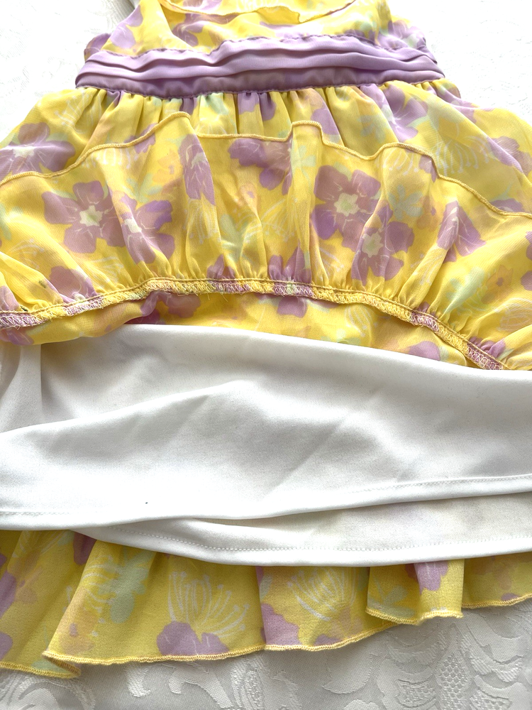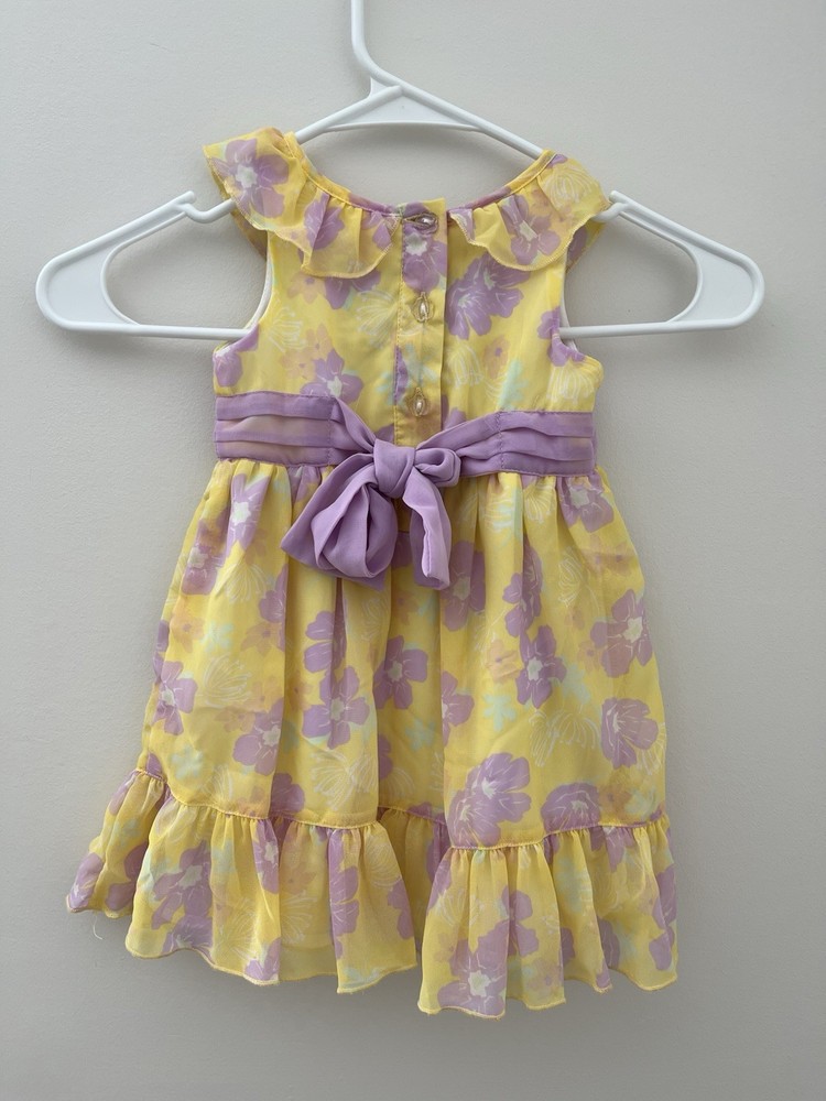 This is a yellow and purple chiffon party dress with ruffles and a bow. It is in excellent condition with no tears or stains. It is an 18 month size. The length from shoulder to hem is 17 inches and the width across the chest is 9 inches. This is a beautiful dress.