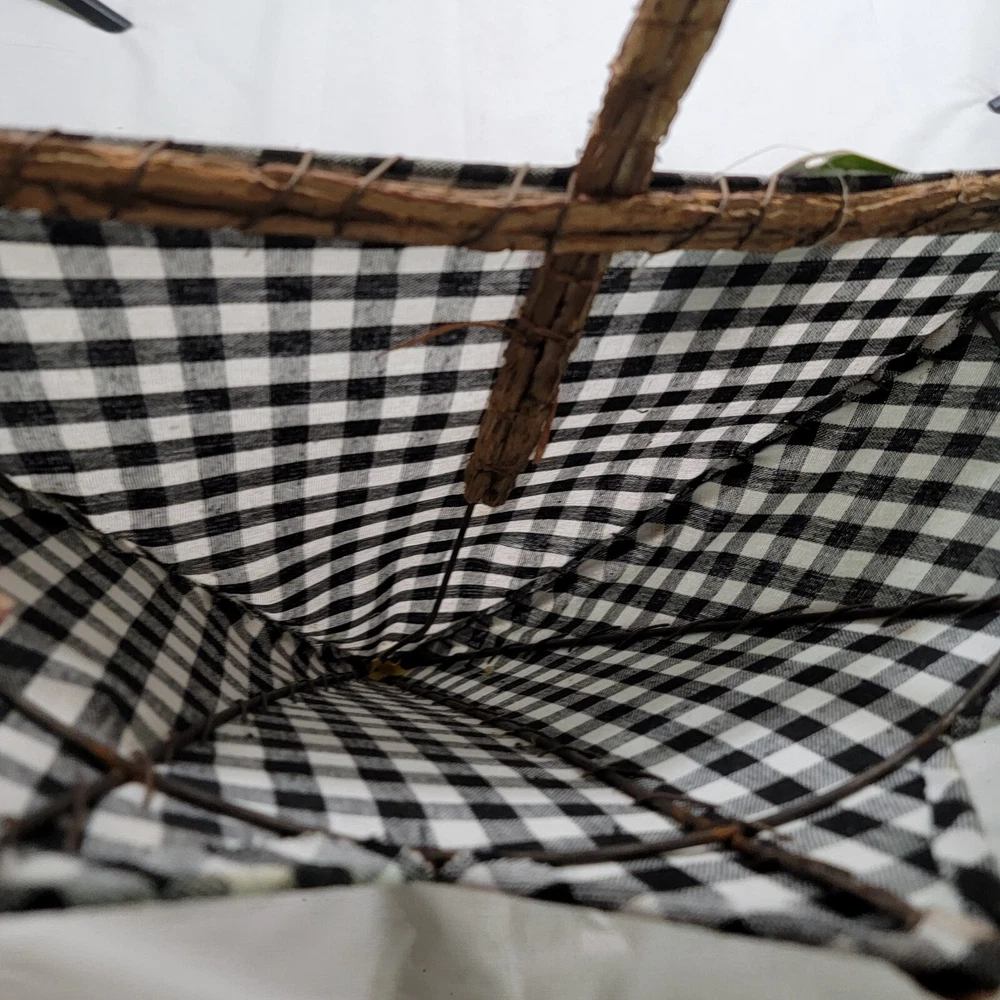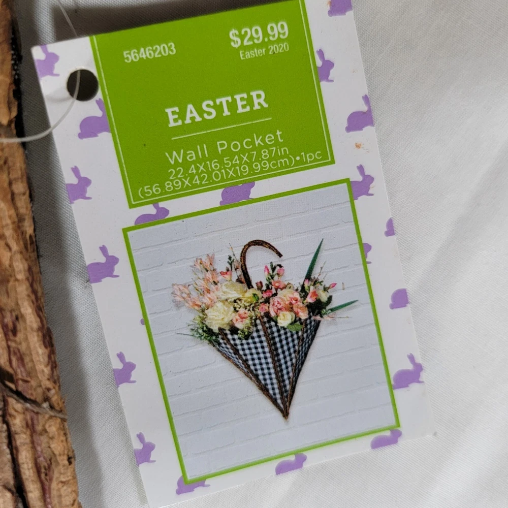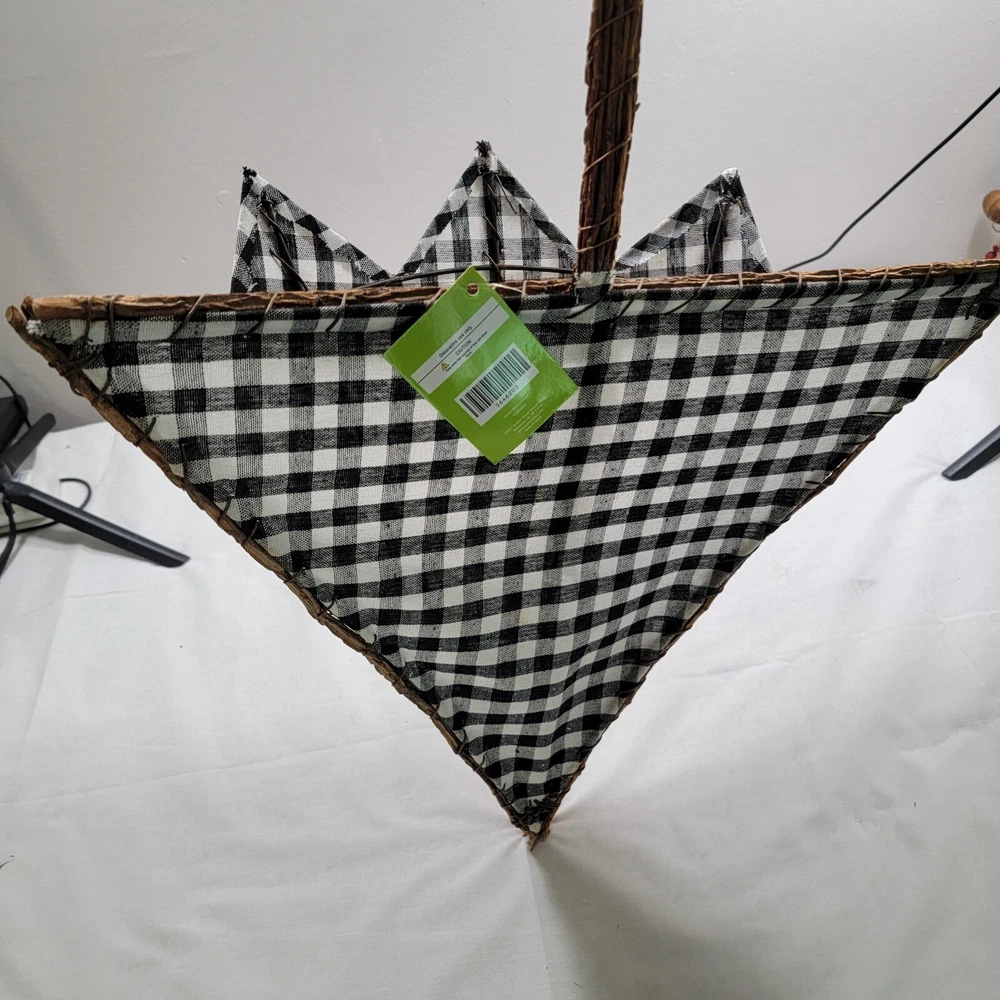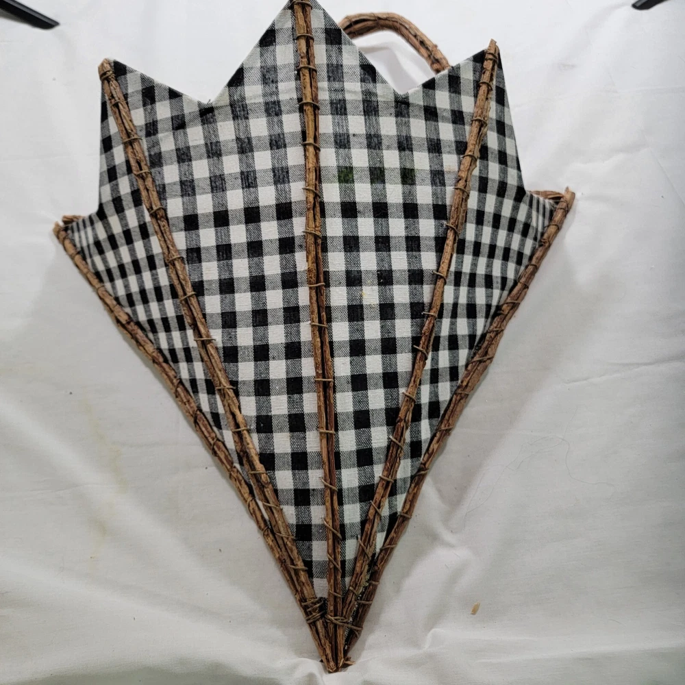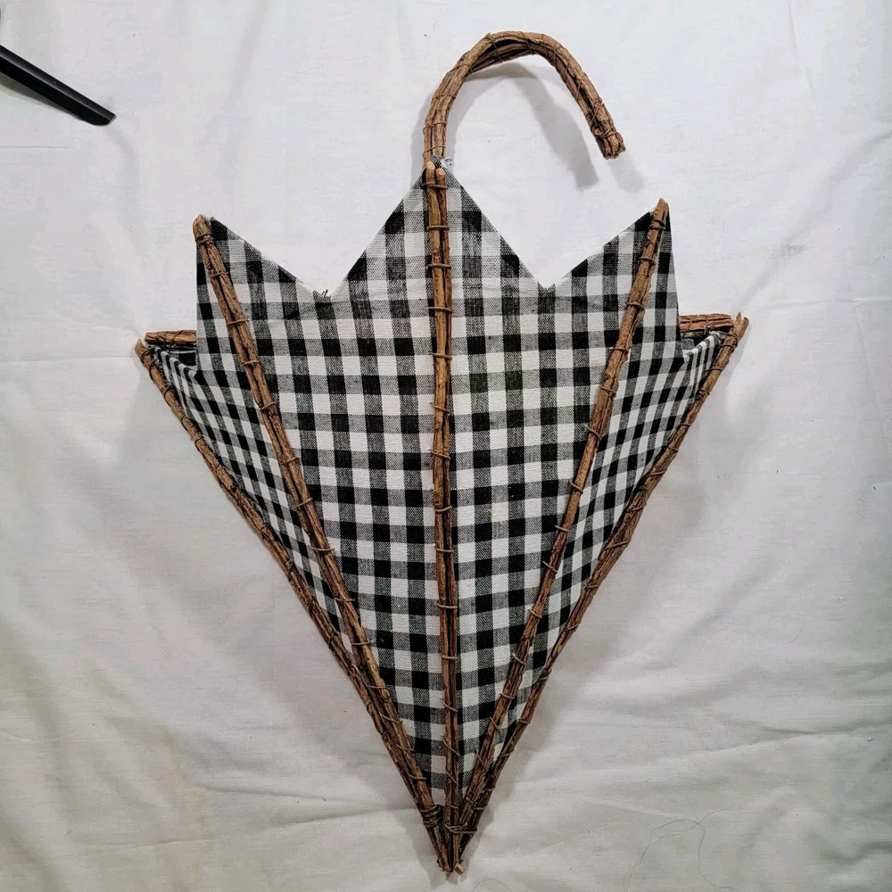 The Easter Wall Pocket Umbrella features a charming black and white gingham pattern, adding a classic touch to any room. This wall hanging is designed in the style of an umbrella, making it a unique and decorative piece for adults. Made from cotton fabric and wood, this Easter-themed wall décor adds a festive and whimsical flair to your home. Perfect for adding a touch of seasonal decor or for those who appreciate a vintage aesthetic. Can hang on door without a screen door. To wide to close the second door