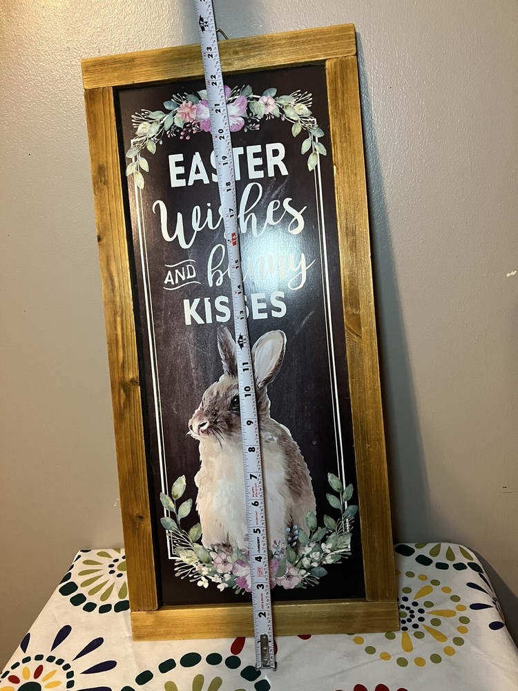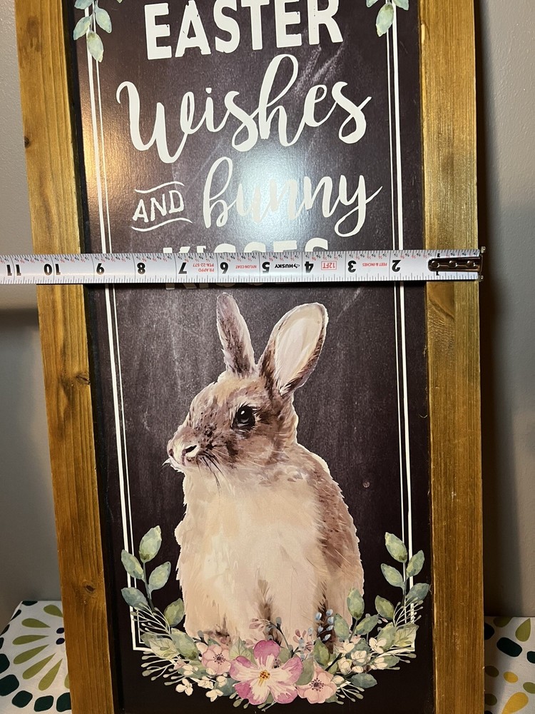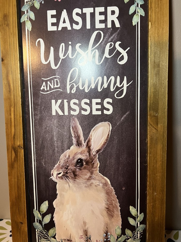 Holiday Home Easter Wooden Home Decor Sign With The Saying “Easter Wishes And Bunny Kisses” featuring adorable Bunny