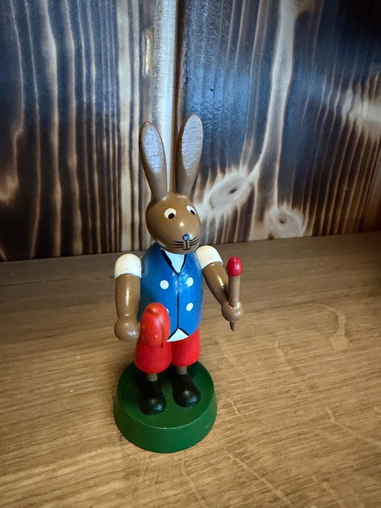 Langohr Osterhase – handbemalte Holzfigur mit Charme Dieser freundliche Osterhase mit langen Ohren bringt sofort Frühlingsstimmung ins Zuhause. Mit seiner klassischen Haltung, den kräftigen Farben und den liebevollen Details wirkt er wie ein kleines Stück vergangener Osterzeit. Der Hase ist aus Holz gefertigt und sorgfältig bemalt. In den Pfoten hält er ein rotes Ei und ein weiteres kleines Detail, was ihm einen besonders verspielten Ausdruck verleiht. Ideal als Tischdekoration, für das Fensterbrett oder als Teil einer Osterlandschaft. Durch seine zeitlose Gestaltung passt er sowohl zu nostalgischer Osterdekoration als auch zu moderner Frühlingsdeko. Details: Motiv: Osterhase mit langen Ohren Material: Holz Farbe: Mehrfarbig, handbemalt Höhe: ca. 9–10 cm (geschätzt) Zustand: Gebraucht, gut erhalten (siehe Fotos) Hinweis: Die Herkunft des Hasen ist unbekannt und wird daher bewusst nicht angegeben. Es handelt sich um einen dekorativen Osterartikel ohne Herstellerzuordnung. Ein liebevolles Stück für alle, die klassische Osterfiguren und gemütliche Frühlingsdeko mögen.