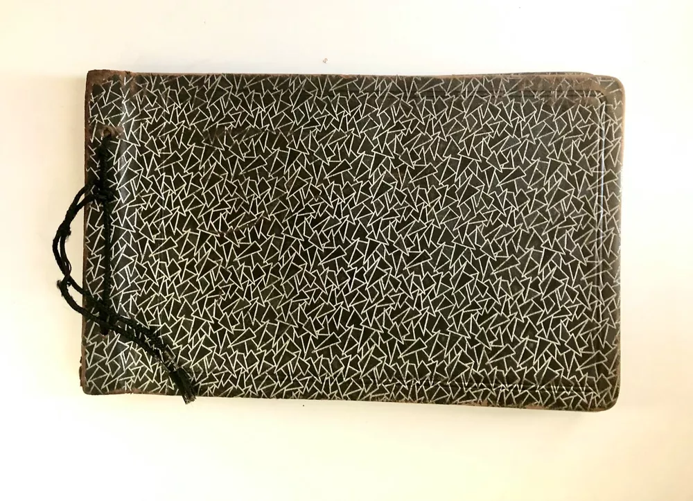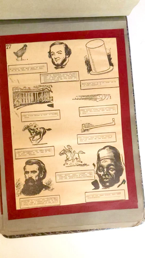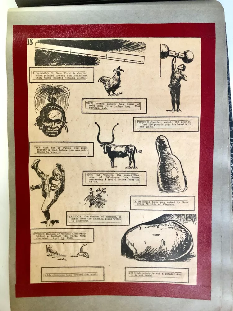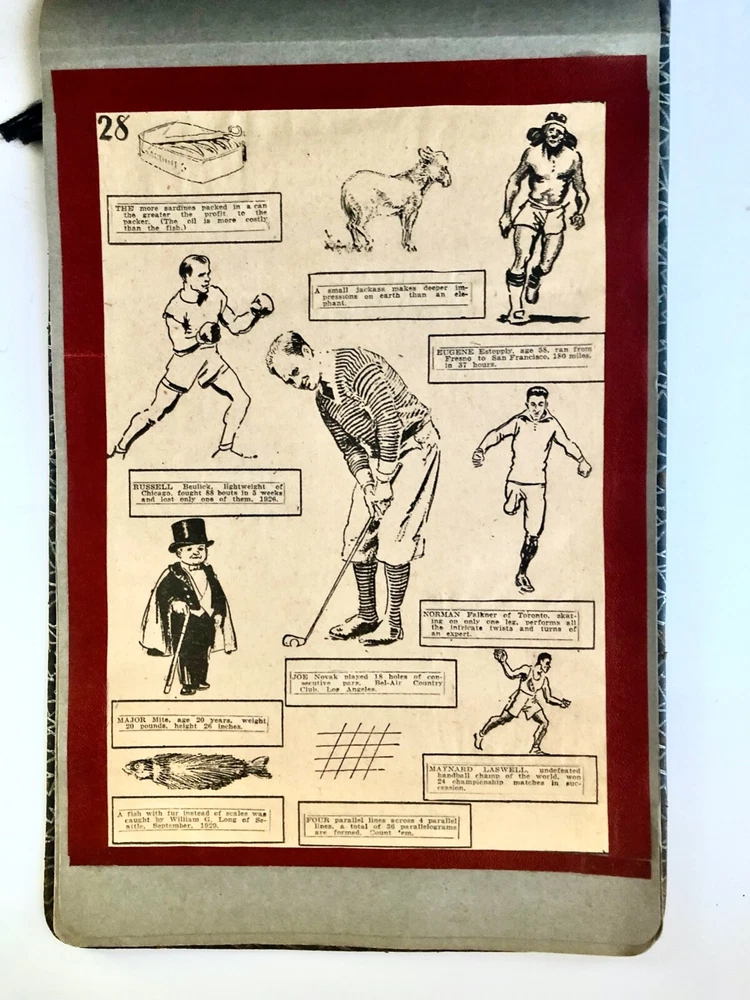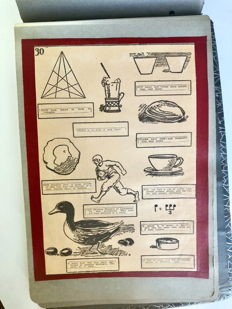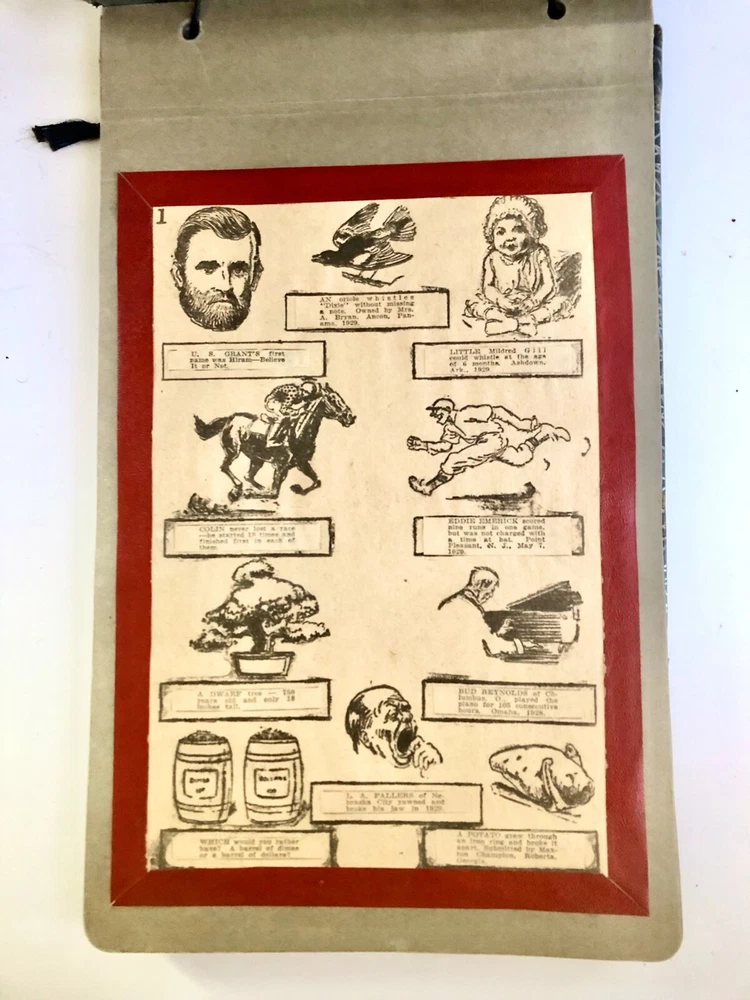 A collection of fun weird random trivia mounted on thick paper "leaves" in a leather album held together by string manufactured by Eastman Kodak Co.. Pages numbered 1 - 30 have snippets of factual trivia on a variety of topics. See images for random samples. Condition of leather album: Wear commensurates with age including loss to the black and silver exterior finish. The string is partially unraveled. Pages dog-eared. Red (tape?) has come away to some of the pages. A unique find. Album is 12.0" long, 7 3/8" tall. Questions about this item? Need more images? Please contact me, I'm happy to respond. Thanks