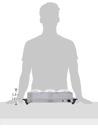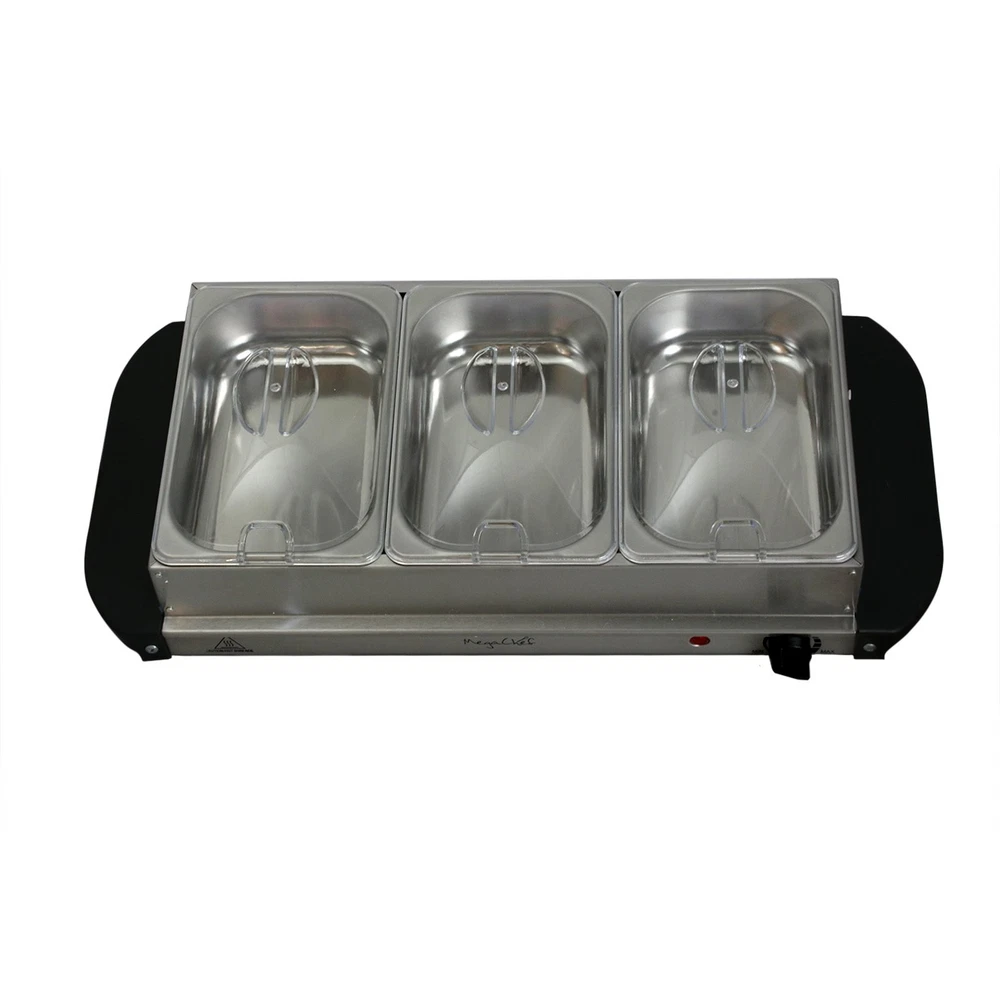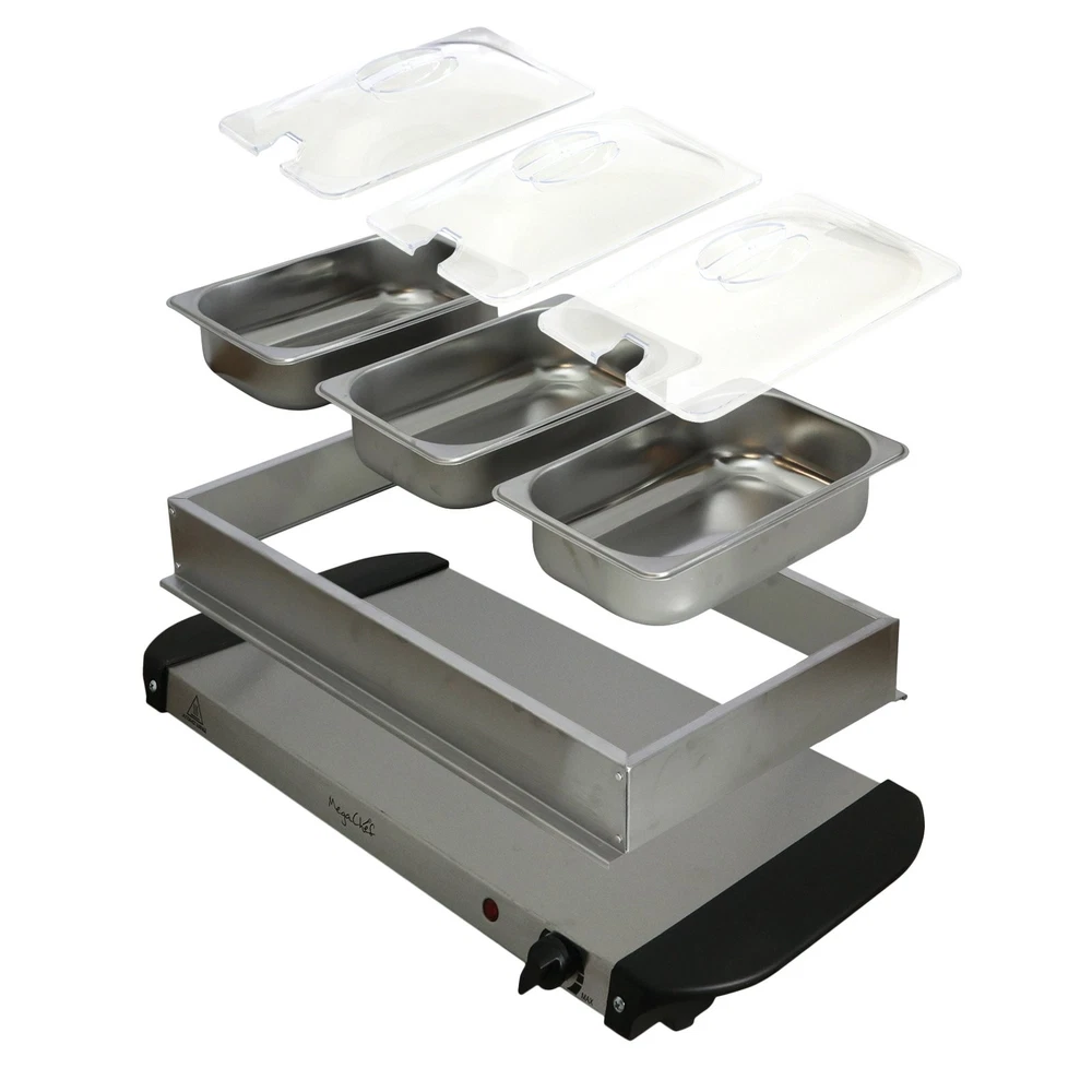 The Buffet Server & Food Warmer With 3 Removable Sectional Trays , Heated Warming Tray and Removable Tray Frame is designed with you in mind. This ultimate party sidekick will make your guests feel as though they are being served a delicious hot meal at the most exclusive banquet. You will love the versatility of this wonderful buffet server at your next party or gathering. If you are in need of keeping prepared meals warm enough to serve through out the day or night this server has you covered. This large capacity buffet server and warming tray offer you the ability to serve food that may be warmed in the stainless steel containers or on the warming tray which is the base of the unit. The warming tray comes with hard mounted side handles to ensure that you can easily transport your buffet server from one location to another without worry. This lightweight and compact portable food warmer is safe to use on your kitchen counters or serving tables. Versatility: Give yourself the gift of ease and versatility with this beautiful buffet server. In addition to the large capacity stainless steel food warming containers, you’ll also have the option of using the base warming tray to keep sauces, appetizers and much more warmed up for your guests by using the large base warming tray. All in all, this unit will have you covered from the beginning of your party to the very end! Healthy Serving: With Stainless Steel Food Containers and a Stainless Steel Base Warming Tray, you’ll have piece of mind knowing that your meals are being served with restaurant quality. Easy Portability: The warming tray comes with hard mounted side handles to ensure that you can easily transport your buffet server from one location to another without worry. This lightweight and compact portable food warmer is safe to use on your kitchen counters or serving tables. Included with your Buffet Server and Food Warming Tray: Heating Base Tray measuring in at : 2.2” in Height by 10” Inches in Width by 21.5” in Length. Heating Base Tray Warming Surface Measuring in at 9.75 Inches in Width by 17” Inches in Length. Food Container Base Tray Frame Measuring in at 17 Inches in Length by 9.75 Inches in Width. Three Medium Capacity Container Measuring in at 8.5 Inches in Length by 5.5 Inches in Width by 2.5 Inches in Height. Three Clear Medium Container Lids. High-quality durable stain and rust resistant/ Stainless Wipe Clean Only Housing/ Variable Heat Settings/ Power indicator light/ Lightweight and compact Easily Portable/ Stack-able Containers for Easy Storage/ Safe to use on kitchen counters and serving tables/ Convenient carry handles/ Ideal for a wide variety of foods and fondues