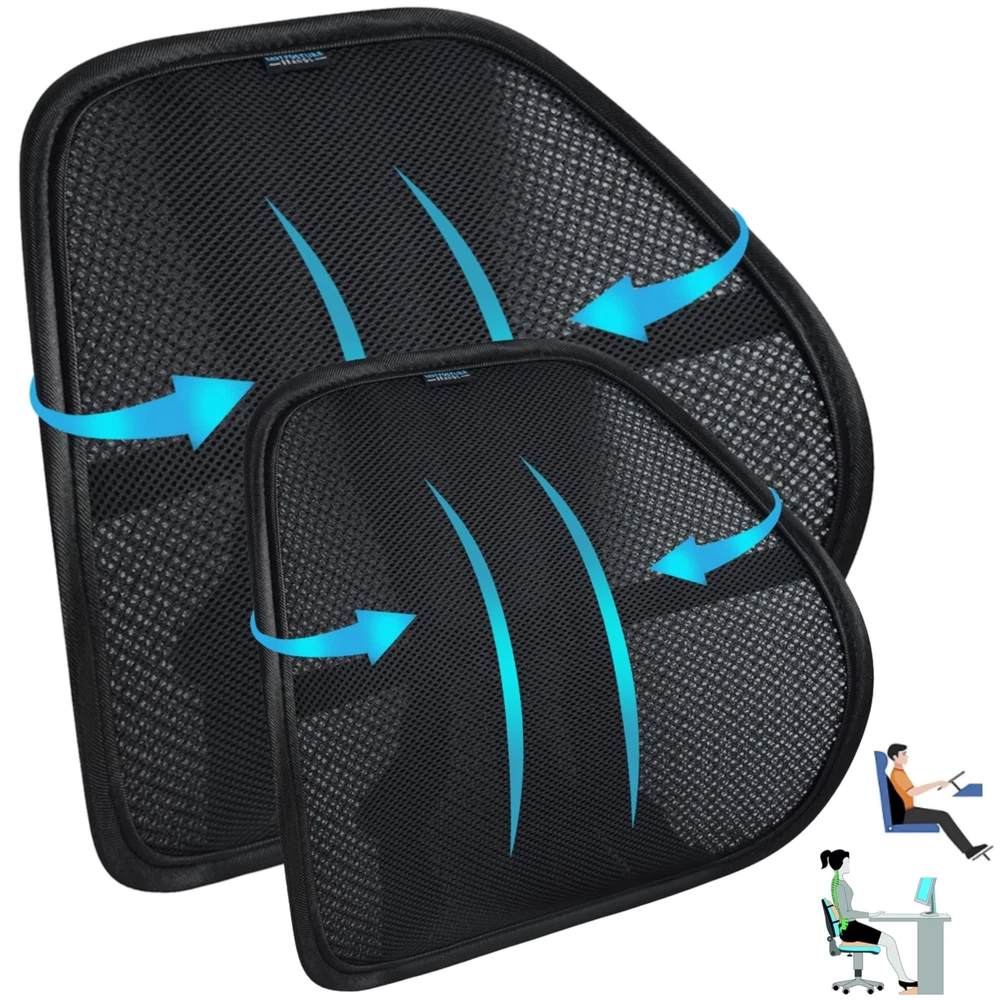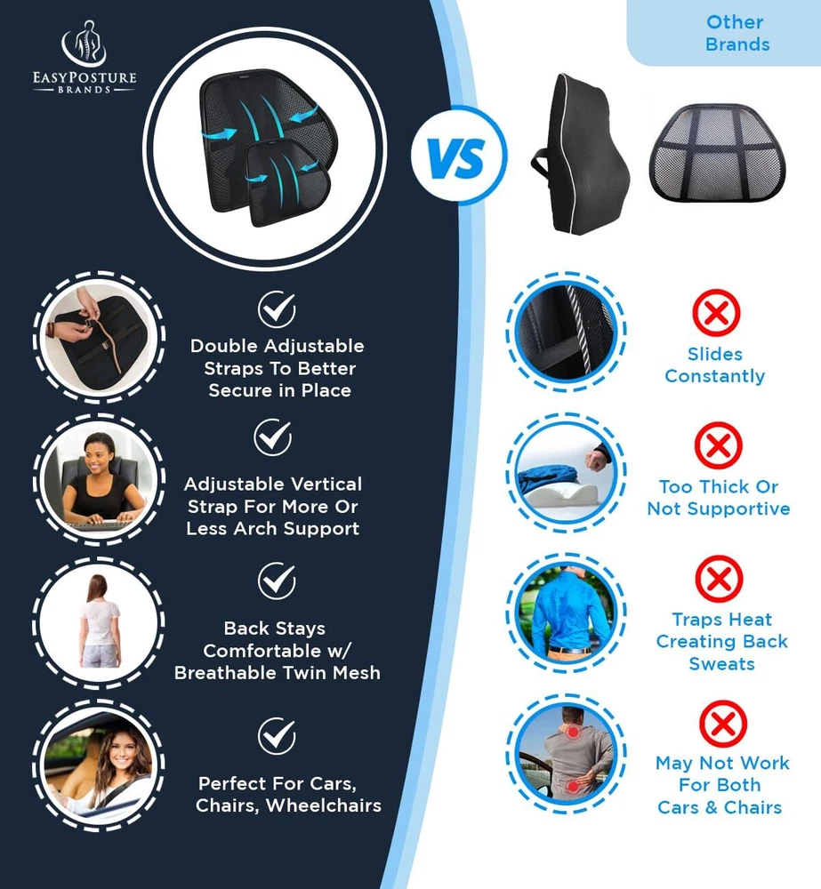 Premium Double-Layered Mesh Lumbar Support (2 Pack) - For Car, Office Chair, Truck Seat, Gaming Chair 🧘♂️【Get Better Posture & Back Support While Sitting】- Our Back Support for Office Chair is made with an ergonomic natural S-curve design and premium breathable double-layer mesh for complete air flow for your back. Our mesh back support for office chair or car contours to your back, thereby relieving pressure and pain from your lower back while sitting or driving. 🛑【Stops Slouching & Poor Posture】- Our Easy Posture corrector for chair helps you to sit up straight in office chairs, desk chair, car seat, or truck seat. Keeps your spine properly aligned to improve & correct your posture. Our back lumbar support for chair will give you firm lower back support. 💦【Say No! to Sweaty Backs】- Unlike memory foam that makes your back sweat, the Easy Posture Back Rest for Chair has a great ventilation system of breathable double mesh fabric designed for great air circulation for your back; very therapeutic! 🛑【 Stops Slippage in Office Chair or Car Seat】- Tighten our lumbar support by using our 3-Way Adjustable Strap System (buckles & snap) (horizontal & vertical) to firmly secure our lumbar support for office chair, desk chairs, car or truck seats & recliners. Adjust & tighten the horizontal strap around most car seats or truck seats. 🚗【No More Back Discomfort While Driving】- Most car seats lack adequate lumbar support. Easy to install our car lumbar support for driving seat and your lower back will feel like you're sitting in a new car with good car seat back support. Our lumbar pillow for car has an ergonomic contoured design with good back support for car seat driver. Perfect for short or long car drives. ✅【Invest in a Chair Support for Better Posture】- Our office chair lumbar support will give you better back support so you can sit longer. Sit & relax with our lumbar support for chair that provides great arch support with dimensions of 15.5"x12.75"x5" (may vary slightly). ✅【Our Policy: Lifetime Replacement Guarantee】If anything goes wrong with your Easy Posture Back Rest for Office Chair, we got your back (literally)! You will be protected under our lifetime warranty. will take good care of you before & after your purchase.
