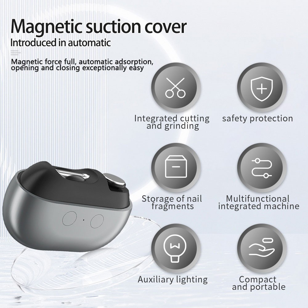 Easyclip Smart Nail Clipper, 3 In 1 Multi-Functional Electric Toenail Clippers Features: 【3 in 1 Electric Polishing Automatic Nail Clippers】: Combines automatic nail clipping, gentle polishing, and LED auxiliary light in one device, achieving smooth, neatly trimmed nails without the need for separate tools, saving time and effort. This electric nail clipper with LED auxiliary light allows you to use it safely even in dim environments. Making it ideal for infants, children, the elderly, and anyone. 【Automatic Storage of Nail Scraps】: This electric nail clipper has a built-in nail scraps storage compartment, which can be automatically stored after trimming nails, so you won't have to worry about clipped nail fragments flying everywhere, ensuring a mess-free experience and keeping your surroundings clean. You can use this electric nail clipper anywhere. 【Low Noise & Safety Design】: Our electric nail trimmer works with 35 decibels of low noise, allowing you to trim your nails in peace. Featuring an anti-pinch safety mechanism, the device stops instantly when excessive force is detected, protecting delicate fingers. 【Easy To Use】Simply open the lid, touch the power switch, place the nail into the trimming opening and move the machine slightly from side to side to finish fingernail clippers, don't stay in the same area for a long time to avoid over-trimming. Portable Nail Care Specification: Name: Smart Nail Clipper Battery capacity: 500mAh Input: 5V/1A Charging Interface: Type-C Color: White, Gray, Pink , Purple Size: 59mm*86mm Product weight:112g Package Includes: 1pc *Smart Nail Clipper 1pc *Type-C Data Cable Note: 1.Due to manual measurement, please allow a difference of 1-5g/1-2cm. 2.Due to different displays and different lighting, the picture may not reflect the actual color of the item. Thank you for your understanding