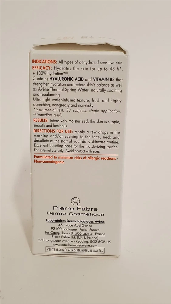 Eau Thermale Avène Hydrance Boost Concentrated Hydrating Serum Hyaluronic 1.0 oz Condition: Open Box - New Item - Includes original packaging but there may be light damage to packaging - Guaranteed to function perfectly and include all parts Description: Expires 5/2026 A lightweight, thirst-quenching water-gel serum that instantly provides skin with a boost of intense hydration while replenishing natural moisture levels to provide long-lasting hydration for 48 hours. Provides up to 48 hours of intense hydration Soothes tightness and discomfort common with dehydrated skin Helps restore skin's protective barrier while soothing skin Powered by SixBit's eCommerce Solution Powered by SixBit's eCommerce Solution