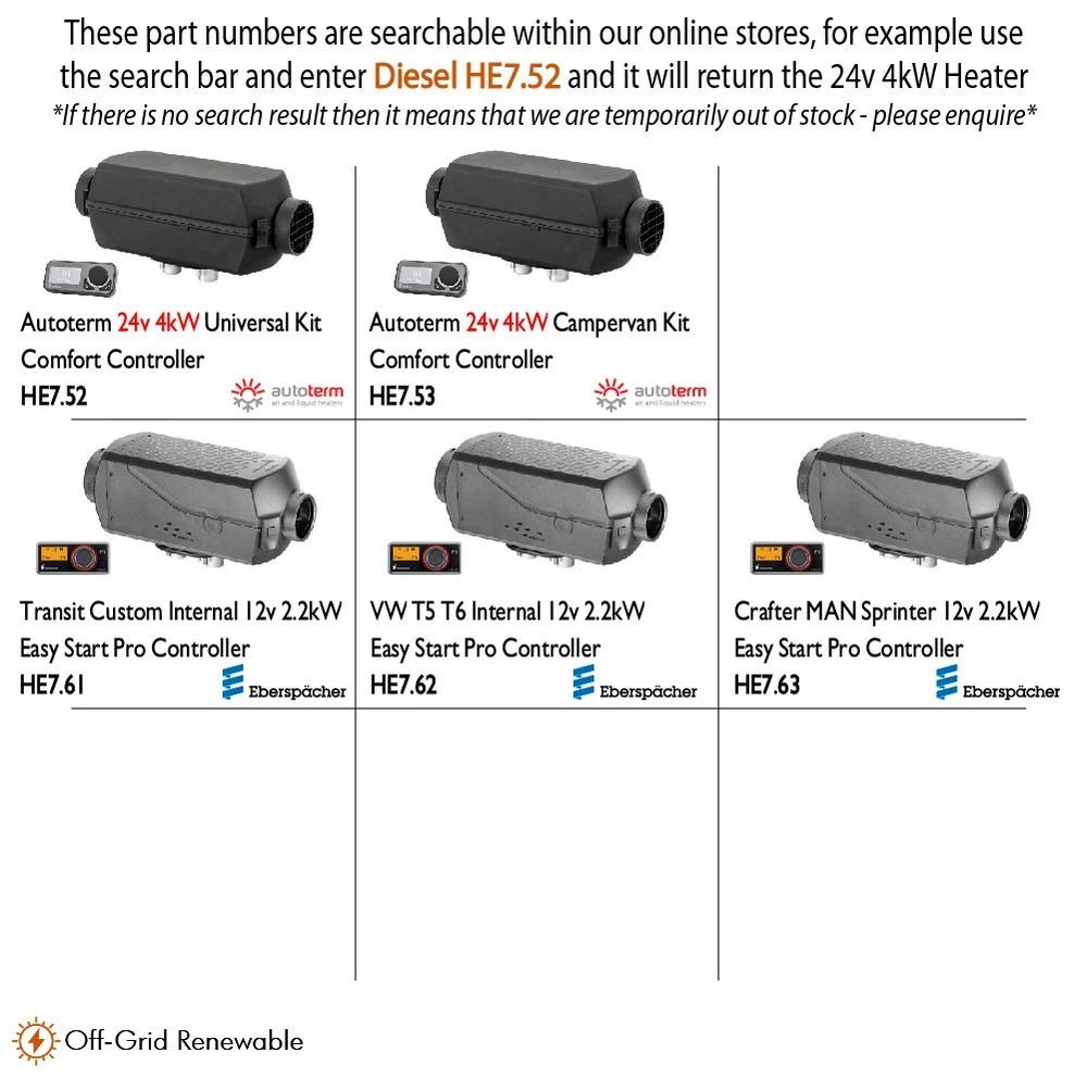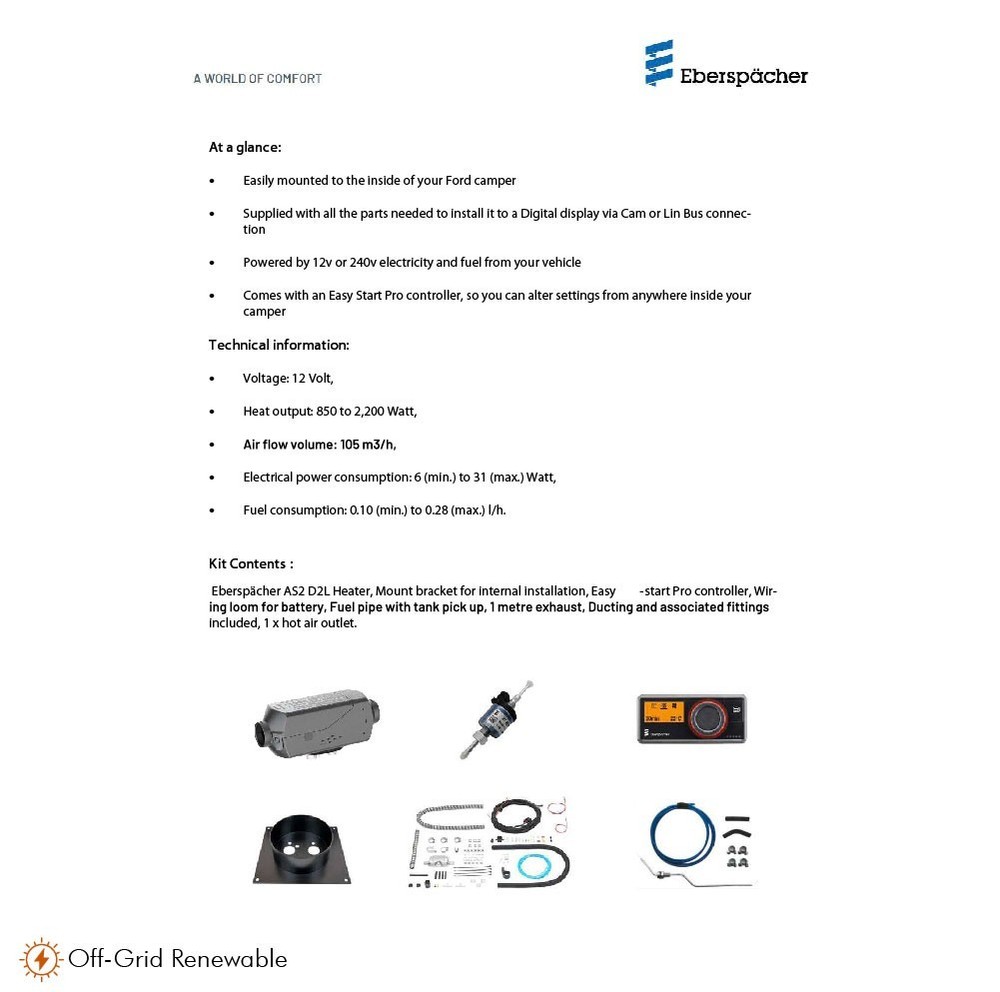 ITEM DESCRIPTION The AS3 D2L Airtronic 12V heater kit has been designed to fit and work perfectly with the latest editions of the Ford Transit Custom. An easy, efficient way to ensure that you can always keep the interior of your camper at a comfortable temperature, the Eberspacher AS3 D2L Airtronic heater has been designed to fit to the interior of your vehicle. Easily mounted to the inside of your Ford camper. Supplied with all the parts needed to install it to a Digital display via Cam or Lin Bus connection. Powered by 12V or 240V electricity and fuel from your vehicle. Comes with an Easy Start Pro controller, so you can alter settings from anywhere inside your camper. This kit contains: Eberspacher AS3 D2L Heater, Mount bracket for internal installation, Easy-start Pro controller, Wiring loom for battery, Fuel pipe with tank pick up, 1 metre exhaust, Ducting and associated fittings included, 1x hot air outlet. Additional Features: • Patented housing design for improved plagiarism protection • Lifetime of up to 5,000 operating hours due to brushless motor • Backward compatibility through carry-over connections • Sensor-controlled, optimised start-up sequences through measurement of environmental parameters • Optimised heat air flow due to improved heat exchanger • Compatibility with all other control units • Diagnostics and parameter assignment via Easy Scan • Designed to be integrated into on-board systems via CAN (12/24V), LIN (12V), S+(12/24V) interfaces Key Features -High heating power, yet compact design -Automatic altitude adjustment up to 5500m -Flexible installation with 90° tilt possible to either side -Stepless heating performance control ensures quiet operation -7 Day programable controller Voltage: 12 Volt Heat output: 850 to 2,200 Watt Air flow volume: 105 m3/h Electrical power consumption: 6 (min.) to 31 (max.) Watt Fuel consumption: 0.10 (min.) to 0.28 (max.) l/h -------------------- PACKAGE INCLUDES - - Complete Eberspacher kit for Ford Transit Custom -------------------- ADDITIONAL NOTES - Suitable For - Ford Transit Brand - Eberspacher Voltage Description - 12V DC Colour - Black Wattage - 6W to 31W Fuel - Diesel Country of Origin - United Kingdom Contents - Airtronic AS3 D2L Heater, Internal Mounting Bracket, Easy-start Pro Controller, Wiring Loom, Fuel Pipe, 1m Exhaust, Ducting, Fittings, Hot Air Outlet PLEASE NOTE: If you have one of the following postcodes then there may be an extra postage charge on top of the cost of the item, depending on the item that you have purchased and the service that we use - We will contact you if there are additional shipping fees to AB, IV, KA, KW, PA, PH, BT, HS, ZE, IM, TR, FK. Please ask for a quote if you are unsure. -------------------- SMALL PRINT PAYMENT Payments by paypal, bank transfer and cash on collection are accepted POSTAGE Please see the postage policy at the top of the page for full details of our postage options RETURNS Returns are accepted. Please see the returns policy at the top of the page for further details FEEDBACK If you have an issue with the order please feel free to contact us to discuss by using the ‘Contact Seller’ facility DELIVERY Please remember that delivery time is based on working days. Please allow a suitable amount of time for delivery, taking into account weekends and Bank Holidays **PLEASE SEE OUR EBAY STORE FOR MOTORHOME AND BOAT ACCESSORIES**