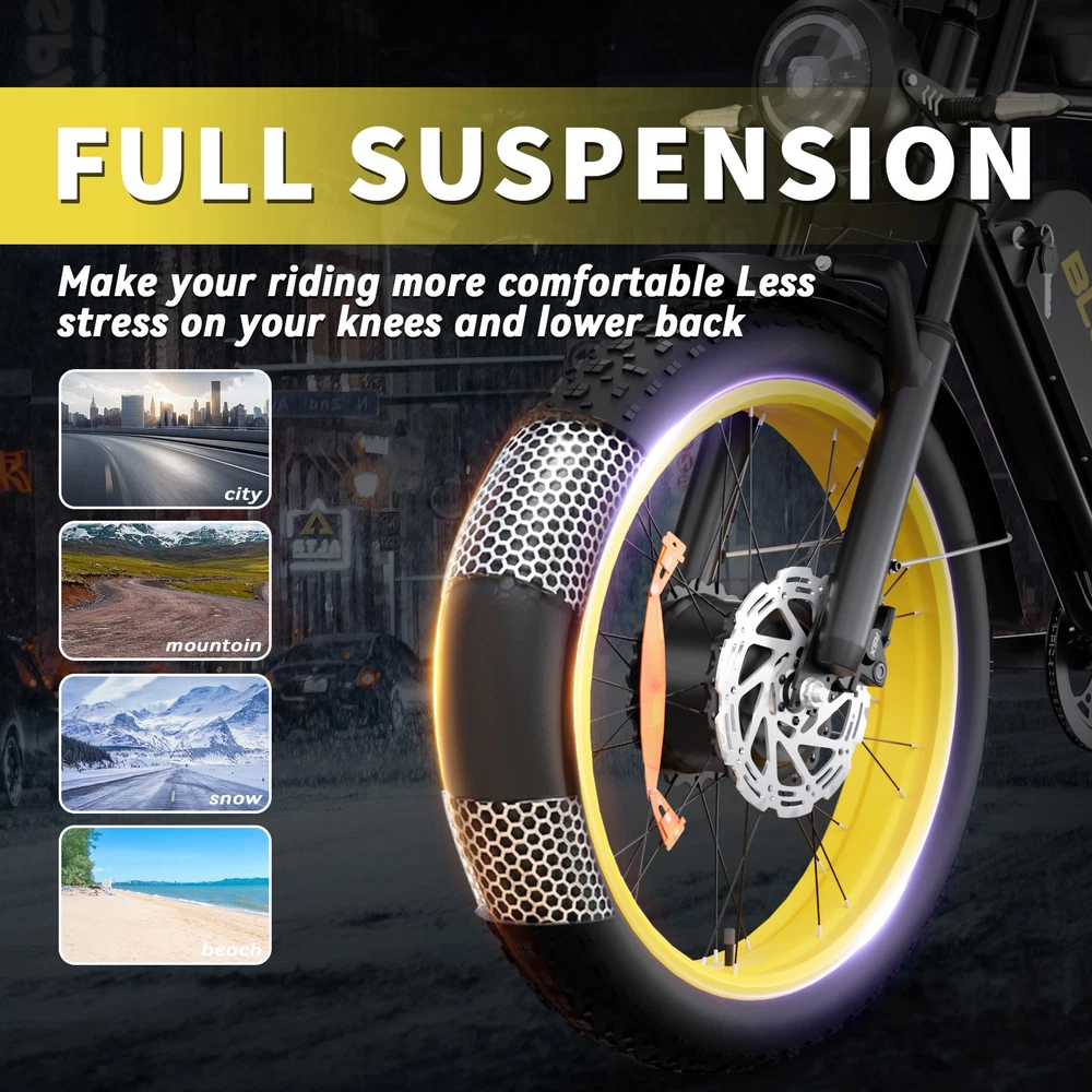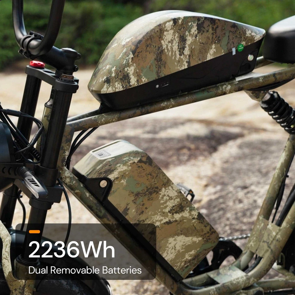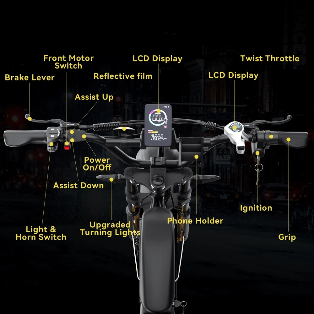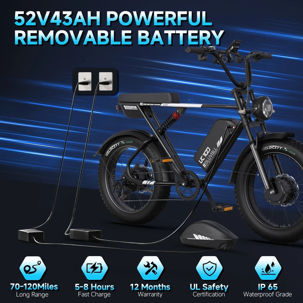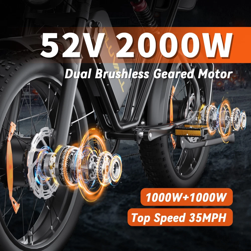 Why? The e-bike is designed for convenience in both commuting and adventure, featuring a speed of 39 MPH and a long range of 120 miles,Barely any maintanence. E-SYSTEM Class Class 1/2/3 (Switchable) Motor Dual Geared Hub Brushless Motors, Rated 1000W x2 (Peak 1500W x2), Front & Rear Motor Torque 160Nm Controller 52V 25A x2 Battery Removable Dual BMS Lithium-ion Battery, Top 52V 20Ah + Bottom 52V 23Ah, 2236Wh Certification UL 2849 & UL 2271 Certified (Entire e-bike system and battery are certified) Charger 58.8V 3 Amp Charger, Aviation Connector, UL LISTED Charge Time Approx. 5~8 Hours Max Speed 39 MPH Max Range Up to 120 miles by pedal assist, 70+ miles by throttle (based on 70kg rider; varies with conditions) FEATURES Display Backlit LCD Multifunctional Display USB Port Display-Integrated USB Charging Port to charge your phone on the go Lights Integrated 500Lux Headlight & Front Turn Signal Lights & Rear Light with Turn Signals Riding Modes 3 Distinct Riding Modes, 5 Levels of Pedal Assist Pedal Assist 5 Levels, Cadence Sensor Speed Configuration Unlock the speed limit to 37MPH, or set the speed limit to a desired safe velocity. Water Resistance IPX6 Rating (Protects against powerful water jets from any direction) COMPONENTS Frame High-Strength Carbon Steel, Thickness 2.2~2.5mm Suspension Dual Suspension Front Fork Dual Crown Suspension Fork (120mm Travel) with lock-out and rebound adjustability for pro-level control and handling. Rear Shock Heavy-Duty Rear Shock (Hot 180mm, 30mm Travel) engineered to support heavy payloads and absorb major impacts for a stable, planted ride. Brake Front & Rear Hydraulic Disc Brakes Brake Rotor 180mm, 1.9mm thick Throttle Twist Throttle, Ergonomic Right-Hand Throttle Shifter Shimano, 7-Speed Freewheel SHIMANO 12~28T Rear Derailleur SHIMANO 7 Speed Cassette SHIMANO 12~32T, 7 speed Crank & Chainring 48T, 170mm Alloy Crank Bottom Bracket Hexagon Taper, PAS Sensor Handlebar Aluminum Ø31.8mm, Width 700mm Grips Durable Ergonomic Grip, Half Throttle Seatpost Forged Alloy, 30.9mm, 28cm 2-Bolt Clamp Stem Bar bore Ø31.8mm, Clamp I.D. Ø28.6mm, Height 60mm, Rise 0° Headset Sealed Bearing Headset Rim Material Aluminum Rim Size 20 x 3.0 Rim Type Wheel with Integral Hub Front Wheel Spokes 13G x 244/246mm, Black Stainless Rear Wheel Spokes 12G x 217/219mm, Black Stainless Hubs Disc Nutted Front / Rear Axles Tire Puncture Resistant Fat Tires, 20″ x 4.0″ Tubes Butyl Rubber,A/V Saddle Extended Two-Passenger Saddle, crafted from durable PU leather to comfortably share the ride Pedal 1 Pairs Alloy Platform Pedals Kickstand Side Kickstand, Aluminum alloy Fenders Full-Coverage Front & Rear Fenders Included Phone Holder Included DIMENSIONS & WEIGHT Net Weight 42 kg (92.6 lbs) Gross Weight 52 kg (114.6 lbs) Battery Weight 5.1kg x2(11.5lbs x2) Payload Capacity 150 kg (330 lbs) Recommended Rider Height 5'5"–6'7" (165cm ~200cm) Product Size 172 x 113 x 75 cm Packing Size 150 x 34 x 80 cm Description 【 Powerful Dual Brushless Motors 】 Equipped with dual Rated 1000W Front & Rear brushless motors, delivering a combined peak power of 3000W and 160Nm of torque. Perfect for both city commutes and off-road adventures, it reaches speeds up to 39MPH , offering thrilling acceleration and smooth performance. Whether climbing hills or cruising, the dual motors ensure a powerful and stable ride. 【Removable 2236WH BMS Battery 】 Equipped with two 52V Top 20AH + Bottom 23AH batteries, which offering a range of 70-120 miles depending on the mode. Utilizing pedal assist, the range extends to an impressive 120 miles (single motor) and 70 miles (dual motors), with throttle mode, it covers up to 70 miles (single motor) and 40 miles (dual motors) .ensuring you travel without worries. (Calculation based on rider's weight of 70kg. Range varies according to road condition, weather, rider's weight etc.) The dual battery system ensures longer rides and added flexibility. Included are two chargers, allowing you to charge both batteries simultaneously or separately. You can charge directly on the bike or remove the batteries for charging, providing convenience at home or on the go. 【Dual Suspension & 20" Puncture-Proof Fat Tires 】 Equipped with dual-crown front suspension fork and rear shock, and the 20" fat tires, which provide great grip and excellent shock absorption, and effectively increase riding stability. Ensure that this fast electric bike performs well on various terrains. Whether you're navigating snow, sand, mud, or city streets, the all-terrain tires provide superior grip and stability. The full suspension system absorbs bumps and shocks, delivering a smooth and comfortable ride even on rough surfaces. 【Shimano 7 Speed Gears & Hydraulic Brakes System 】 Equipped with hydraulic disc brakes at the front and rear. These high-performance brakes provide precise stopping power in all conditions, including wet or muddy environments. Whether you're speeding downhill or navigating through the city, the hydraulic disc brakes ensure reliable, smooth braking. 【High-Strength Carbon Steel Frame】 Equipped with t he carbon steel frame, which provides excellent strength and durability, supporting up to 330 lbs (150 kg) of weight. Despite its robust construction, the frame is designed to be lightweight, making it easy to maneuver. Available in sleek color options, this bike combines durability with style. 【Multiple Riding Modes】 Offering pedal assist (5 levels), pure electric mode (5 levels), Cruiser mode, and manual cycling, the electric bike, cruiser mode for adults provides a tailored riding experience for every need. The added cruise control function ensures comfortable long-distance rides, while the intuitive digital display keeps track of important data such as speed, battery level, and pedal assist levels. 【Smart LCD Display & Upgraded Lights】 Equipped with an Color LCD display, you can easily monitor your speed, battery level, and riding mode. The display also provides 