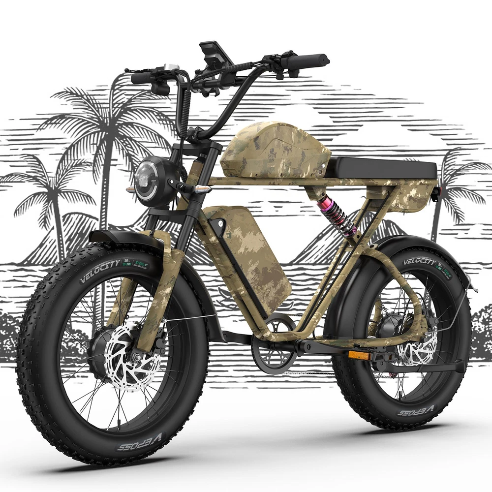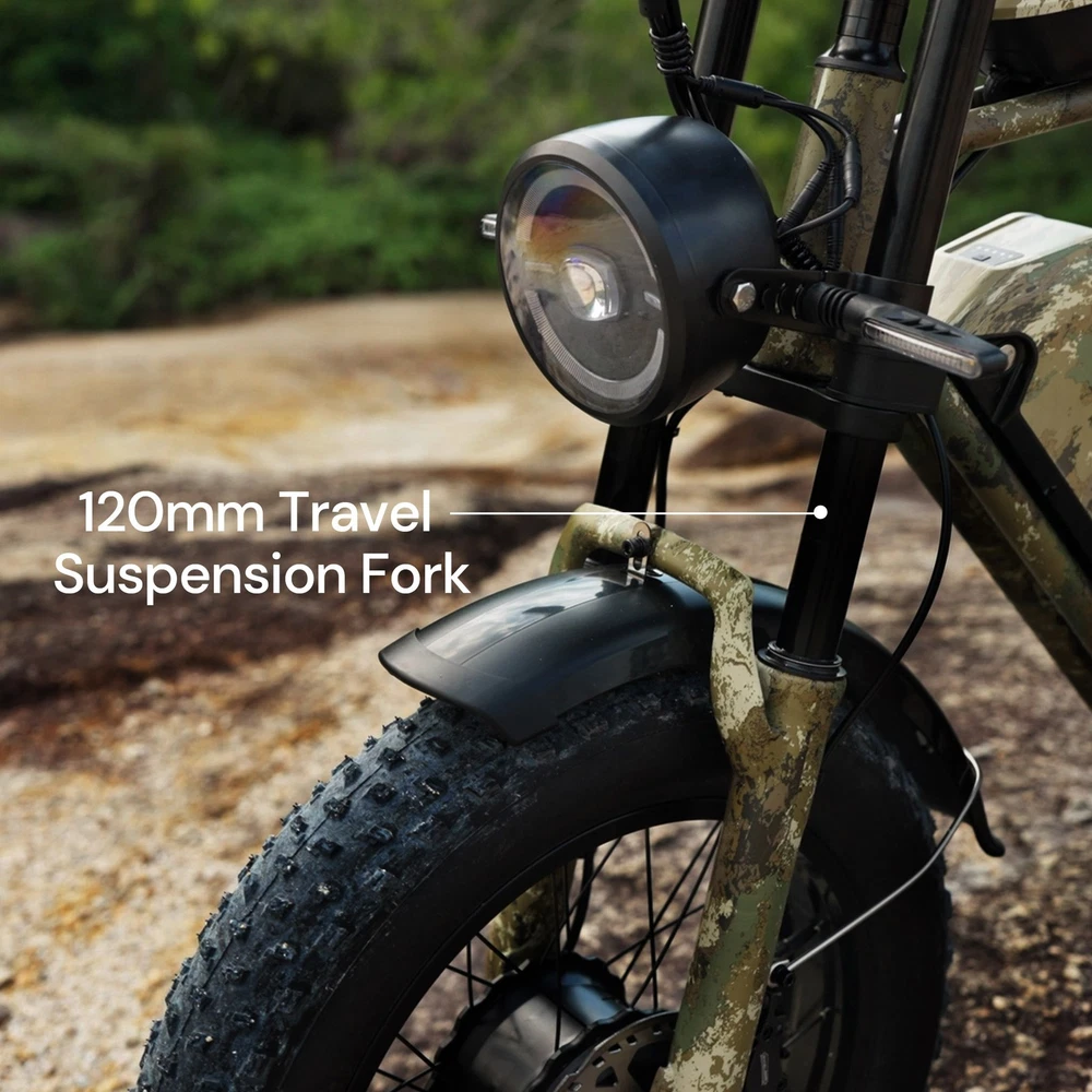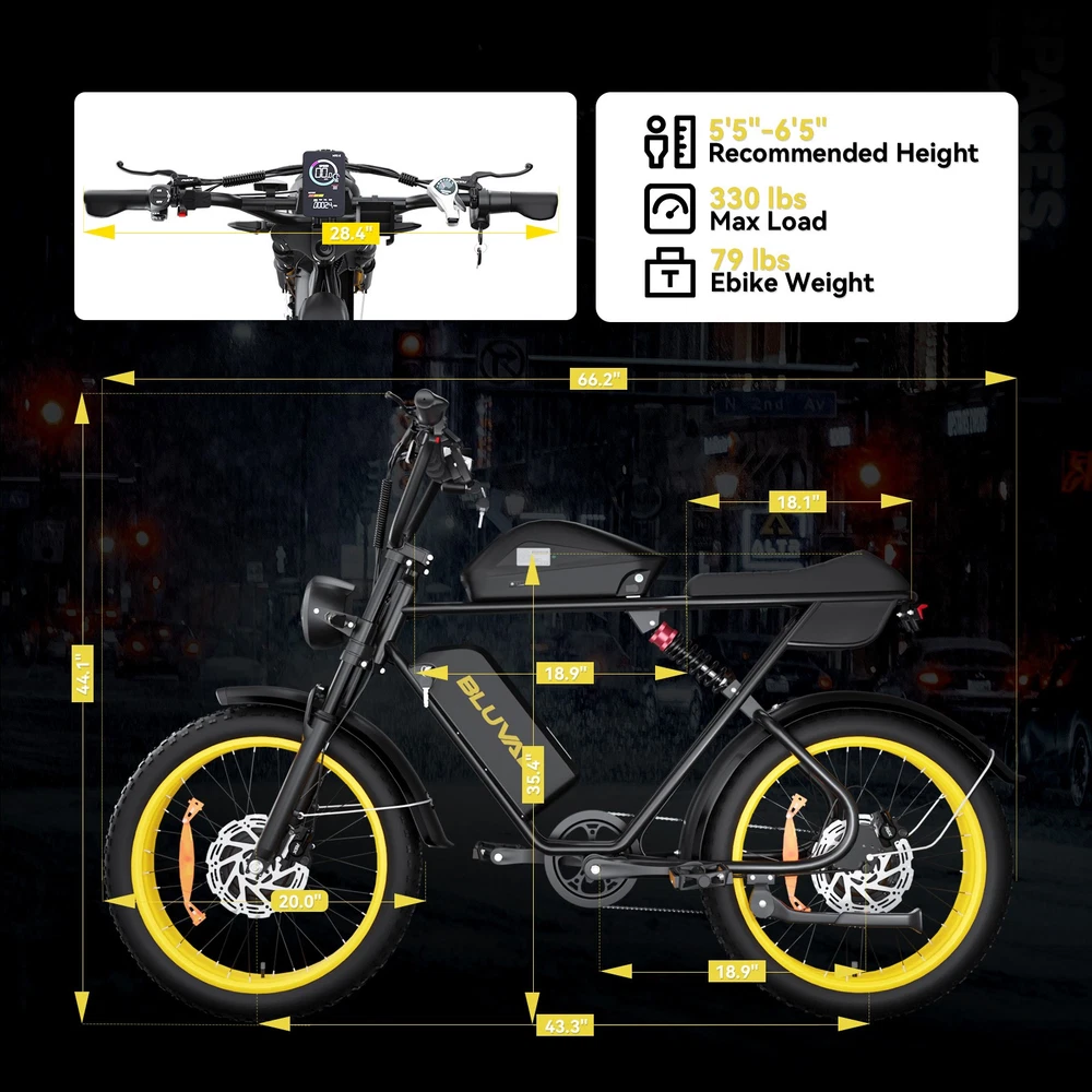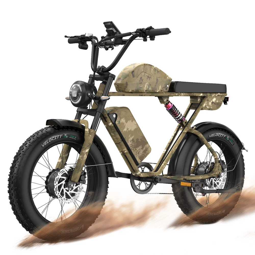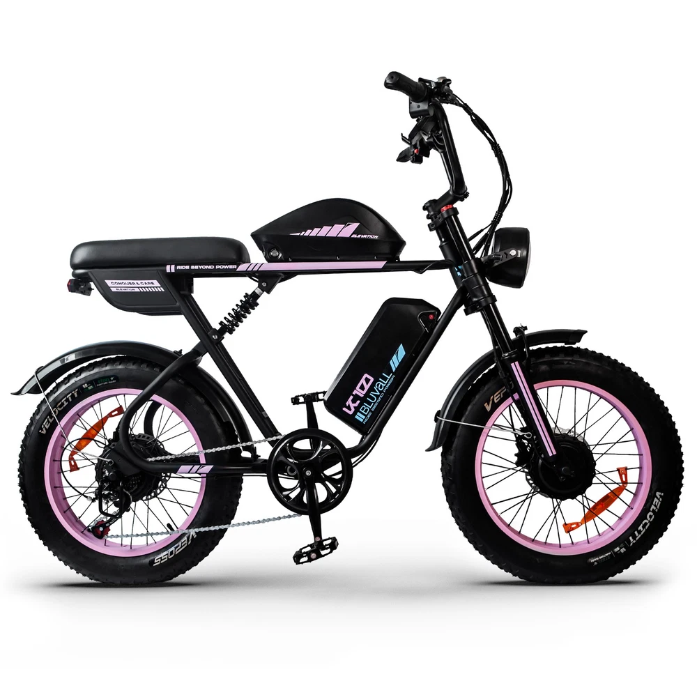 Why? The e-bike is designed for convenience in both commuting and adventure, featuring a speed of 39 MPH and a long range of 120 miles,Barely any maintanence. E-SYSTEM Class Class 1/2/3 (Switchable) Motor Dual Geared Hub Brushless Motors, Rated 1000W x2 (Peak 1500W x2), Front & Rear Motor Torque 160Nm Controller 52V 25A x2 Battery Removable Dual BMS Lithium-ion Battery, Top 52V 20Ah + Bottom 52V 23Ah, 2236Wh Certification UL 2849 & UL 2271 Certified (Entire e-bike system and battery are certified) Charger 58.8V 3 Amp Charger, Aviation Connector, UL LISTED Charge Time Approx. 5~8 Hours Max Speed 39 MPH Max Range Up to 120 miles by pedal assist, 70+ miles by throttle (based on 70kg rider; varies with conditions) FEATURES Display Backlit LCD Multifunctional Display USB Port Display-Integrated USB Charging Port to charge your phone on the go Lights Integrated 500Lux Headlight & Front Turn Signal Lights & Rear Light with Turn Signals Riding Modes 3 Distinct Riding Modes, 5 Levels of Pedal Assist Pedal Assist 5 Levels, Cadence Sensor Speed Configuration Unlock the speed limit to 37MPH, or set the speed limit to a desired safe velocity. Water Resistance IPX6 Rating (Protects against powerful water jets from any direction) COMPONENTS Frame High-Strength Carbon Steel, Thickness 2.2~2.5mm Suspension Dual Suspension Front Fork Dual Crown Suspension Fork (120mm Travel) with lock-out and rebound adjustability for pro-level control and handling. Rear Shock Heavy-Duty Rear Shock (Hot 180mm, 30mm Travel) engineered to support heavy payloads and absorb major impacts for a stable, planted ride. Brake Front & Rear Hydraulic Disc Brakes Brake Rotor 180mm, 1.9mm thick Throttle Twist Throttle, Ergonomic Right-Hand Throttle Shifter Shimano, 7-Speed Freewheel SHIMANO 12~28T Rear Derailleur SHIMANO 7 Speed Cassette SHIMANO 12~32T, 7 speed Crank & Chainring 48T, 170mm Alloy Crank Bottom Bracket Hexagon Taper, PAS Sensor Handlebar Aluminum Ø31.8mm, Width 700mm Grips Durable Ergonomic Grip, Half Throttle Seatpost Forged Alloy, 30.9mm, 28cm 2-Bolt Clamp Stem Bar bore Ø31.8mm, Clamp I.D. Ø28.6mm, Height 60mm, Rise 0° Headset Sealed Bearing Headset Rim Material Aluminum Rim Size 20 x 3.0 Rim Type Wheel with Integral Hub Front Wheel Spokes 13G x 244/246mm, Black Stainless Rear Wheel Spokes 12G x 217/219mm, Black Stainless Hubs Disc Nutted Front / Rear Axles Tire Puncture Resistant Fat Tires, 20″ x 4.0″ Tubes Butyl Rubber,A/V Saddle Extended Two-Passenger Saddle, crafted from durable PU leather to comfortably share the ride Pedal 1 Pairs Alloy Platform Pedals Kickstand Side Kickstand, Aluminum alloy Fenders Full-Coverage Front & Rear Fenders Included Phone Holder Included DIMENSIONS & WEIGHT Net Weight 42 kg (92.6 lbs) Gross Weight 52 kg (114.6 lbs) Battery Weight 5.1kg x2(11.5lbs x2) Payload Capacity 150 kg (330 lbs) Recommended Rider Height 5'5"–6'7" (165cm ~200cm) Product Size 172 x 113 x 75 cm Packing Size 150 x 34 x 80 cm Description 【 Powerful Dual Brushless Motors 】 Equipped with dual Rated 1000W Front & Rear brushless motors, delivering a combined peak power of 3000W and 160Nm of torque. Perfect for both city commutes and off-road adventures, it reaches speeds up to 39MPH , offering thrilling acceleration and smooth performance. Whether climbing hills or cruising, the dual motors ensure a powerful and stable ride. 【Removable 2236WH BMS Battery 】 Equipped with two 52V Top 20AH + Bottom 23AH batteries, which offering a range of 70-120 miles depending on the mode. Utilizing pedal assist, the range extends to an impressive 120 miles (single motor) and 70 miles (dual motors), with throttle mode, it covers up to 70 miles (single motor) and 40 miles (dual motors) .ensuring you travel without worries. (Calculation based on rider's weight of 70kg. Range varies according to road condition, weather, rider's weight etc.) The dual battery system ensures longer rides and added flexibility. Included are two chargers, allowing you to charge both batteries simultaneously or separately. You can charge directly on the bike or remove the batteries for charging, providing convenience at home or on the go. 【Dual Suspension & 20" Puncture-Proof Fat Tires 】 Equipped with dual-crown front suspension fork and rear shock, and the 20" fat tires, which provide great grip and excellent shock absorption, and effectively increase riding stability. Ensure that this fast electric bike performs well on various terrains. Whether you're navigating snow, sand, mud, or city streets, the all-terrain tires provide superior grip and stability. The full suspension system absorbs bumps and shocks, delivering a smooth and comfortable ride even on rough surfaces. 【Shimano 7 Speed Gears & Hydraulic Brakes System 】 Equipped with hydraulic disc brakes at the front and rear. These high-performance brakes provide precise stopping power in all conditions, including wet or muddy environments. Whether you're speeding downhill or navigating through the city, the hydraulic disc brakes ensure reliable, smooth braking. 【High-Strength Carbon Steel Frame】 Equipped with t he carbon steel frame, which provides excellent strength and durability, supporting up to 330 lbs (150 kg) of weight. Despite its robust construction, the frame is designed to be lightweight, making it easy to maneuver. Available in sleek color options, this bike combines durability with style. 【Multiple Riding Modes】 Offering pedal assist (5 levels), pure electric mode (5 levels), Cruiser mode, and manual cycling, the electric bike, cruiser mode for adults provides a tailored riding experience for every need. The added cruise control function ensures comfortable long-distance rides, while the intuitive digital display keeps track of important data such as speed, battery level, and pedal assist levels. 【Smart LCD Display & Upgraded Lights】 Equipped with an Color LCD display, you can easily monitor your speed, battery level, and riding mode. The display also provides 
