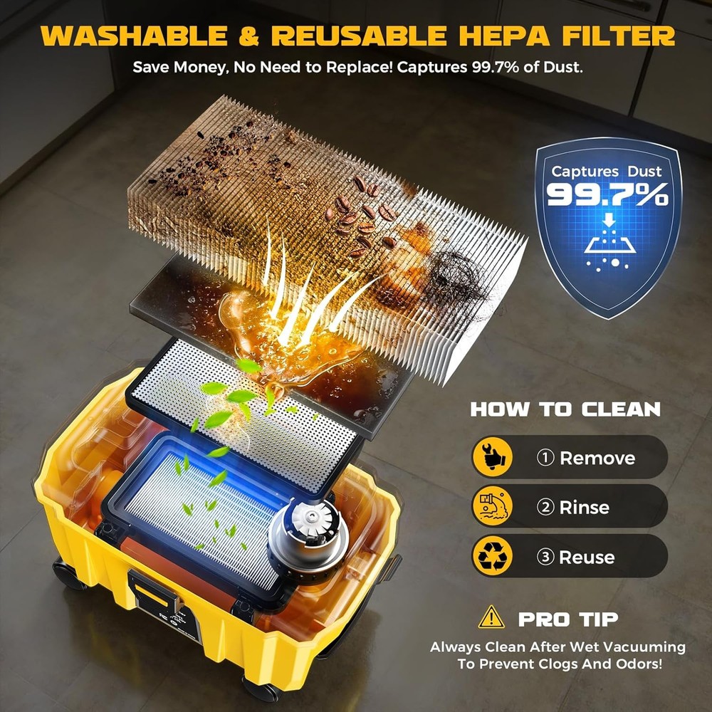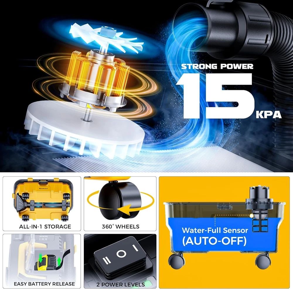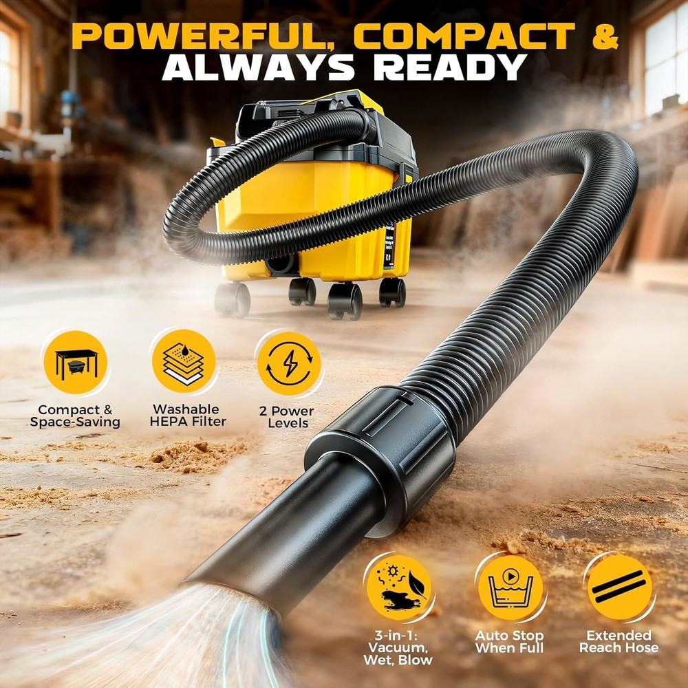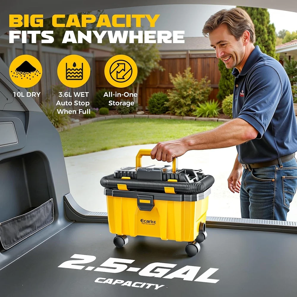 Free eBay listing template designed by dewiso.com Ecarke 2.5 Gal Cordless Wet Dry Vacuum Compatible with DeWalt 20V Battery, 3-in-1 Shop Vac with Washable HEPA & Brushless Motor, 15KPa Suction, 4 Attachments for Garage Car Workshop (Tool Only) FREE AND FAST SHIPPING! About this item 【Significant Savings & Full Compatibility】 Ecarke cordless wet dry vacuum is Compatible with DeWalt 20V Battery (battery & charger not included). For best performance, we recommend using a 4.0Ah or higher capacity battery. It integrates seamlessly into your existing tool collection, eliminating the need for extra batteries. A specially designed battery pull cord makes removal quick and effortless, offering outstanding value and convenience for garage, workshop, and home cleaning 【3-in-1 Versatility: Vacuum, Wet Pickup & Blower】 One tool handles all messes. Use it as a powerful dry debris vacuum, a liquid spill cleaner, or a blower for leaves and dust. This 3-in-1 shop vac is the ultimate all-purpose cleaning solution for your car, garage, and household tasks 【Washable HEPA Filter & Efficient Brushless Motor】 Features a reusable, washable HEPA filter that captures 99.7% of fine dust to protect the motor and ensure clean air. The brushless motor provides stronger 15KPa suction, longer lifespan, and requires less maintenance than traditional motors for reliable heavy-duty cleaning 【Complete Kit: 4 Attachments, Strap & Wheels & Bonus Extension Tubes】 Comes ready for any job with 4 specialized attachments (wide nozzle, crevice tool, sofa brush, round brush), a shoulder strap, and 4 swivel wheels. Includes 2 bonus extension tubes for extra reach. The strap enables hands-free cleaning on stairs or in the car, while the wheels ensure effortless portability and maneuverability. (Tip: For convenient storage, you may keep the extension tubes alongside the main unit.) 【Dual Suction Modes & Long 7ft Reach Hose】 Switch between 9KPa mode for daily cleanups and 15KPa max suction for stubborn dirt and pet hair. The extendable hose (up to 7ft) lets you reach under furniture, into tight corners, and around high shelves without moving the vacuum 【Compact 2.5-Gallon Tank & Auto Shut-Off】 The space-saving upright design stores easily. The 2.5-gallon (10L dry / 3.6L wet) tank handles more between empties. An automatic shut-off sensor stops the motor when the wet tank is full, preventing overflow and ensuring motor safety and protection Product We offer a 30-Day Return Policy on items which you are not completely satisfied with. You have the option for a full-refund or an exchange of the item. No returns are available on items shipped outside of the US . Shipping We offer Free Shipping to the US and ship within 2 business days of payment, usually sooner. We use UPS express shipping. That's why your products are usually delivered within 3 days . Contact We try our very best to make sure every customer is completely satisfied. If there's a problem , message us! We're happy to help. 24/7 live chat available.