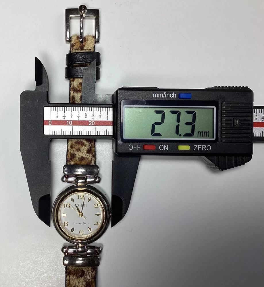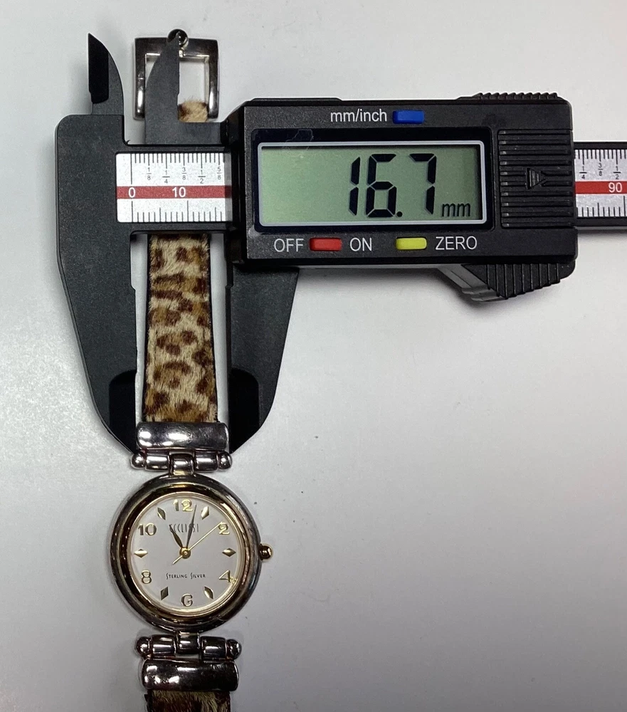 With Original Box/Packaging: No Case Color: Silver Display: Analog Brand: Ecclissi Band Material: Faux Fur, Leather, Sterling Silver Case Material: Sterling Silver Max Wrist Size: 6.76-7 in Seller Notes: “Some band wear.” Closure: Buckle Reference Number: SR626 Case Thickness: 6 mm Caseback: Snap Movement: Quartz Case Finish: Polished Water Resistance: Moisture Resistant Seller Warranty: No Features: 12-Hour Dial, Central Second, Push/Pull Crown Department: Women With Papers: No With Manual/Booklet: No Type: Wristwatch Watch Shape: Round