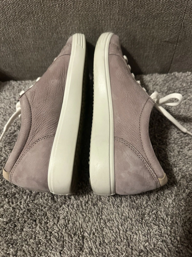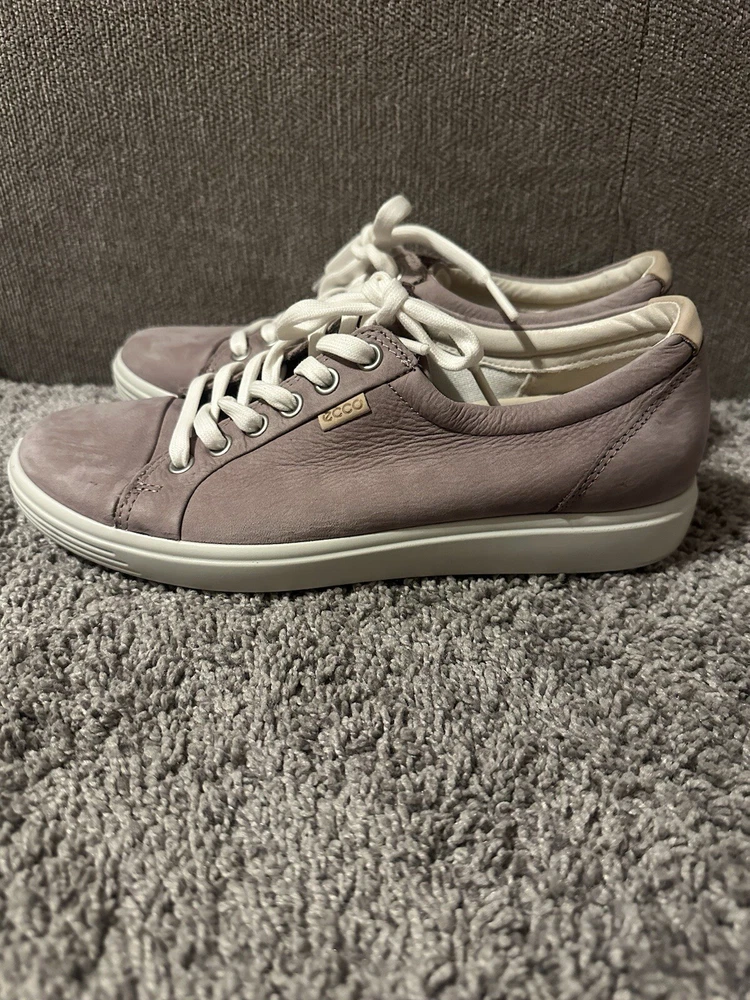 Elevate your athleisure game with these ECCO Women's Lavender Leather Lace Tennis Shoes. The solid pattern and purple color with logo accents add a touch of style to your everyday workout routine. These sneakers are designed with a comfortable cushioned insole and rubber outsole for optimal performance during tennis games or any other athletic activity. The shoes are available in UK size 5.5, US size 7, and EU size 38, with a medium width. The leather upper material and lace-up closure provide a secure fit, while the leather insole ensures added comfort. These sneakers are perfect for women who love to stay active and look great doing it. Preowned Good Condition