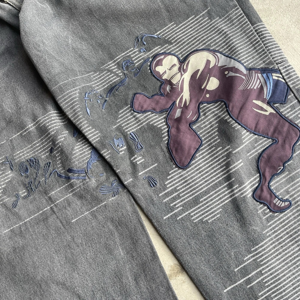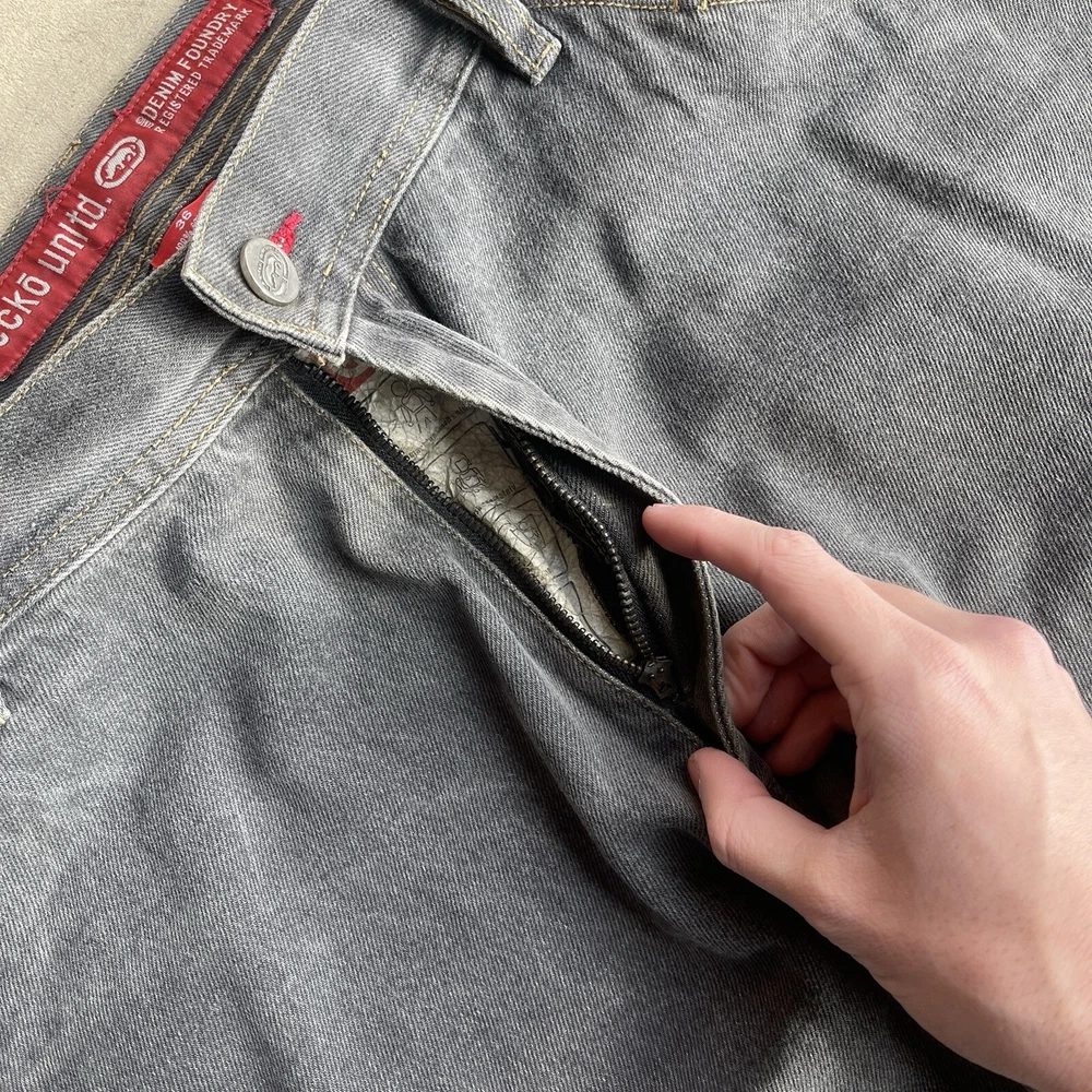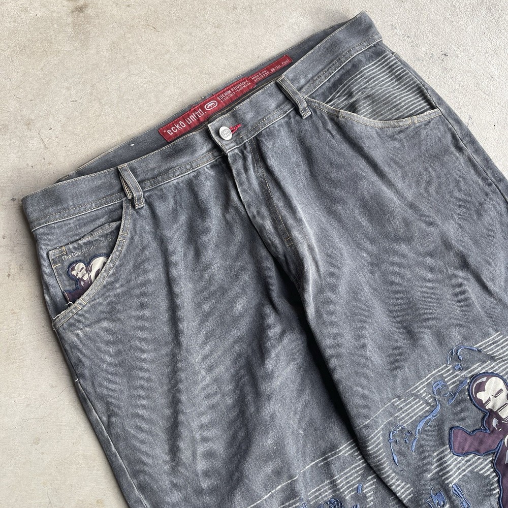 gtin13: n/a UPC: n/a Fabric Type: Denim Accents: Embroidered Type: Jeans Pattern: Graphic Fabric Wash: Dark Department: Men Color: Gray Pocket Type: 5-Pocket Design Garment Care: Machine Washable Inseam: 33 in Vintage: Yes Waist Size: 34 Handmade: No Model: Ecko Unltd x Marvel Season: Fall, Spring, Winter Personalize: No Size Type: Regular Features: Belted, Comfort, Pockets Brand: Ecko Unltd. Material: Cotton Theme: Money, Street Wear, Mavel, Comic Rise: 12.5 Closure: Button, Zip Size: 36 Style: Wide-Leg Fit: Relaxed