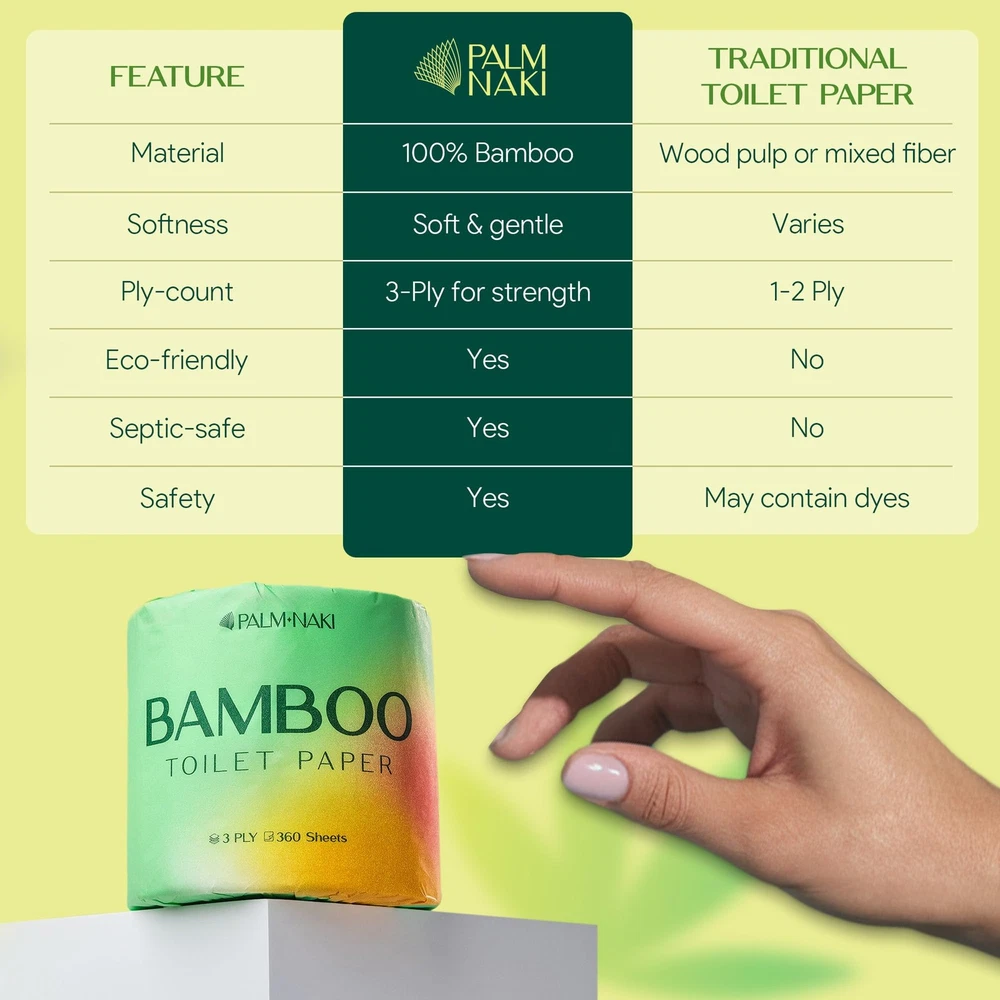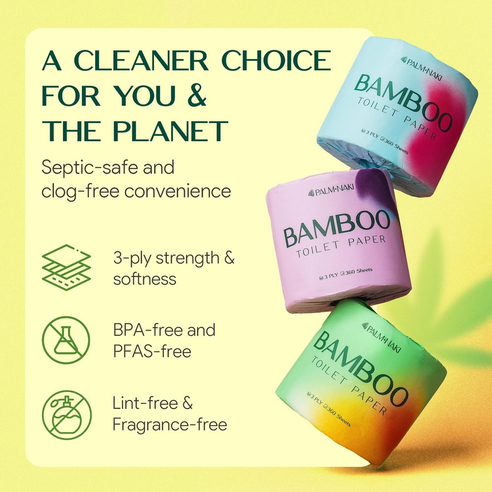 Bamboo Toilet Tissues are made from 100% FSC-certified, sustainably harvested bamboo. These tree-free tissues offer an eco-conscious alternative to traditional toilet paper, responsibly processed for a clean, bright appearance. Choosing bamboo helps reduce deforestation without compromising on quality or function. Free from inks, dyes, lint, BPA, PFAS, and latex, these tissues are designed to be used safely every day. The naturally soft-touch bamboo material creates a gentle tissue, making it suitable for sensitive skin, including babies and those with delicate needs. Each 3-ply sheet is strong and absorbent, yet dissolves quickly and won’t clog pipes, making it a septic-safe and plumbing-friendly choice for any home, RV, boating or camping experience. combines sustainability, safety, and thoughtful design in one clean, dependable toilet tissue solution. Tree-Free: bamboo toilet tissue – Made from bamboo. Biodegradable and sustainable. A tree-free alternative to paper-based toilet tissue Stronger: Bamboo is renowned for its strength and tear resistance. Absorbent 3-ply bamboo tissue is more durable than regular toilet tissue Pure: Free from inks, dyes, BPA and PFAS for an all natural experience. Every wipe feels clean and fresh, with no lint, dust, or residue left behind Comfort: 100% Bamboo tissue are gentle on your skin and soft to the touch, particularly for sensitive feminine areas Rapid Dissolving: Bamboo dissolves quickly and easily and is safe for all septic systems, especially good for RVs, camping and boating