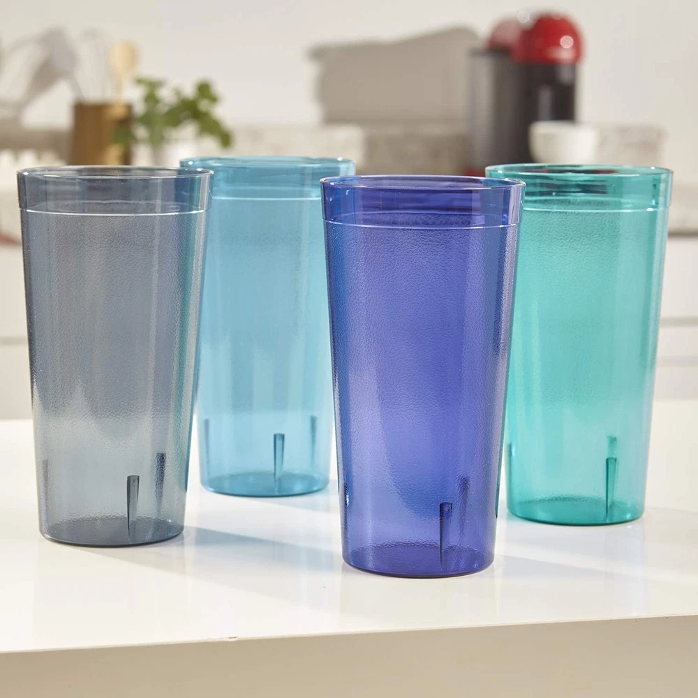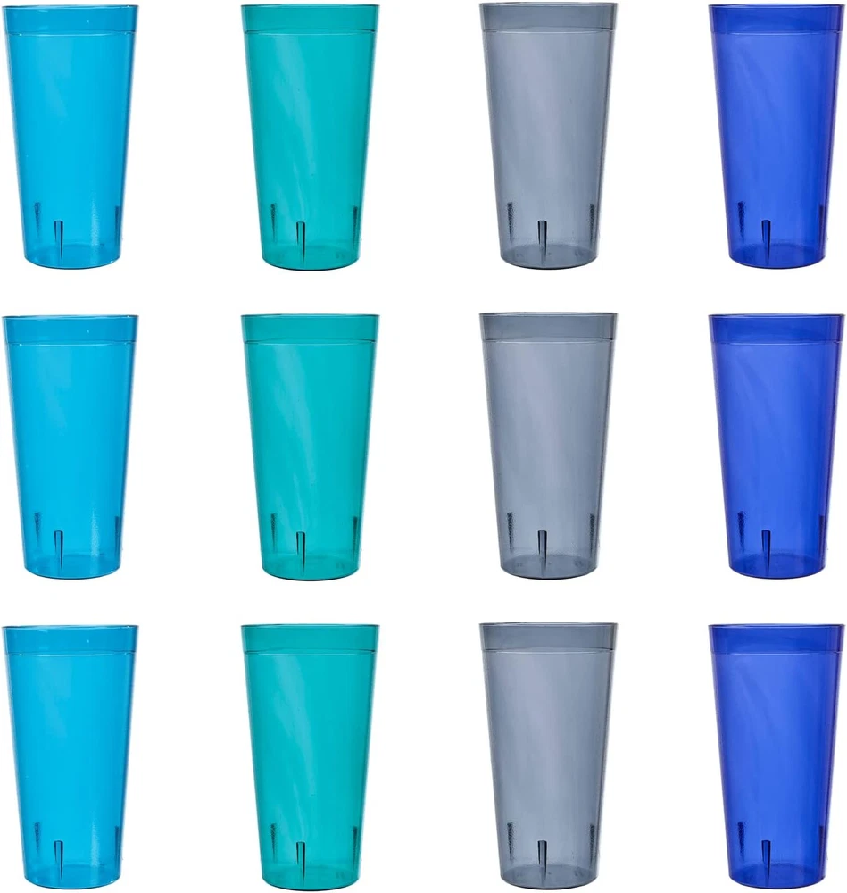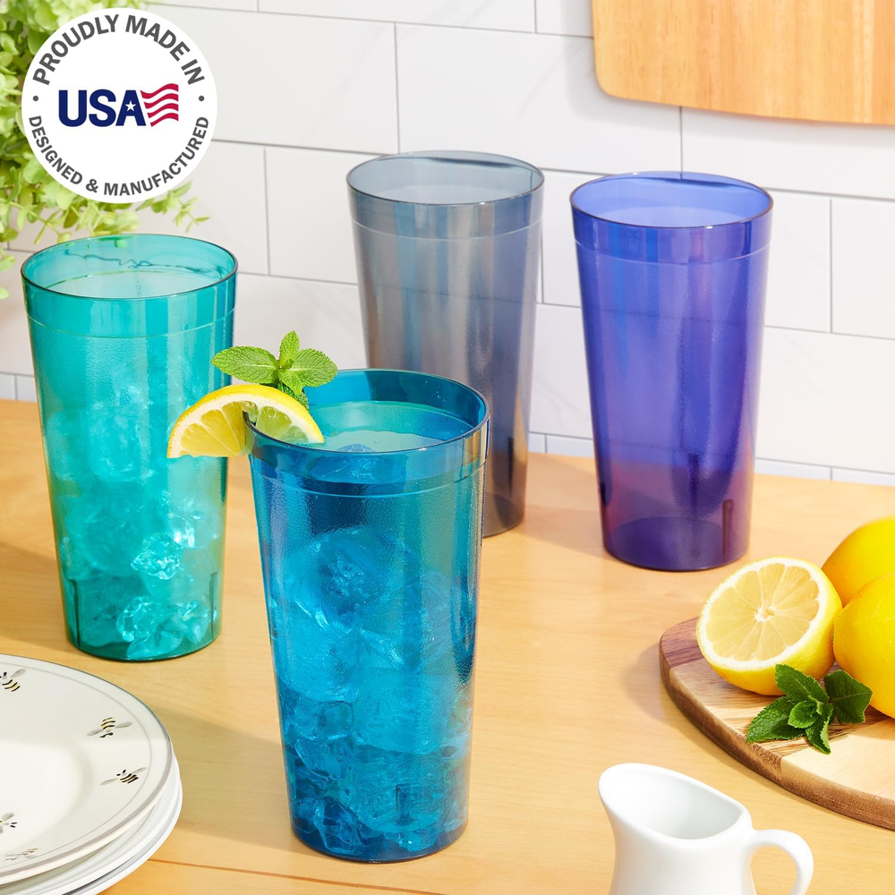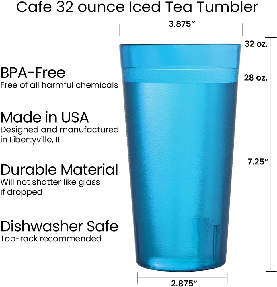 Enjoy everyday drinks with confidence using our American-made stackable tumblers, a set of 12 32-ounce glasses designed for your convenience. Crafted from BPA-free plastic, these cups ensure safety without compromising quality, making them ideal for both indoor and outdoor use. These cups feature a smooth top edge for easy sipping, a classic textured wall design and a lightweight build, our tumblers offer both style and practicality for any occasion. This design will add an updated look to your kitchen aesthetic and easily stacks to save space on cabinet shelves. Say goodbye to worries about breakage with our shatter-resistant tumblers, perfect for parties, family gatherings, and outdoor events. This classic style plastic glass set is a great addition to any college dorm room, first apartment, rv, and camper. Consider adding these as a wedding registry gift for a new household. Stackable and dishwasher safe, these tumblers are designed for easy storage and cleanup, adding convenience to your daily routine. Entertain outdoors at the patio, pool, or hot tub with these durable and shatterproof pieces. The 32oz cup (3.88" diameter x 7.25" tall) in coastal colors (indigo blue, teal, aqua, and grey) is versatile and suitable for any drinkware need. Product Description Elevate Your Drinkware Experience Enjoy the convenience and durability of our American-made plastic tumblers, perfect for everyday use or special occasions. Shatterproof and dishwasher-safe, these versatile glasses are a must-have for any home. Everyday dining made simple with Cafe Tumblers Clear Material and Bold Colors Discover the brilliance of US Acrylic’s Cafe tumblers, made in the USA. Featuring textured walls and a smooth rounded top, these timeless tumblers offer style and stability for any occasion. Enhance your drinkware collection with their premium quality and versatile design. Shatter-Proof and Break Resistant US Acrylic’s Cafe tumblers are made from durable, break-resistant materials that won’t shatter across the room like glass. Perfect for families, outdoor events, and everyday use, they combine lasting quality with peace of mind. Enjoy stylish drinkware for any occasion. Ideal for Outdoor Dining Elevate your outdoor gatherings with US Acrylic's Cafe tumblers, perfect for patio dining and poolside drinks. Crafted for durability, these break-resistant tumblers are ideal for summer barbecues, picnics, and more. Enjoy stylish drinkware designed to handle outdoor fun. Top-Rack Dishwasher Safe US Acrylic's Cafe tumblers are top-rack dishwasher safe for easy cleaning, but for best results, hand washing is recommended. Avoid placing them on the bottom rack, as high heat can compromise their durability. Keep your tumblers crystal clear and long-lasting with proper care. Get to know US Acrylic Over 40 years of experience US Acrylic started as a small family-owned business in Illinois, making small gift items by hand, and supporting other small family-owned gift shops. Today, while we have grown, we still remain family-owned, maintain the same family values, remain in Illinois continuing to support and invest in our community. We proudly make all of our products right here in Libertyville, Illinois and remain committed to offering you quality products Made in USA. The video showcases the product in use. The video guides you through product setup. The video compares multiple products. The video shows the product being unpacked. About US Acrylic Merchant Video Learn about US Acrylic Tumblers Sizes Available Water (20oz), Iced-tea (32oz) Sizes Available Juice (8oz), Rocks (14oz), Water (20oz), Multi-size (14oz/20oz) Sizes Available Rocks (12oz), Water (16oz), Iced-tea (24oz), Multi-size (12oz/16oz) Are they stackable? Yes, easily stackable Are they stackable? Not designed to be stacked Are they stackable? Not designed to be stacked Made in USA? Yes, factory located in Illinois Made in USA? Yes, factory located in Illinois Made in USA? Yes, factory located in Illinois