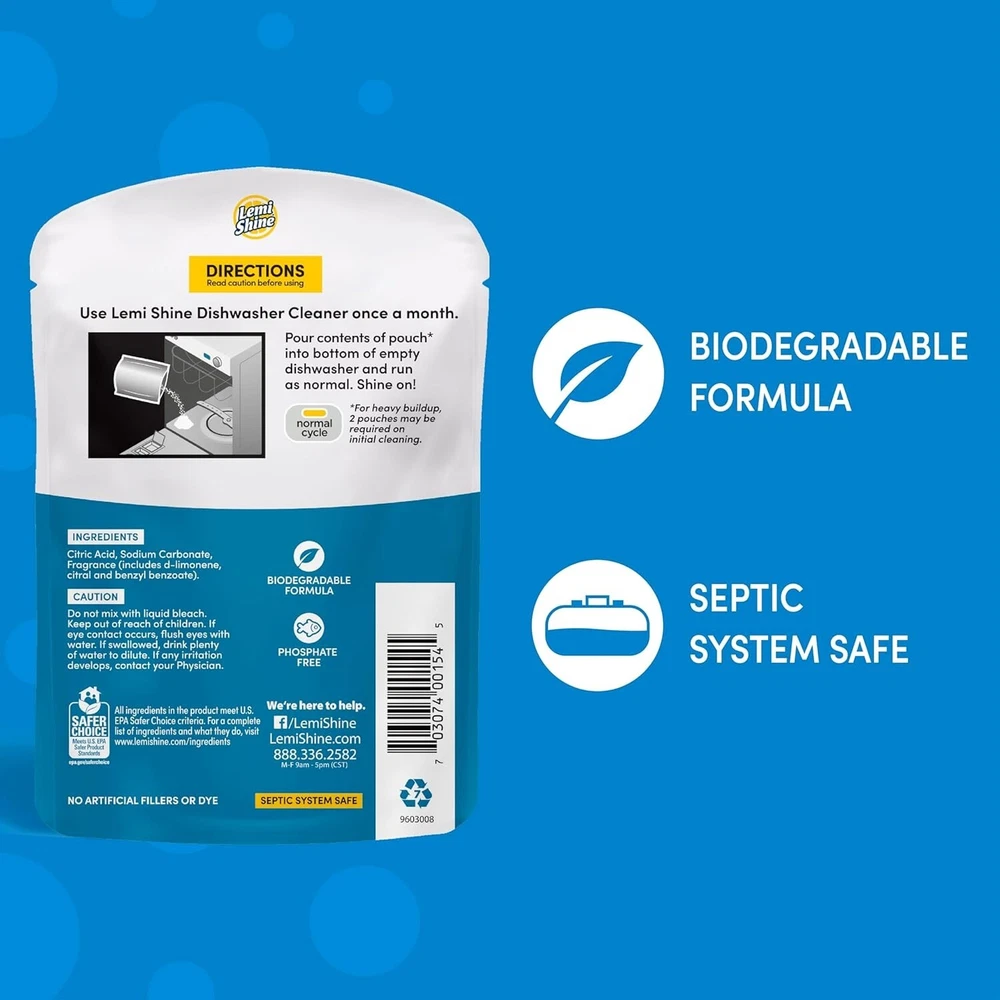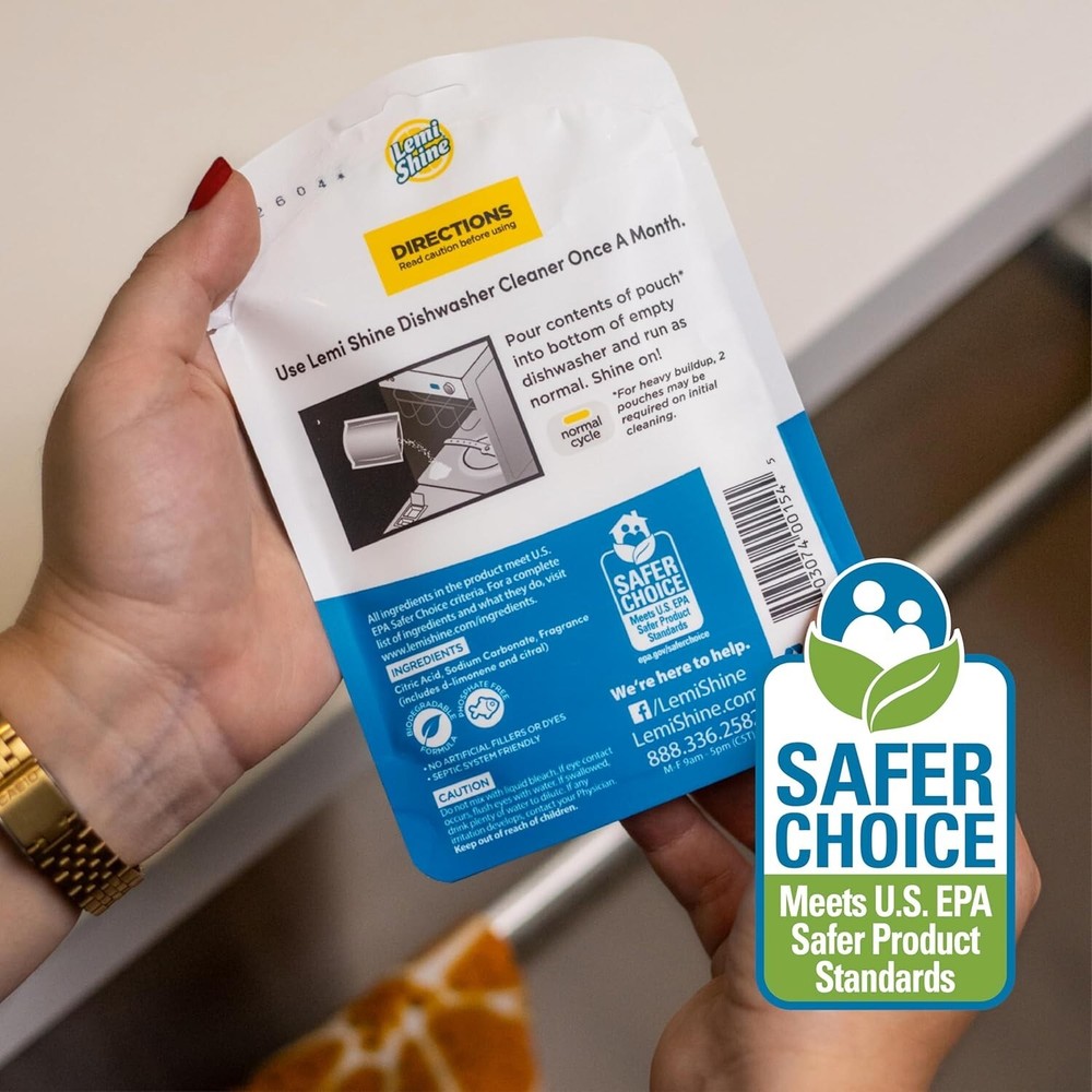 About this item PROUD EPA SAFER CHOICE PARTNER: We’re proud to be named a Safer Choice Partner by The United States Environmental Protection Agency (EPA). At Lemi Shine, it’s not just about a spotless home—it’s about keeping you, your family, and the planet safe. We got your back! Item Form Powder Scent Lemon Specific Uses For Product Dishwasher Cleaning Material Feature Biobased Product Dimensions : 0.65 x 4.25 x 5.7 inches; 1.45 ounces Department : Unisex-Adult Product Description Why We Use Citric Acid All our formulas use powerful citric acid to fight germs, grime, hard water buildup, and the gunk that lets germs grow back! So Clean You Can Smell It That fresh lemony scent isn’t just for show. It’s our active ingredient—citric extracts (aka citric acid)! With Lemi Shine, you get a clean so powerful you can smell it working. Winner of Parents Best Green Cleaners 2021 Our Dishwasher Cleaner's award-winning formula uses natural citric acid to restore your machine's performance. Cleaner Clean If an ingredient isn’t safe, we don’t go near it. Simple as that. When you clean with Lemi Shine, you can be confident that what you’re using is safe around little hands and little paws. Award Winning Formulas Not to brag, but our products win awards! Our Toilet Bowl Cleaner won the 2020 Green Pick Award by Parents Magazine, and Bustle named Lemi Shine as one of the best Dishwasher Cleaners in 2020. Founded and Made in the USA It started in rural west Texas, where a little known brand grew into a full line of cleaning products that are safe, effective, and affordable. Lemi Shine products are made in the USA to this day!