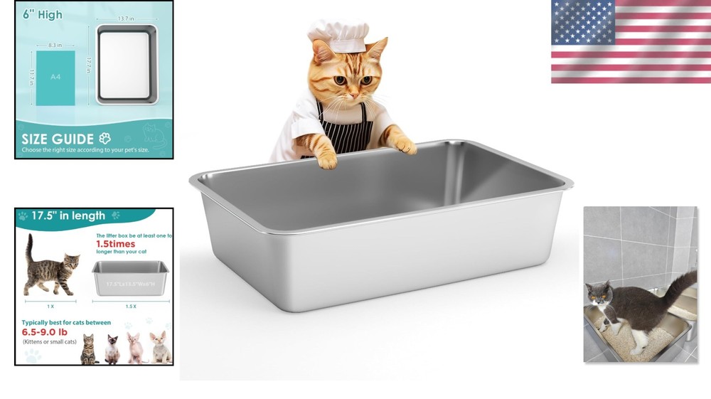 Eco-Friendly Stainless Steel Litter Box for Kittens and Cats – Easy Odor Control ‹ › ‹ › ‹ › ‹ › ‹ › ‹ › ‹ › ‹ › ‹ › ‹ › Eco-Friendly Stainless Steel Litter Box for Kittens and Cats Introducing the ultimate in comfort and hygiene for your beloved feline companions. Our Eco-Friendly Stainless Steel Litter Box is designed to provide an odor-free, safe, and easy-to-clean environment for both kittens and small cats. Product Features: Made from high-quality, durable stainless steel that is rustproof and scratchproof. Dimensions: 17.5" Length x 13.5" Width x 6" Height (45cm x 35cm x 15cm), perfect for kittens and small cats weighing 6.5 to 9 pounds. High sides to keep litter from scattering and reduce clean-up efforts. Non-stick surface for effortless cleaning; litter doesn’t stick to the bottom. Rubber padded feet on each corner for a non-slip experience and protection of your floors from scratches. Rounded corners and no sharp edges for safe handling. Benefits: Eco-friendly and long-lasting construction. Easy to maintain an odor-free environment. Suitable not only for cats, but also for small pets like rabbits and hamsters. Simple design allows for easy lifting and safety for both you and your pets. Creates a happy space for your pets, leading to a happier life for you. Why Choose Our Eco-Friendly Stainless Steel Litter Box? Make the switch to a cleaner, more sustainable, and stylish option for your kitty. With its durable design and easy-to-clean properties, our litter box is a fantastic investment for your pet’s well-being. Each litter box ensures minimal mess, quick cleaning, and maximum comfort for your furry friends. Order yours today and join the revolution of pet care that prioritizes health, comfort, and sustainability! Shipping Free & Fast Shipping - We offer free shipping to most of the USA with a normal delivery time of 3-7 days. However, due to the current situation, additional delivery time (up to 3 weeks) may be required for some items. Alternative Carriers - We may use alternative carriers (e.g. USPS, FedEx, UPS, etc.) to ensure your package arrives safely and on time. Due to the use of multiple carriers, we are unable to provide a tracking number automatically. Handling Time - Orders are processed and shipped within 1-2 business days of receiving cleared payment. Shipping Restrictions - Shipping to Alaska, Hawaii, Puerto Rico, Guam, and other US territories may incur shipping charges or delivery restrictions. Please contact us before ordering, or your order can be refunded/cancelled. State Restrictions - There may be restrictions based on your state of purchase. For example, certain items may not be shipped to California due to state regulations. Contact for Tracking Updates - If you require tracking updates or have any concerns about the delivery of your order, please feel free to contact us, and we will be happy to assist you. Return 30-Day Hassle-Free Returns - We want you to be completely satisfied with your purchase. If you are not, you can return the item within 30 days of receiving it for a full refund or exchange. Easy Return Process - To start a return, simply contact us and we will provide you with a prepaid return shipping label and detailed instructions. Restocking Fee - There are no restocking fees for returns. However, the buyer is responsible for return shipping costs if the return is not due to a seller's error. Refund Processing Time - Refunds will be processed within 5 business days of receiving the returned item in its condition. Payment We accept all major credit cards, PayPal, and Apple Pay for your convenience. Your payment information is secure and encrypted to ensure a safe and seamless transaction. Please complete your payment within 3 days of purchase to avoid any delays in shipping. Feedback Your feedback is extremely important to us. We strive to provide the best products and customer service possible. If you are satisfied with your purchase, please take a moment to leave us a positive review. If you have any concerns or issues with your order, please contact us before leaving negative feedback. We are committed to resolving any problems and ensuring your satisfaction. Contact Us If you have any questions or concerns, please feel free to out to our customer support team. You can contact us through the eBay messaging system. We are available Monday to Friday, 9:00 am to 5:00 pm EST, and we will do our best to respond to your inquiry within 24 hours. Buy it now and enjoy a pleasant shopping experience! Unit Quantity: 1 count Type: Litter Box