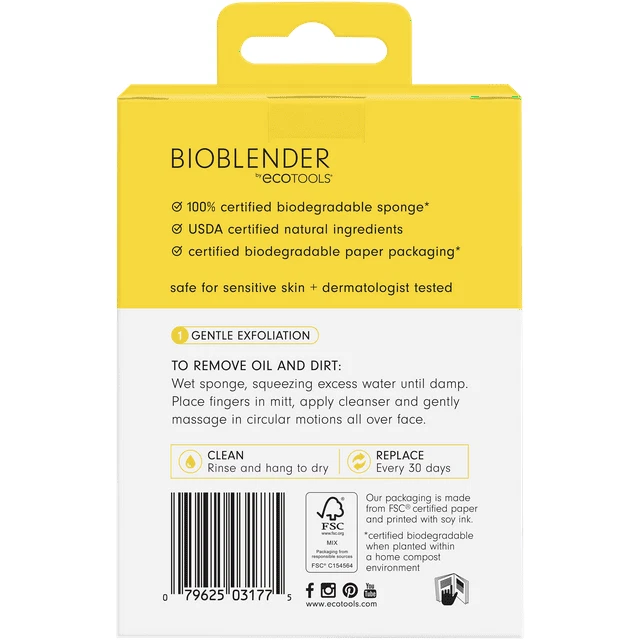 Introducing the World's First biodegradable facial cleansing sponge. The EcoTools BioBlender Facial Cleansing Sponge is made with 5 earth friendly ingredients so you can get that flawless, glowing look without the added waste. Specially formulated material and a unique mitt shape for a more controlled cleanse. Best used with facial cleansers. Safe for sensitive skin and dermatologist tested. World's first certified biodegradable Facial Cleansing Sponge made using only 5 ingredients (water, corn, bionanopol*, natural preservative, and natural pigment) *Bionanopol is the secret ingredient that makes BioBlender biodegradable and compostable! Specially formulated porous material that is perfect for exfoliation and a daily cleanse Safe for sensitive skin, dermatologist tested USDA certified, biobased, vegan, and cruelty free FSC certified, biodegradable paper packaging printed with soy ink