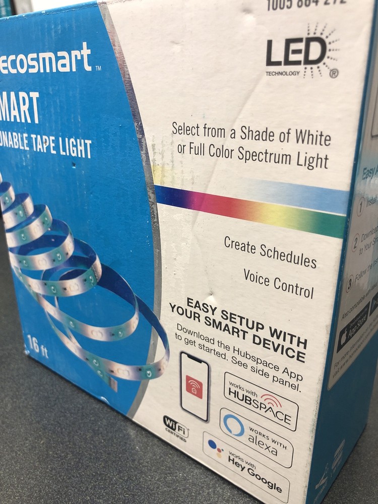Enhance your home's ambiance with the Ecosmart Smart RGB and Tunable Tape Light White 16' 1005864272. This LED tape light offers a range of color options and brightness levels, making it perfect for any indoor space. The light is easy to install and comes with a manufacturer part number of 1005864272. Experience the benefits of smart lighting with the Ecosmart Smart 1005864272 model. This tape light is ideal for homeowners who want to add a touch of elegance to their living spaces. Get your hands on this high-quality product and transform your home today! Please refer to the pictures for the best details of the exact item you are receiving. Photos are NOT stock photos!
