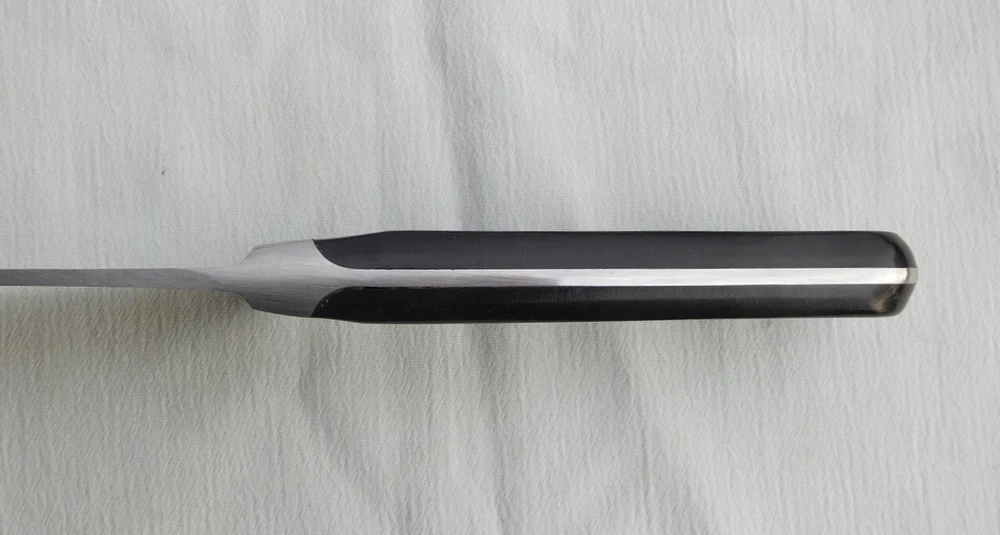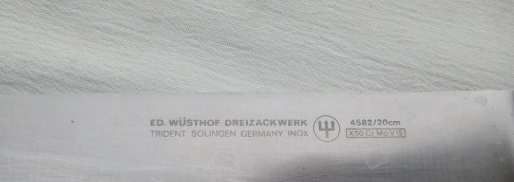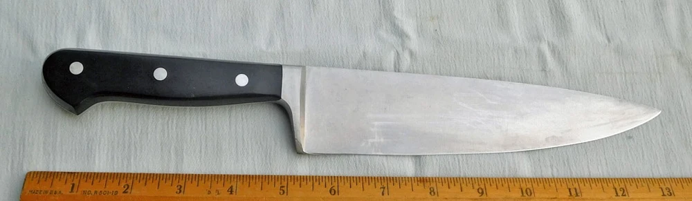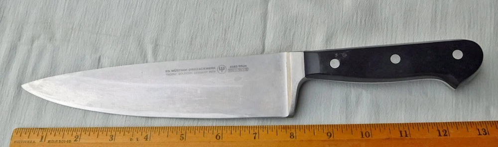 I will combine shipping on multiple wins. Please allow me time after an auction ends to figure the total amount, or you may contact me to request a total once you are all done. Superior kitchen knife made by Wüsthof, classic design before they made lesser knives and had to label their high end knives as "Classic." Knife has a stainless steel blade, fully forged with integral guard and tang. Black composition handles attached to tang with pewter rivets. It has been used, has some scratches on blade, cleaned, recently re-sharpened and ready to use. See pictures. Blade etched " ED. WÜSTHOF DREIZACKWERK / TRIDENT SOLINGEN GERMANY" on one side of trident logo, and "4582/20cm / X50 Cr Mo V15" in box on opposite side. M easures 13" overall, 8" from tip to front of guard/bolster area. Contact me if you have any questions or concerns. Thanks for looking, and good luck! Note: Payment required within 3 days of auction ends or eBay will begin an Unpaid Item case. Note to bidders outside of U.S. - I now use eBay's Global Shipping service to provide the best chance of getting your item to you safely. Please note that I will not be responsible if your package does not arrive for any reason, and I cannot provide any information once it has been shipped. I will not offer a refund for non-delivery. Please keep this in mind when you bid. Thank you very much.