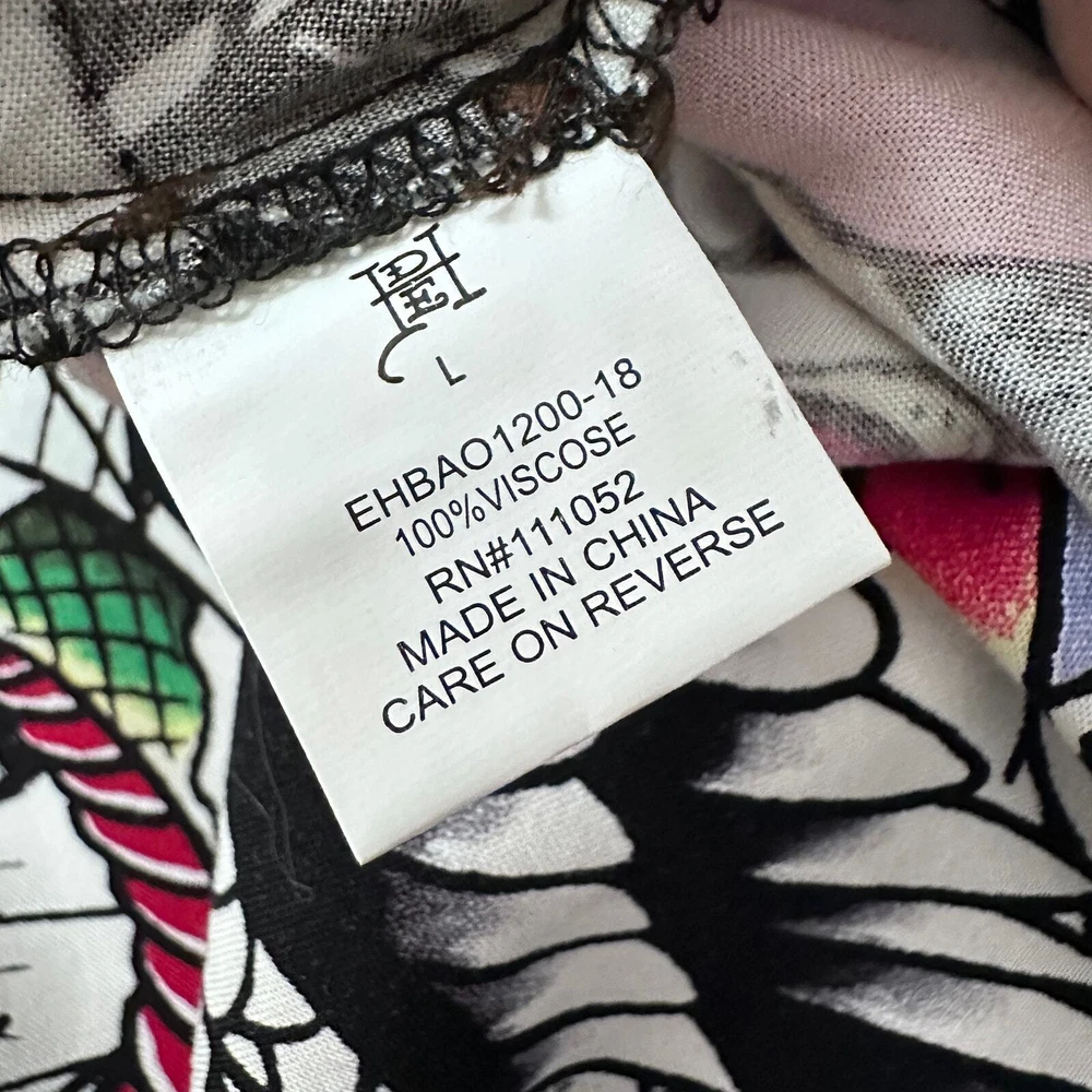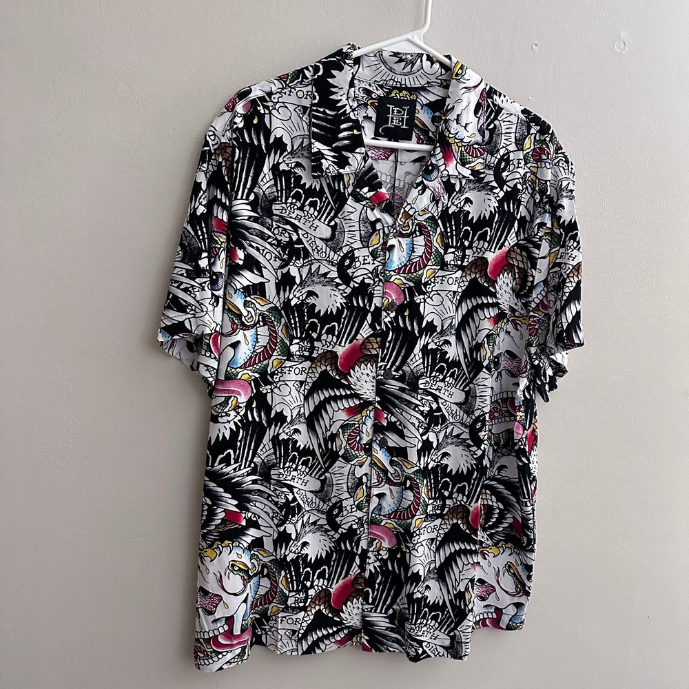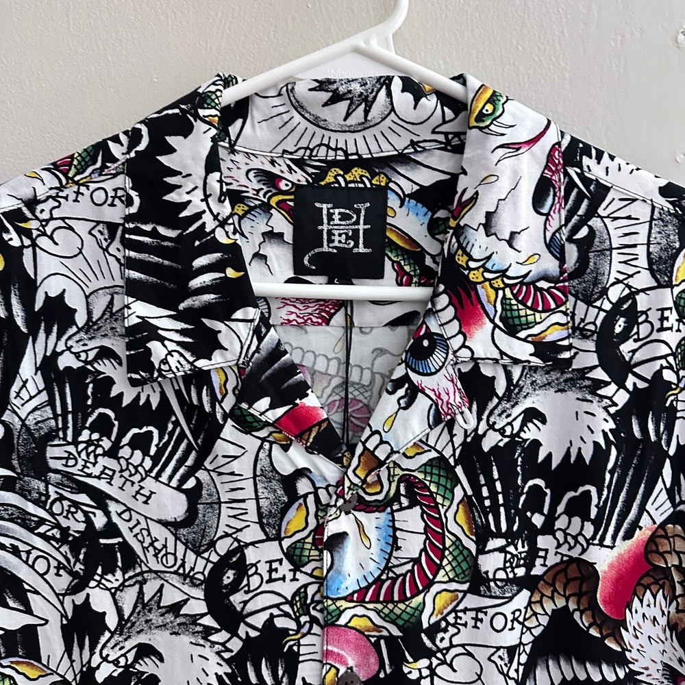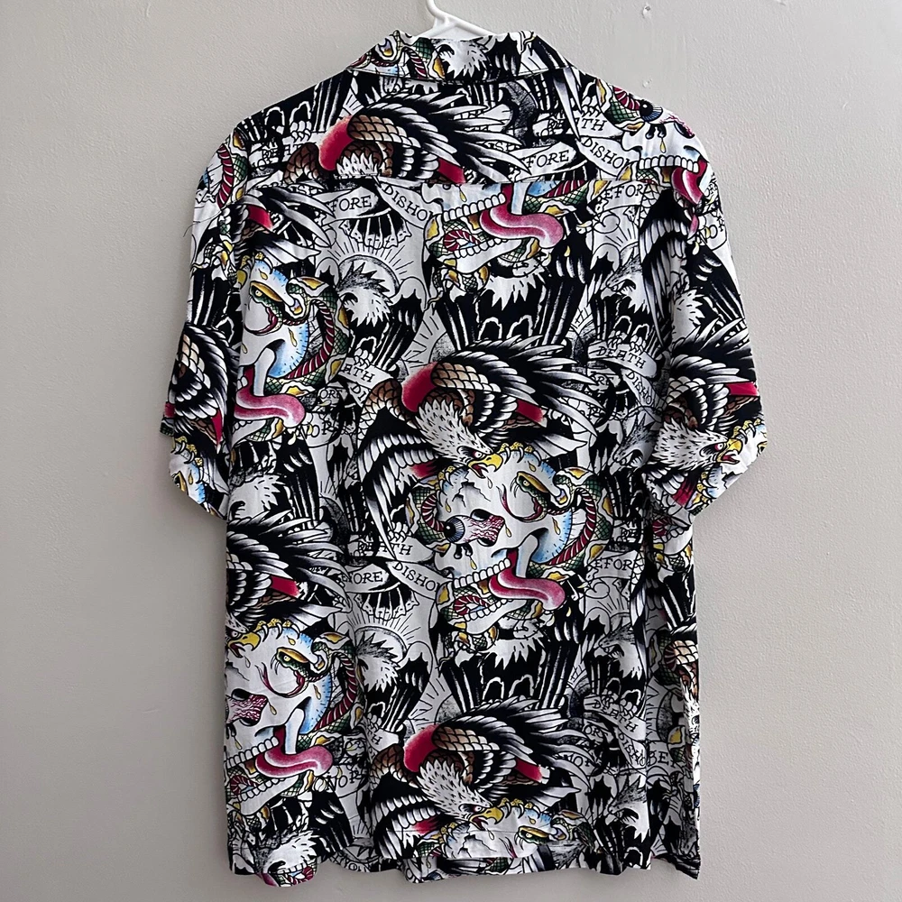 Ed Hardy Battle Skull Tattoo Art Print Camp Shirt Button Up Mens LARGE Short Sleeve. Size: LARGE Approx. measurements: 22" across (pit to pit), 30" long (shoulder to hem) Condition: Pre-loved and in gently used condition. Light wear. no stains, rips, or holes. - see all pics for any wear/condition Actual colors may vary. We do our best to ensure that our photos are as true to color as possible. However, due to photographic lighting sources, inconsistencies of various monitors settings, we cannot guarantee that the color you see accurately portrays the true color of the product. tattoo, skater, casual, skateboard, retro, y2k