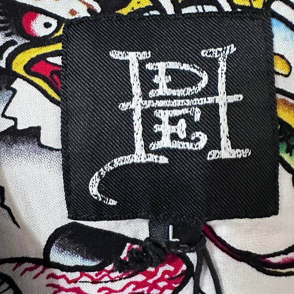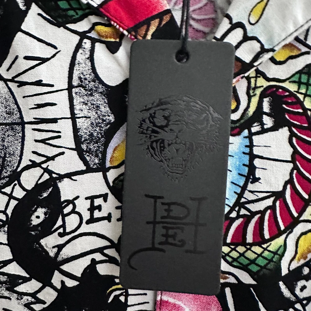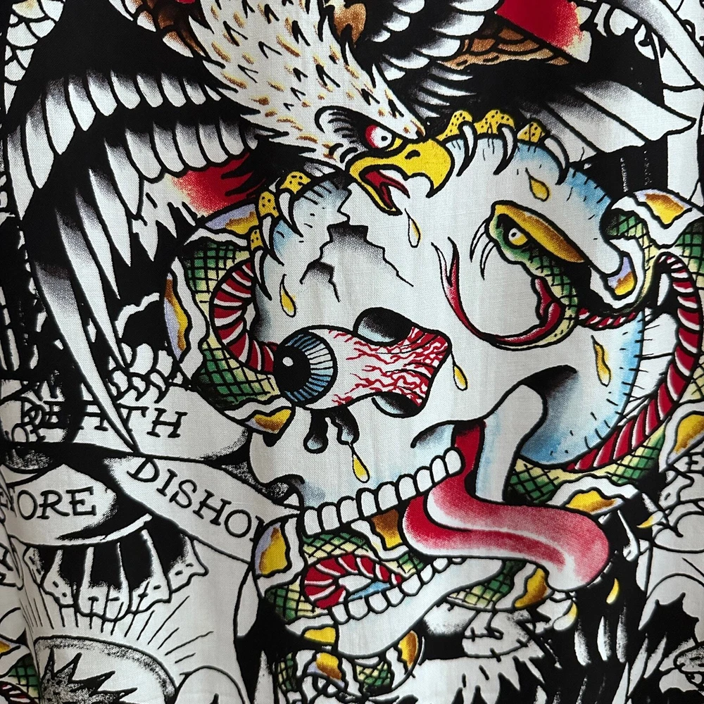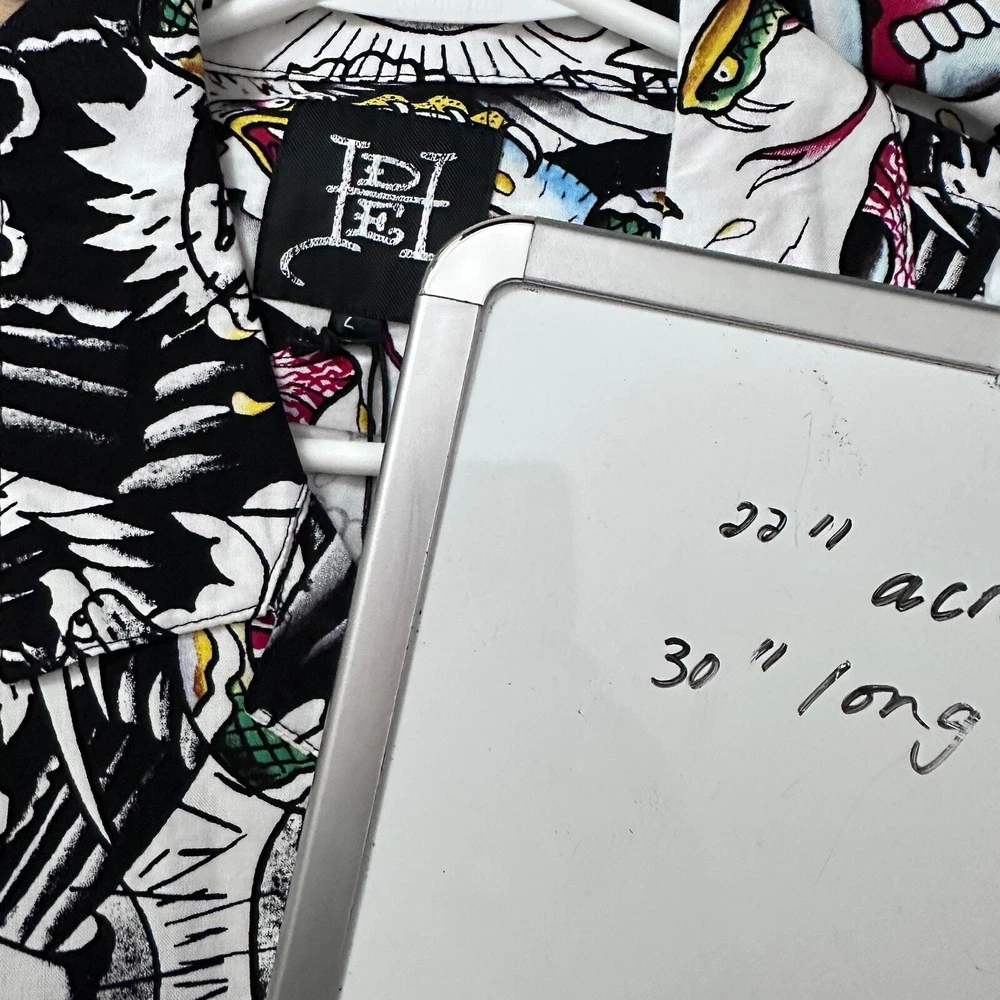 Ed Hardy Battle Skull Tattoo Art Print Camp Shirt Button Up Mens LARGE Short Sleeve. Size: LARGE Approx. measurements: 22" across (pit to pit), 30" long (shoulder to hem) Condition: Pre-loved and in gently used condition. Light wear. no stains, rips, or holes. - see all pics for any wear/condition Actual colors may vary. We do our best to ensure that our photos are as true to color as possible. However, due to photographic lighting sources, inconsistencies of various monitors settings, we cannot guarantee that the color you see accurately portrays the true color of the product. tattoo, skater, casual, skateboard, retro, y2k