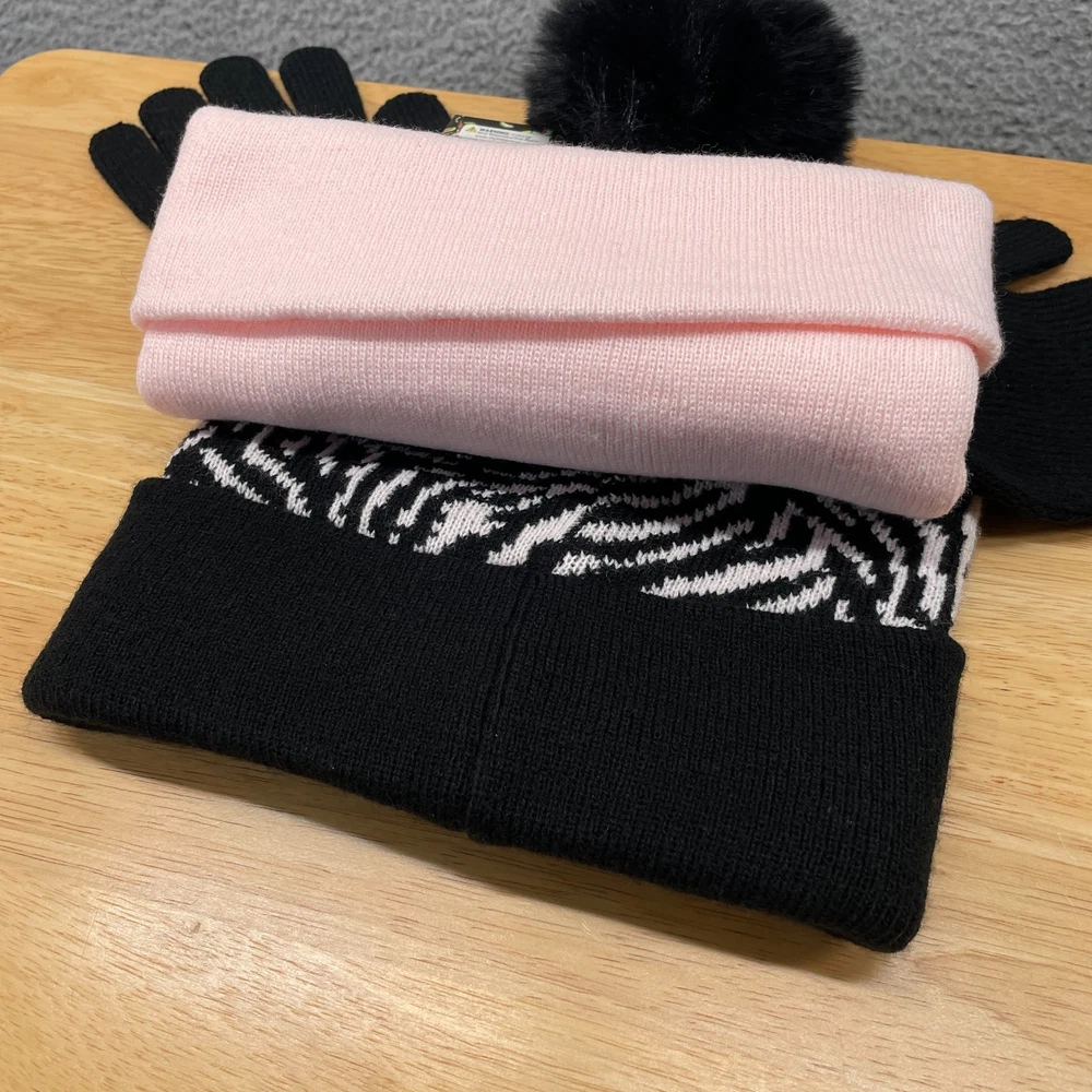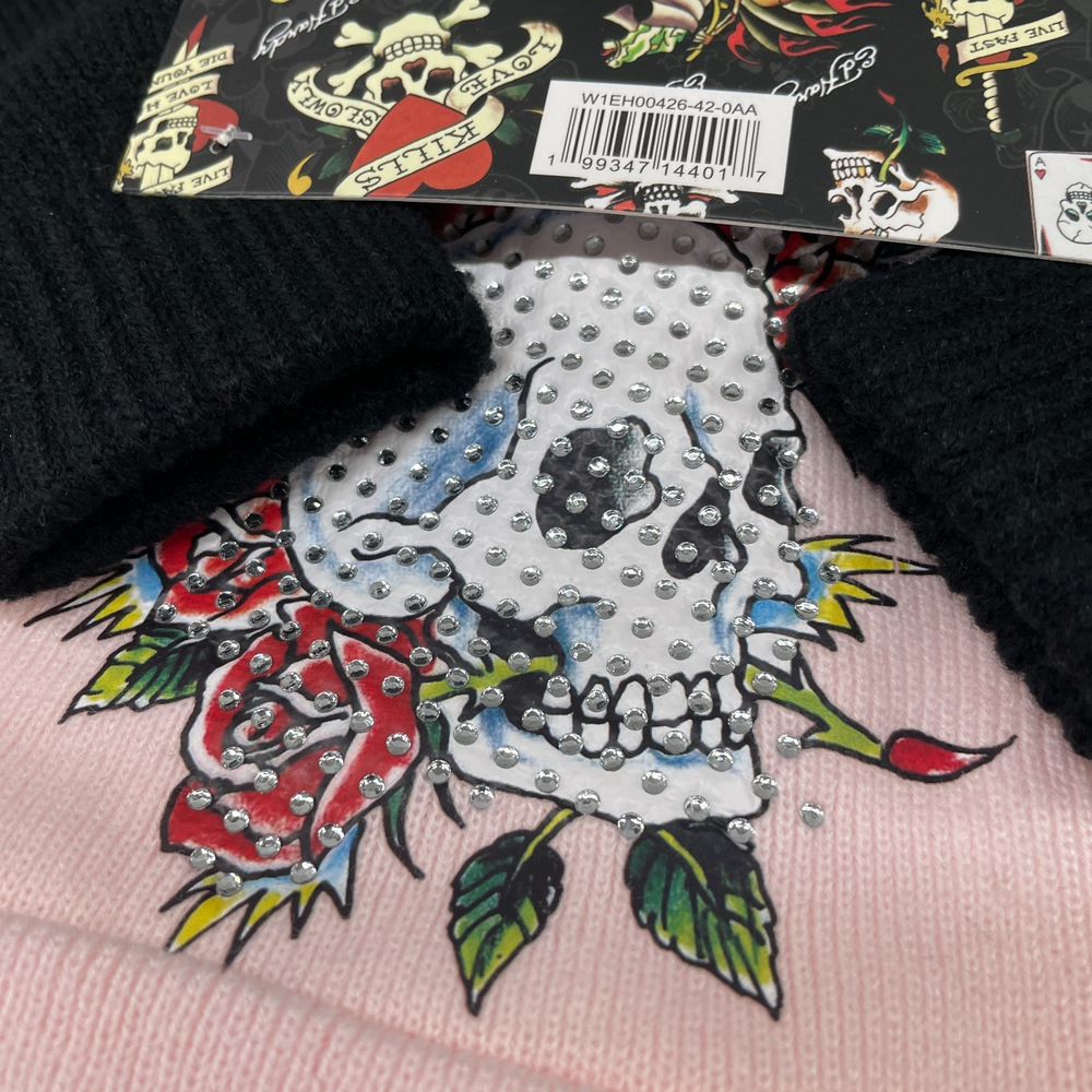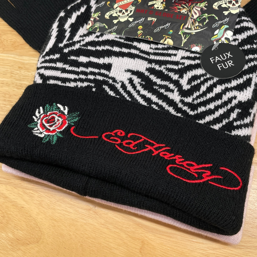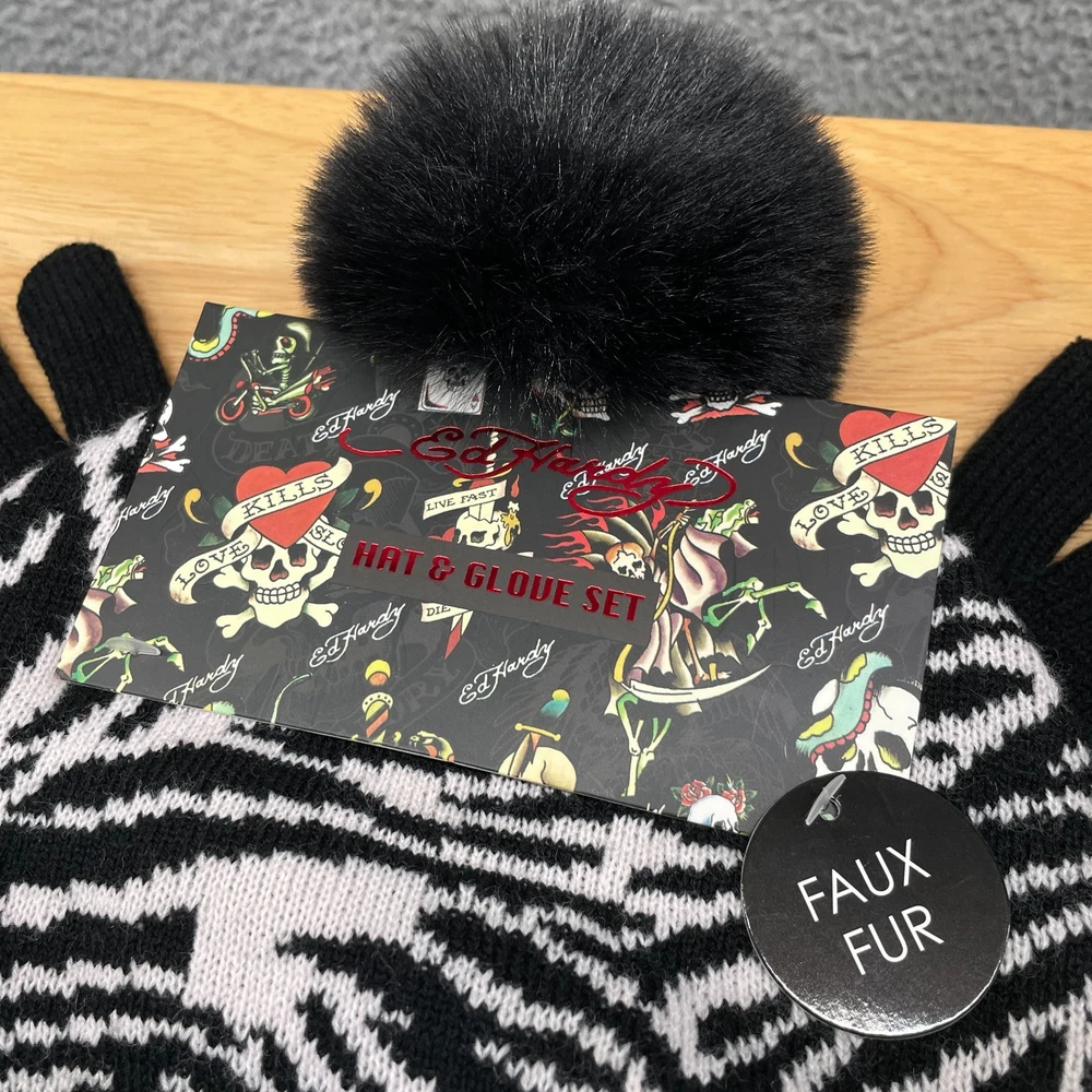 Ed Hardy Beanie Hat Gloves Set Zebra Pink Skull Rhinestone Faux Fur Pom Pom Lot