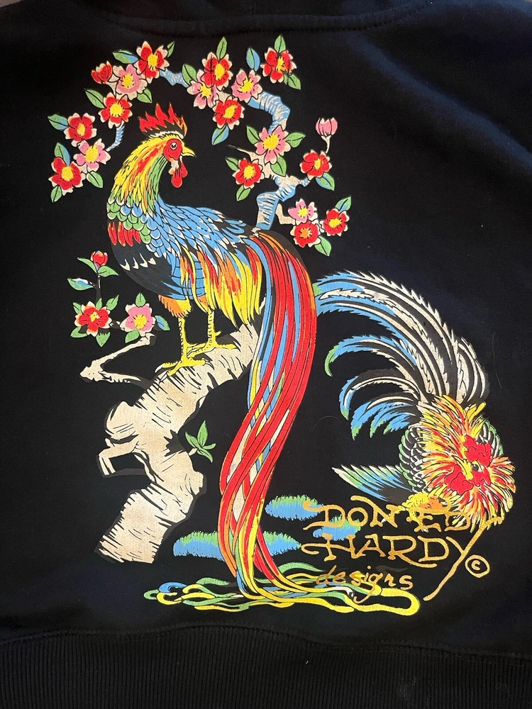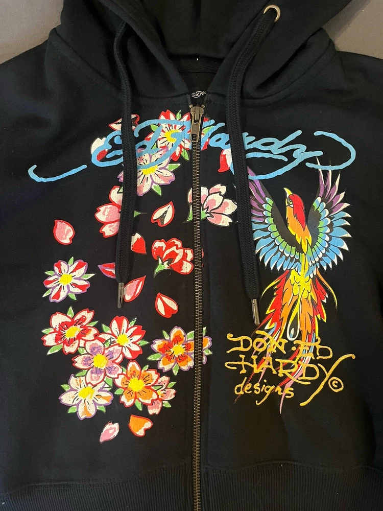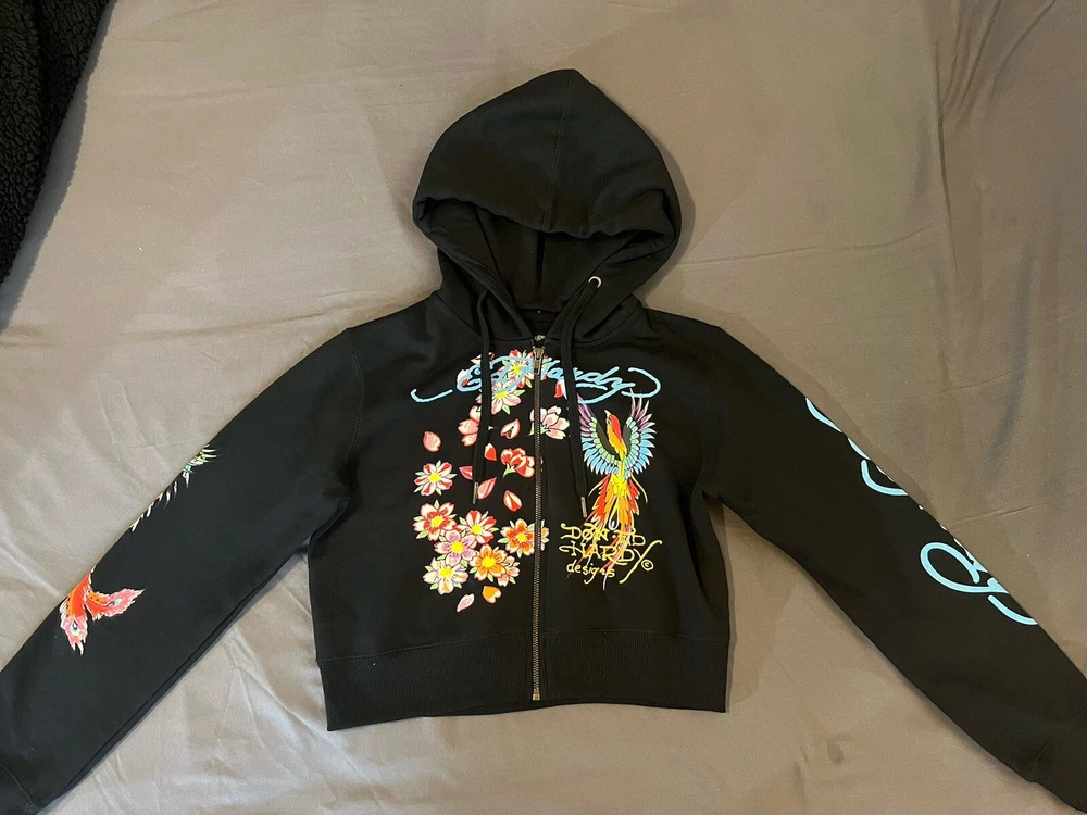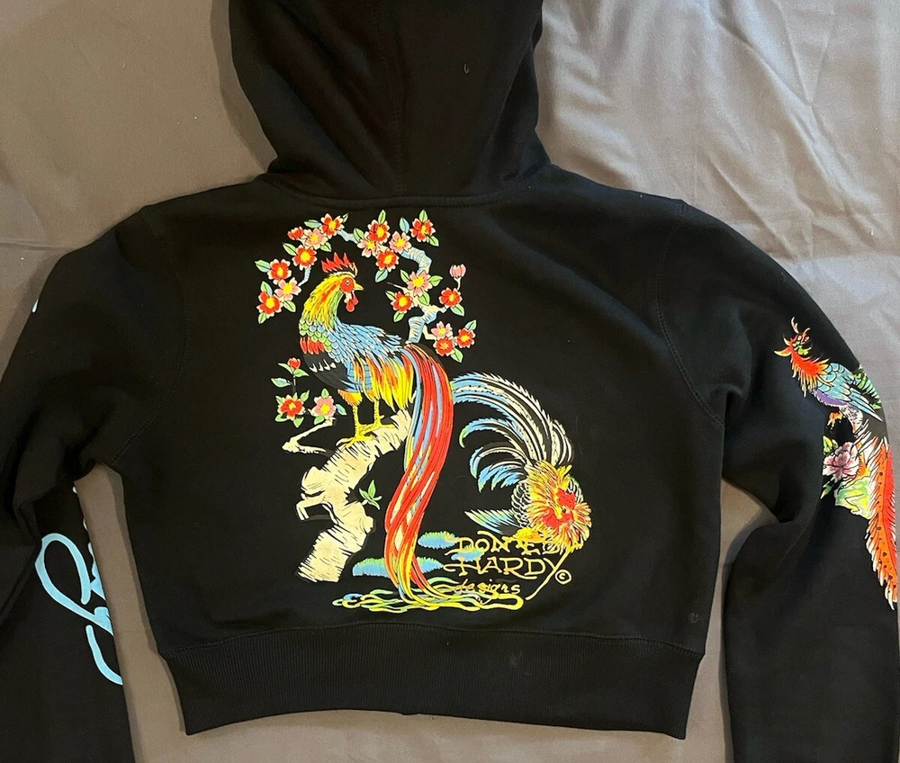 Elevate your style with this Ed Hardy Phoenix cropped jacket, perfect for any fashion-forward woman. The black color and Y2K design make it a statement piece that will turn heads. The jacket features a zip-up closure and is made from high-quality materials to ensure long-lasting wear. The brand, Ed Hardy, is known for its unique designs and this jacket is no exception. It is ideal for those who want to stand out from the crowd and make a statement. Whether you're going out with friends or running errands, this jacket is a great addition to any outfit.