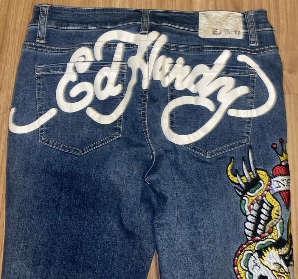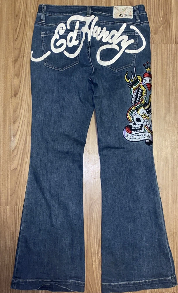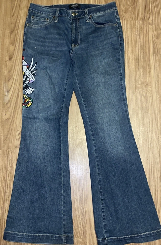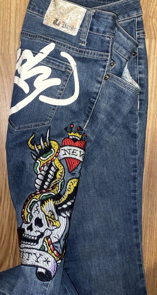 Ed Hardy Jeans Adult 30 Blue Denim New York City Eagle Embroidered Mens. These Ed Hardy jeans are perfect for any man who loves to show off his unique style. The bold embroidery of the New York City Eagle on the back of the jeans makes them a statement piece. The wide-leg style and denim fabric make them comfortable and versatile for any occasion. These jeans are perfect for a casual day out or a night on the town. The regular size type and 32-inch inseam ensure a great fit for any man. Add these jeans to your wardrobe and show off your love for Ed Hardy and New York City. Sold as is in pictures 30/32