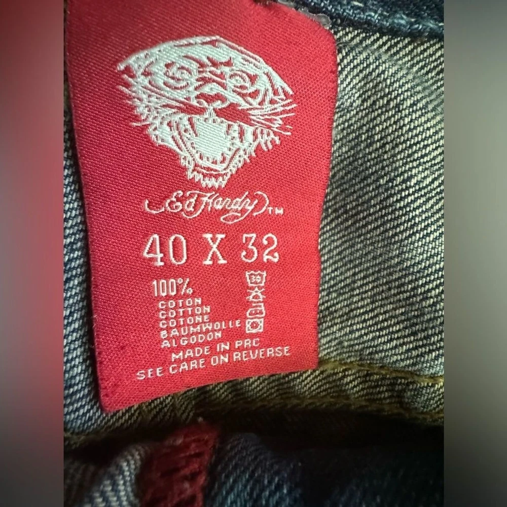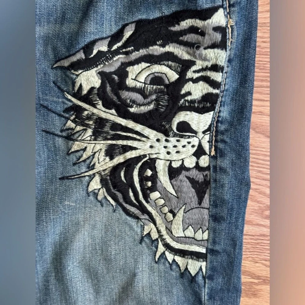 Ed Hardy Jeans Men’s Size 40 X 32 Button Fly Embroidered Tiger Y2K Vintage Super cool vintage Ed Hardy jeans with distinctive tiger embroidery on the sides. Embroidery has some loose threads from wash and wear and have some raggedness at the bottom hem. These jeans have been washed to ensure they arrive in your home fresh and clean. I consider serious reasonable offers. This item ships from the Midwest.